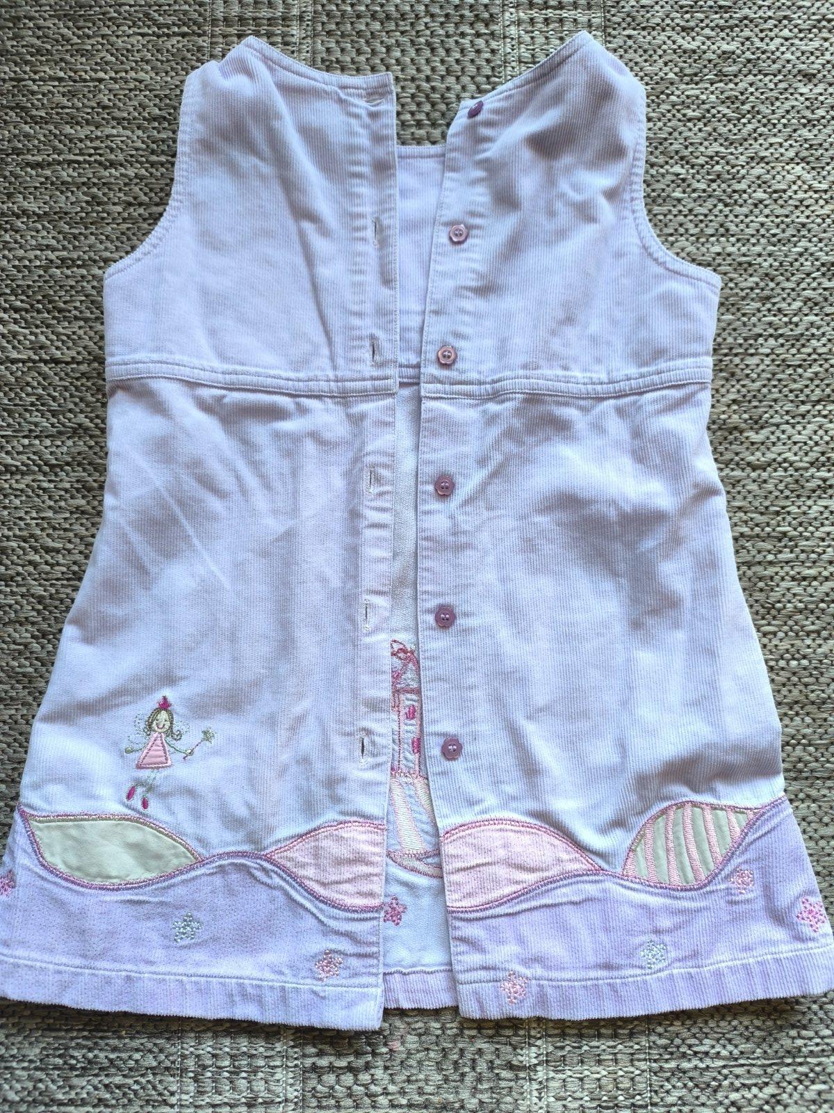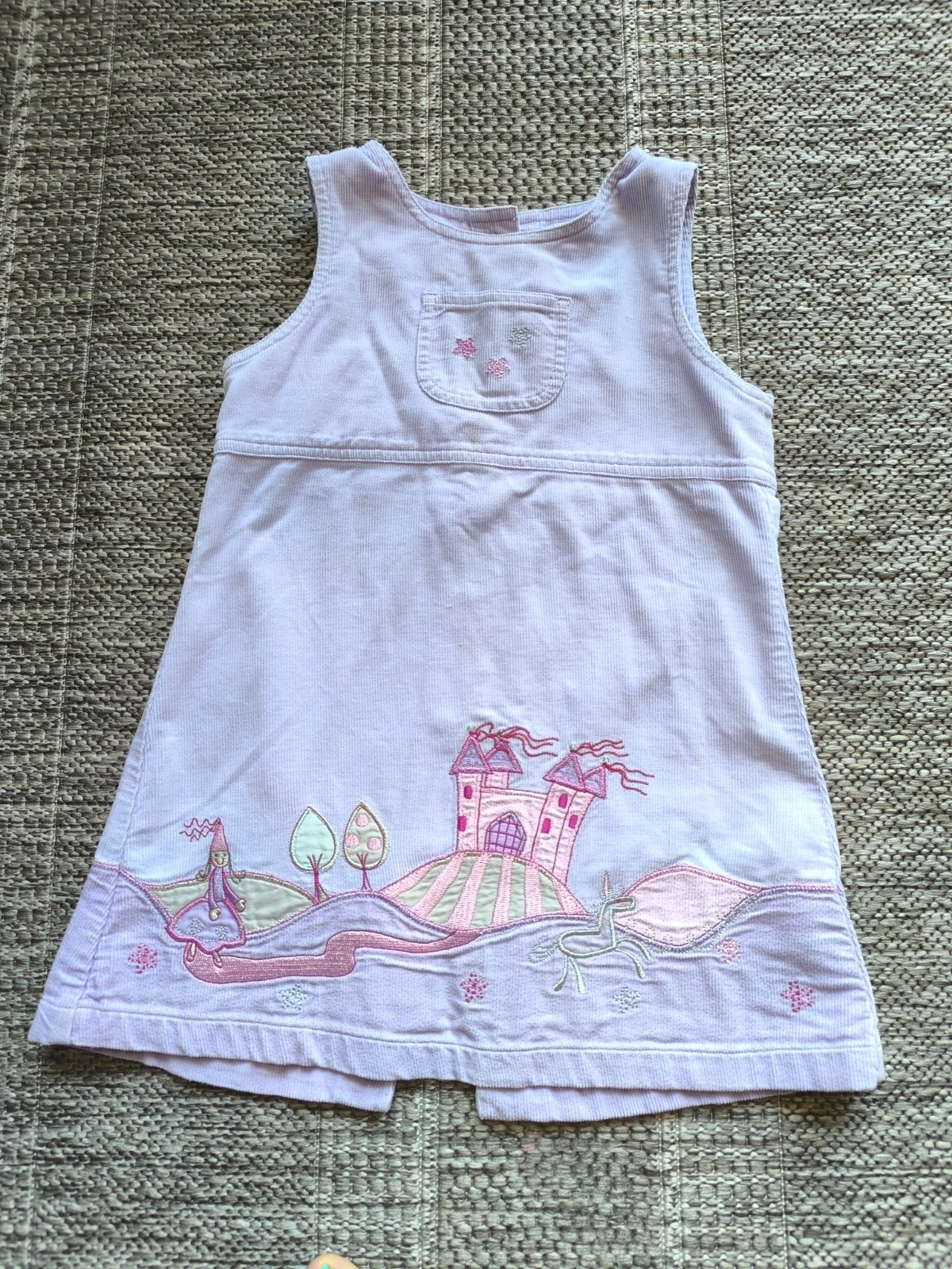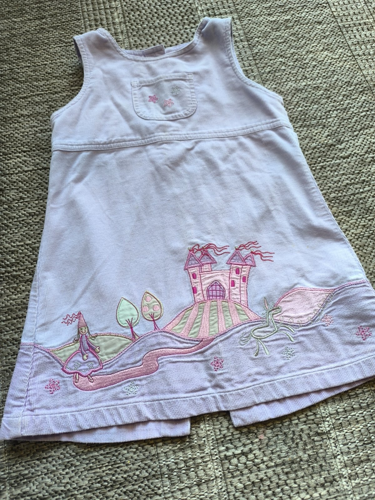 Menčestrové šaty zo 100% bavlny. Vyšívané, s krásnym rozprávkovým motívom princezny, zámku, nechýba ani kúzelný jednorožec ☺️ Vzadu na gombíky. Dajú sa nosiť samostatne alebo ako vrchné šaty na tričko a legíny, pančušky. V super stave, veľkosť 3-4 roky, 104. Dĺžka 55cm, šírka cez hrudník 35cm.