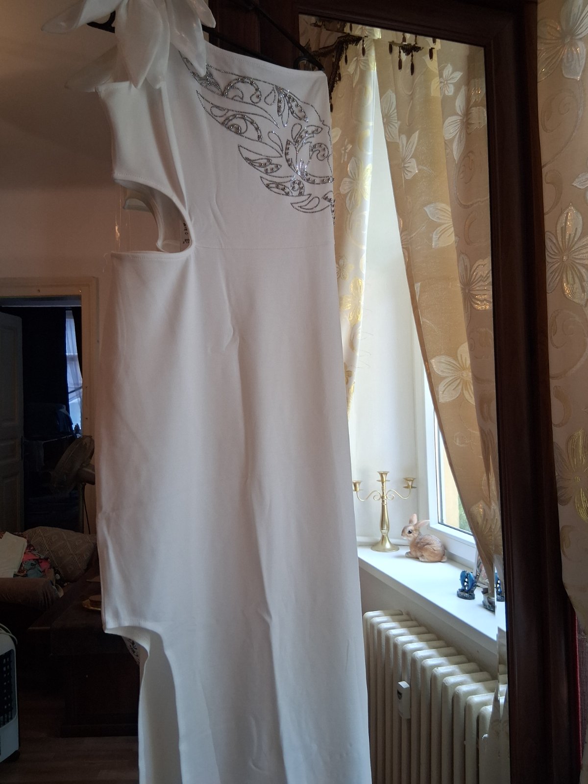 Predam nove šaty značky Tatu,saty su krasne biele, na jedno pleco kvetinkou, jeden bok vyrezany ,kamienky zirrkon...velkost uni od S do L,elasticka latka..