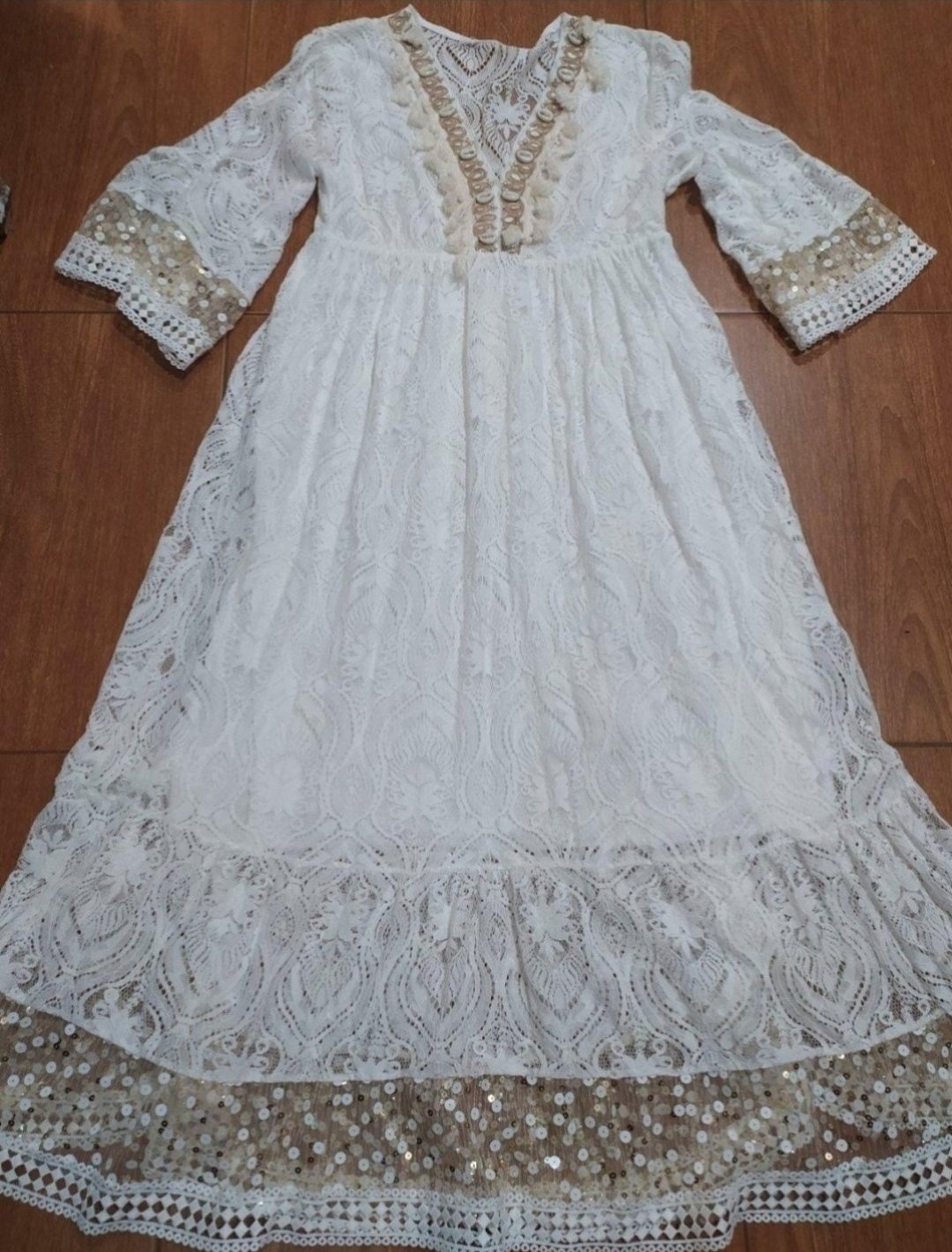 Krásne šaty maxi dĺžky,v top stave.Saty sú voľného strihu kombinované s krajkou,veľ Uni vhodné pre veľ M-Xl Dl 124,šírka 54*2,v