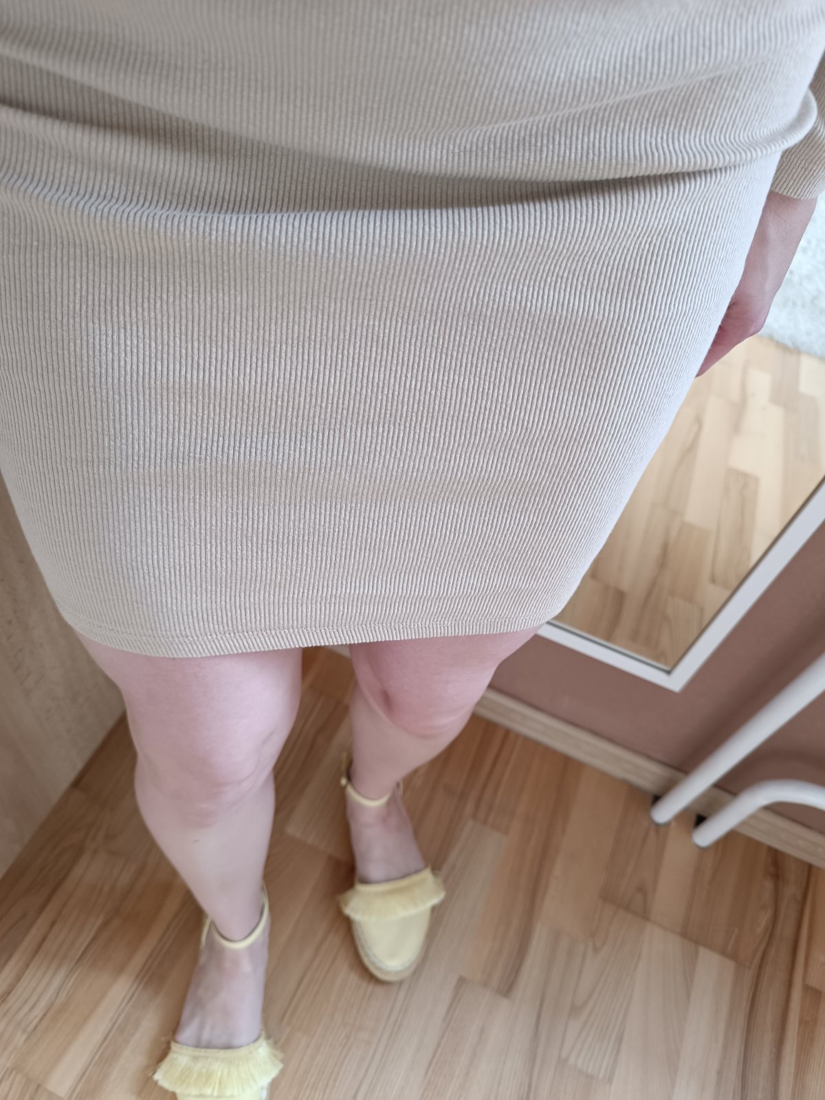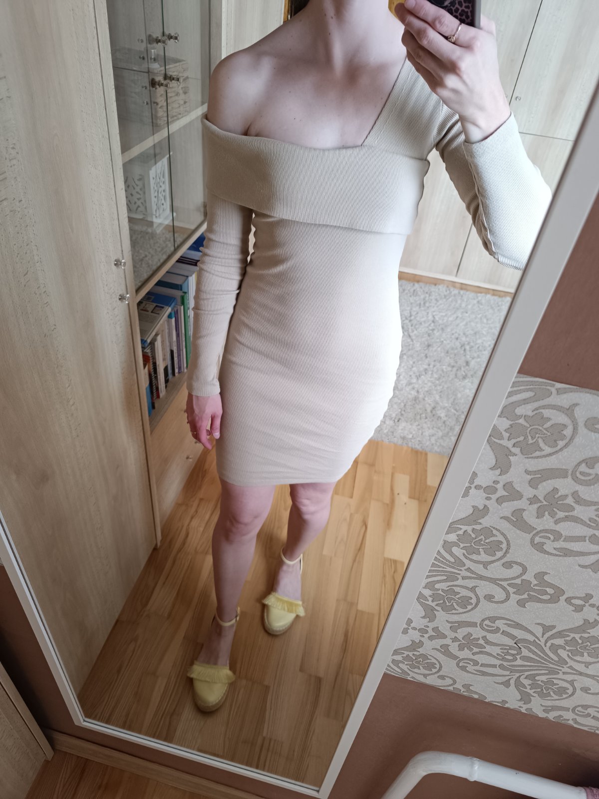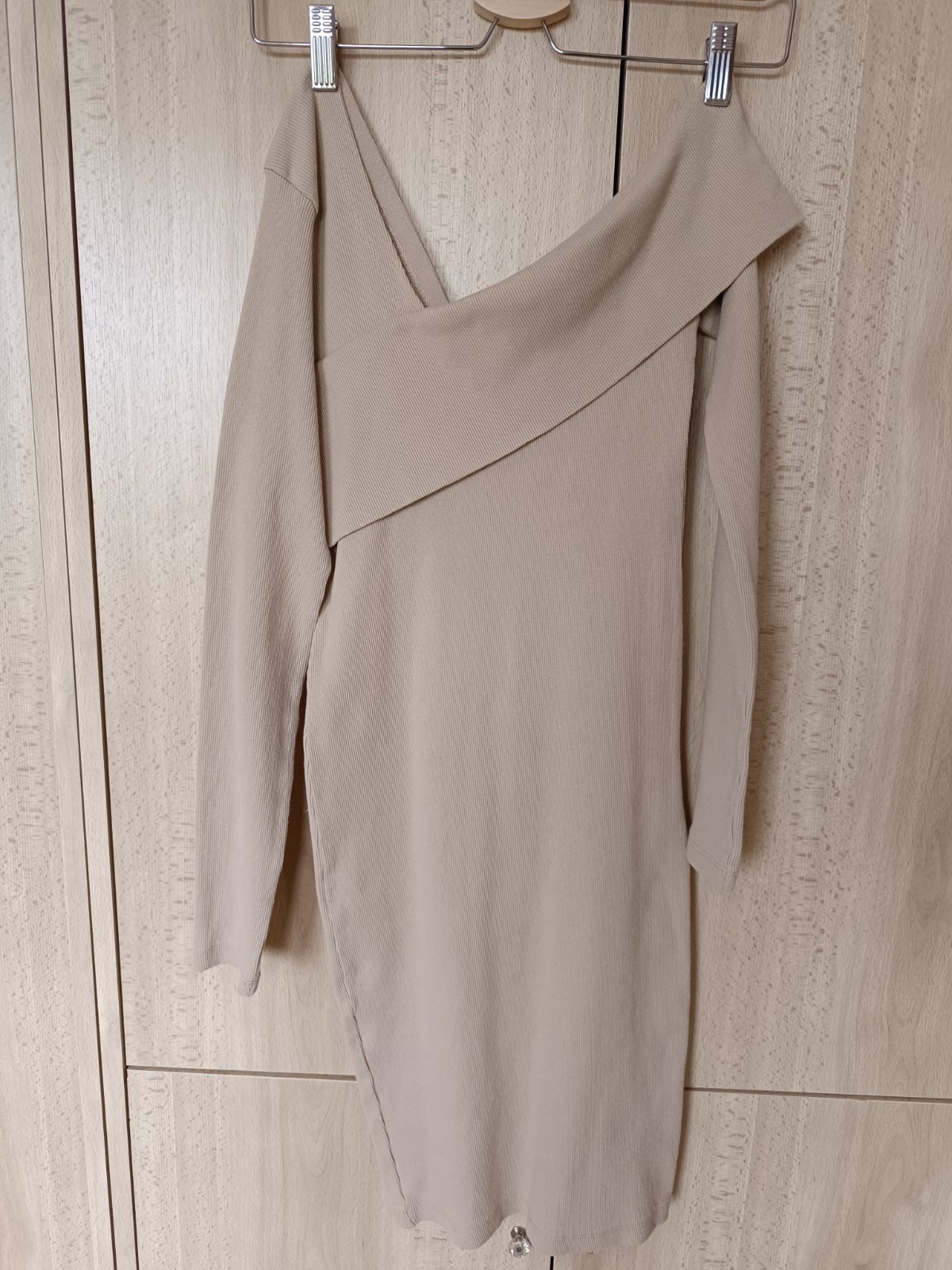 Béžové obtiahnuté minišaty s padnutým ramenom
