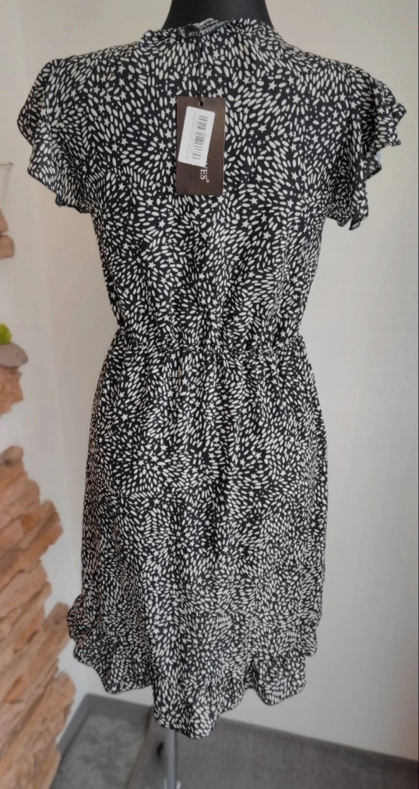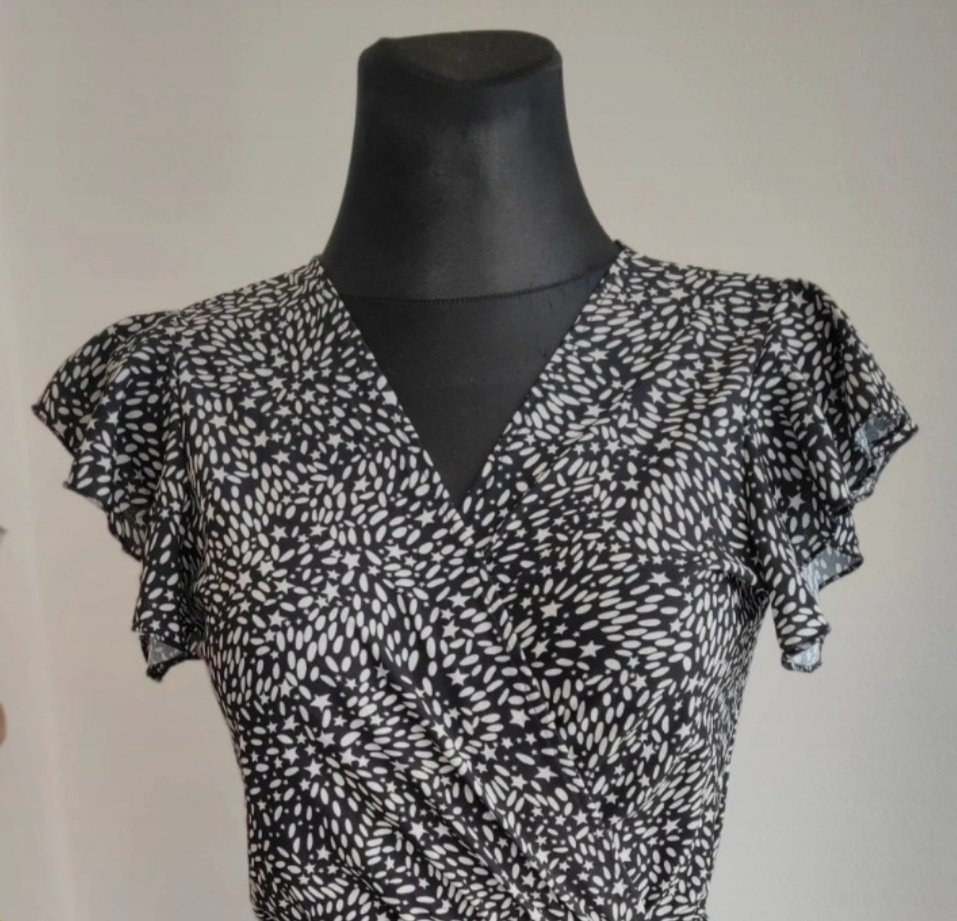 Šaty z plastickej látky, vzadu na zips. Skladana sukňa, na prsiach podšité. Materiál polyester. Rozmery: Obvod pŕs 81 cm. Obvod pásu 79 cm. Dĺžka 86 cm. Nenosené.