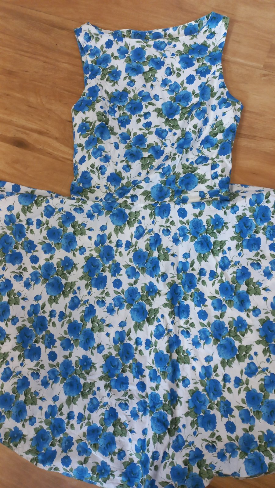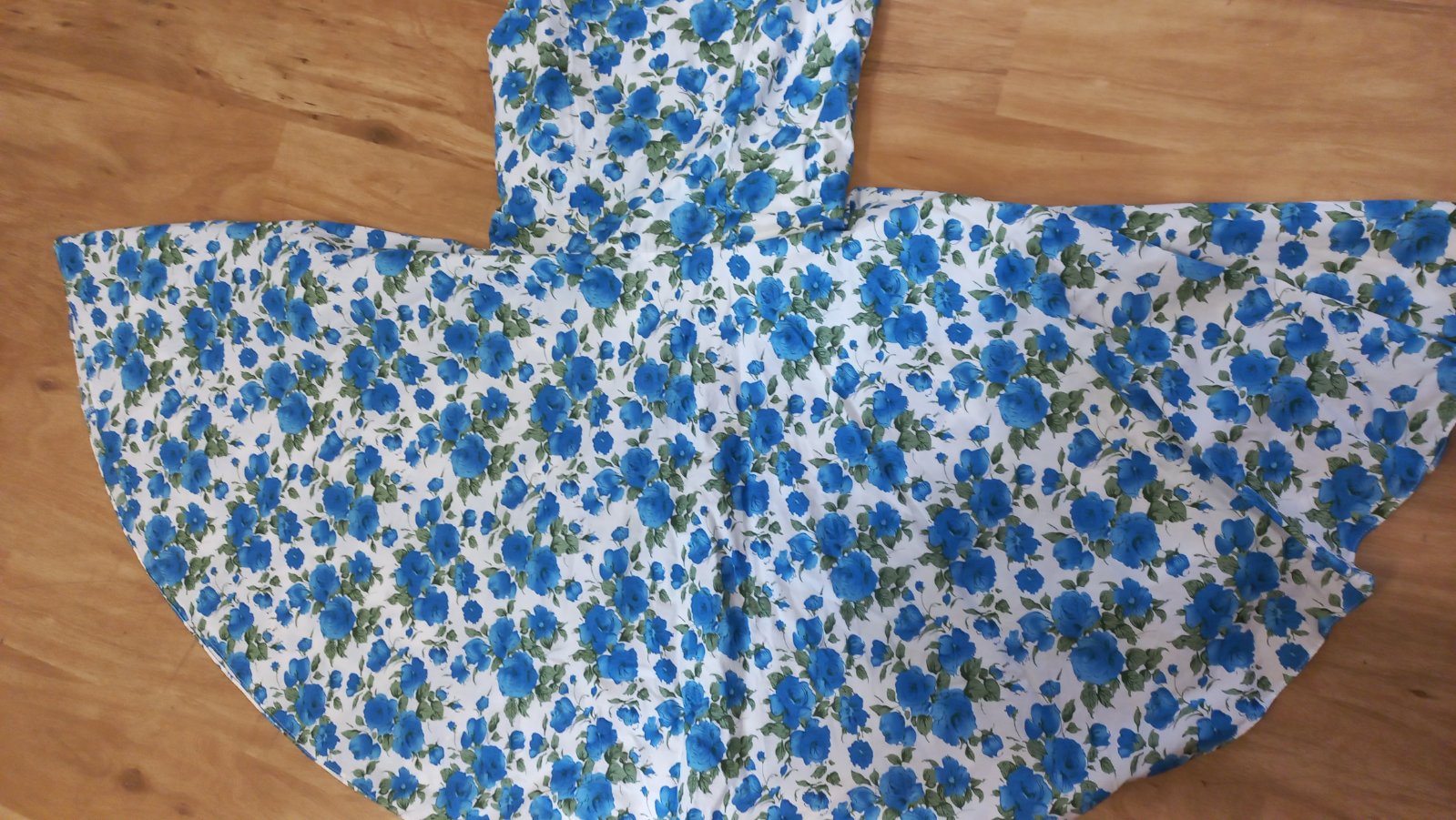Šaty sú rozšíreného strihu. Široký spodný diel. Na boku je dlhší zips. Vrchný diel jednoduchý strih. Dĺžka 100 cm. Spodný diel bohatý. Materiál je bavlna, látka. Na bežné nosenie, aj na príležitosti. Spodný diel kruhovo strihaný ' bohatá , efektná lsukňa
