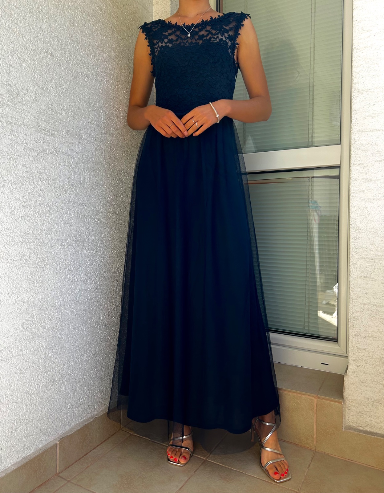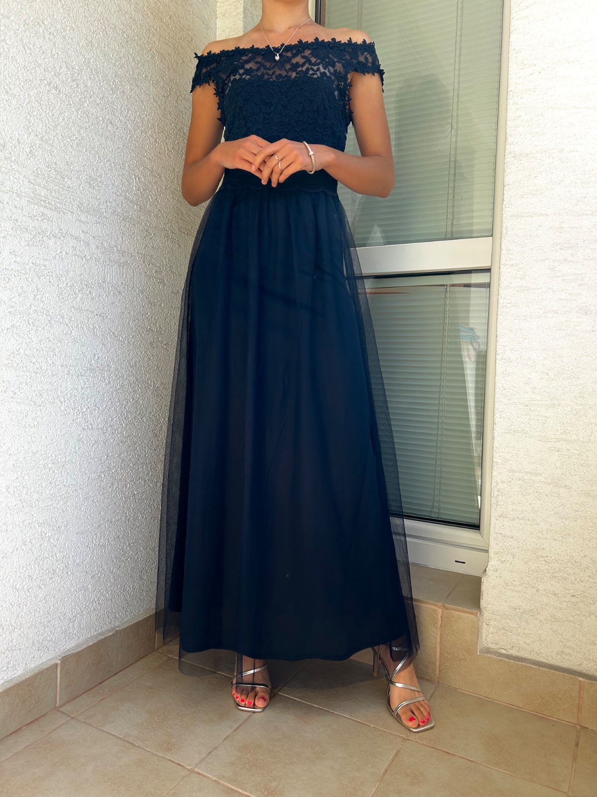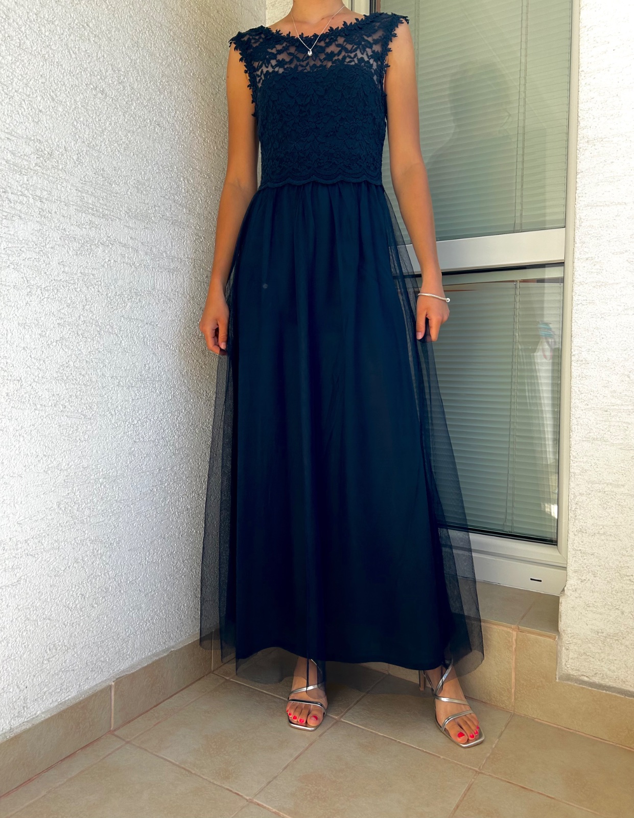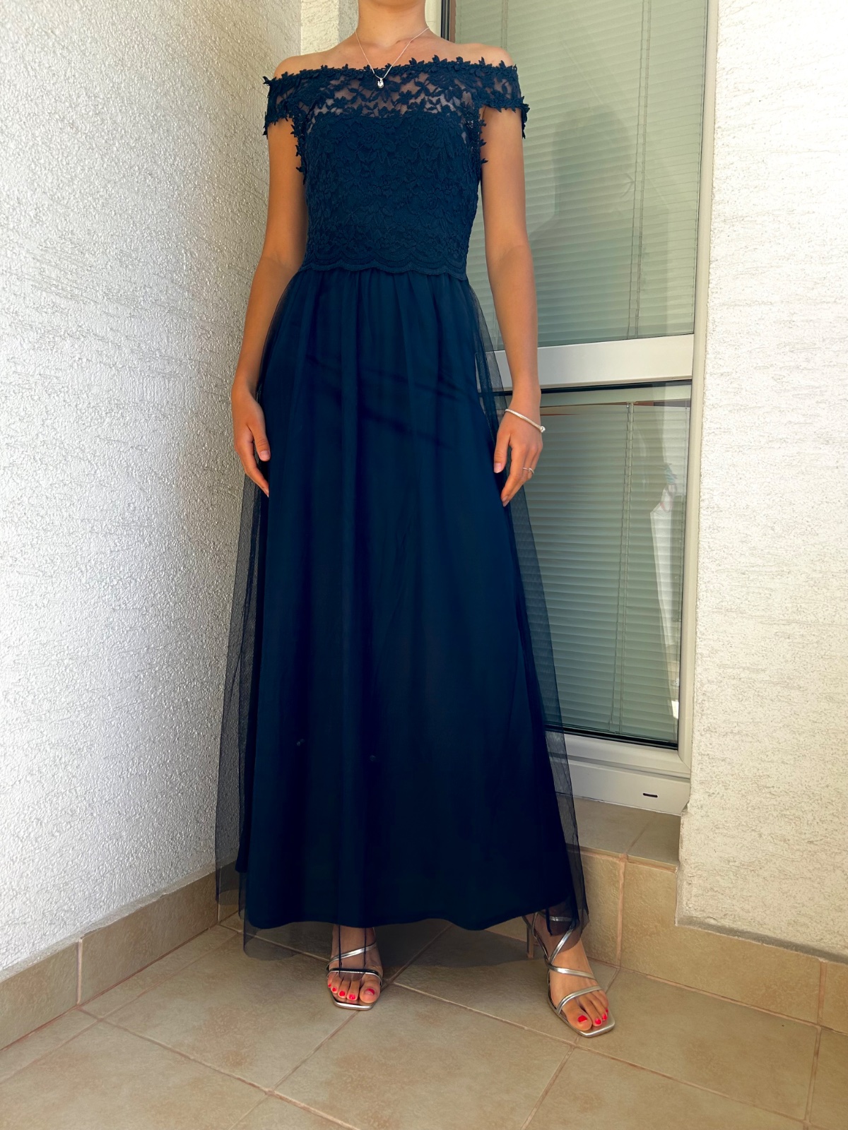 Krásne tmavomodré šaty,trochu tmavšie ako na foto, maju jedno "ramienko" z toho tylu,prehadzuje sa to ako stóla, na vesoaku sa to nedá tak odfotiť,skusila som na zemi na tej druhej foto. Top stav.