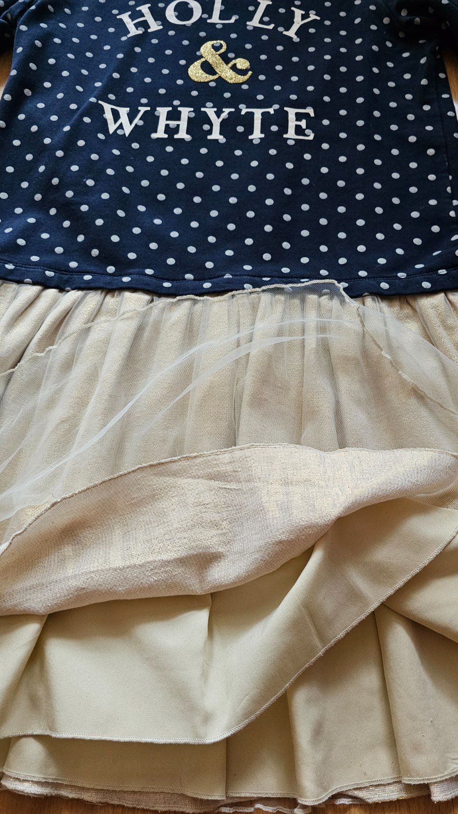 Predám šaty, veľkosť udáva 158/164cm, na 12-14rokov. Dĺžka šiat je cca 82cm, dĺžka rukáva od ramena je cca 52cm. Zo spodnej strany šiat, ktorú nie je vidieť sú jemné žmolky. Cena + poštovné, osobný odber BA.
