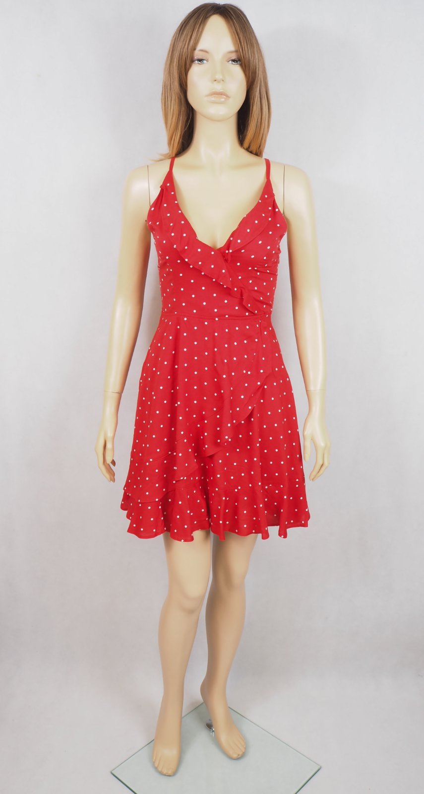 Kvalitné letné šaty červenej farby s bielymi bodkami, volánové, na ramienka, vzadu šnurovačka, bočný zips, materiál 100% viskóza, super stav.