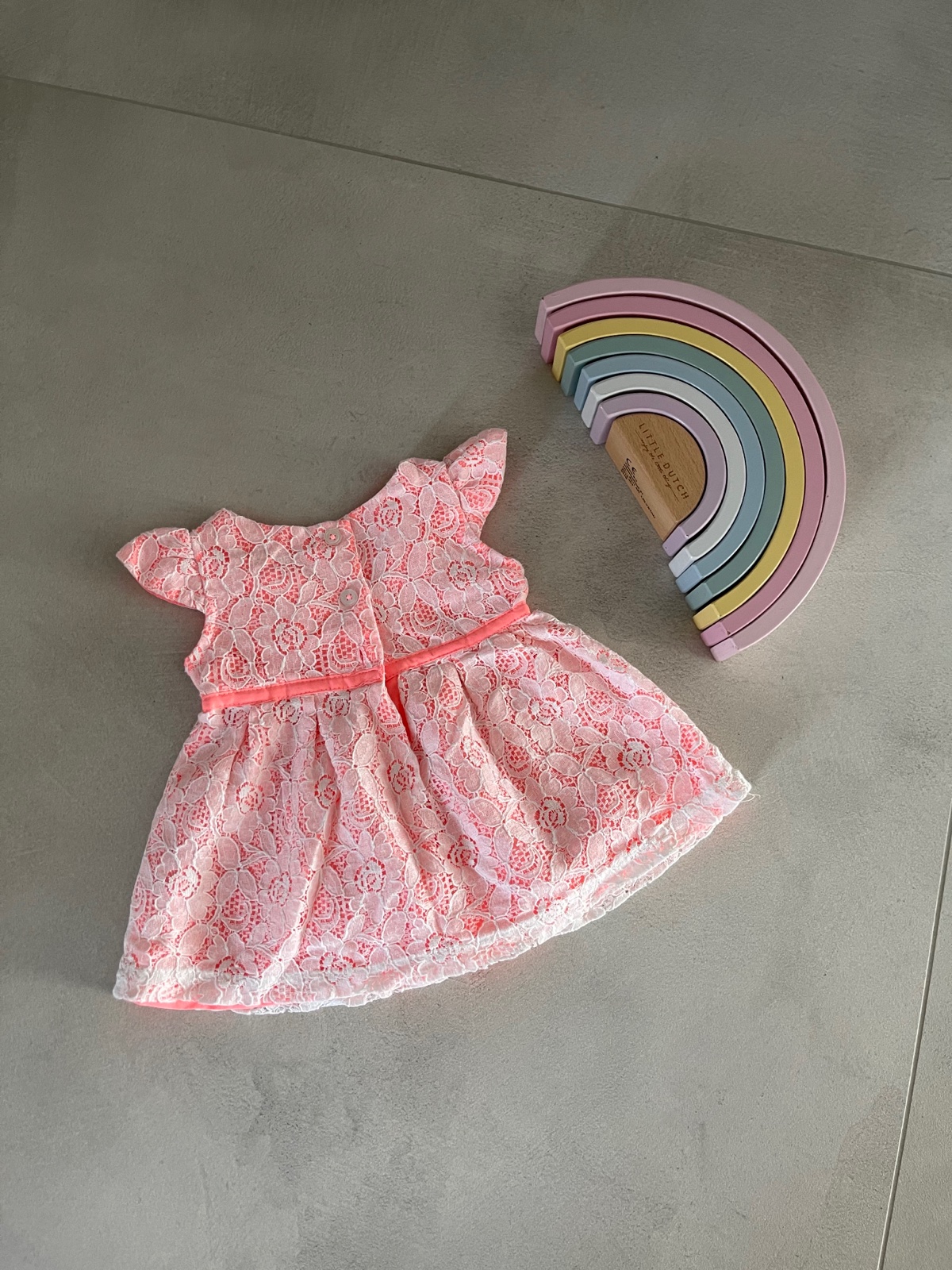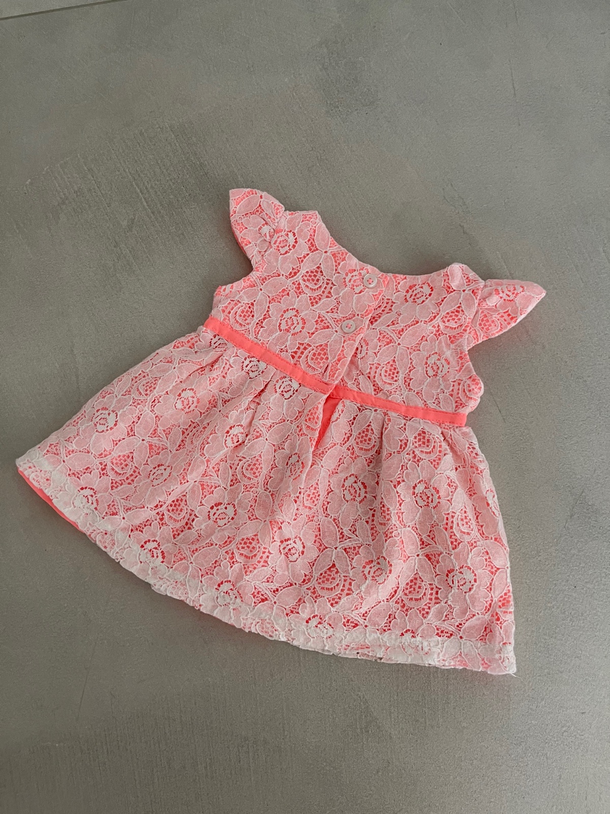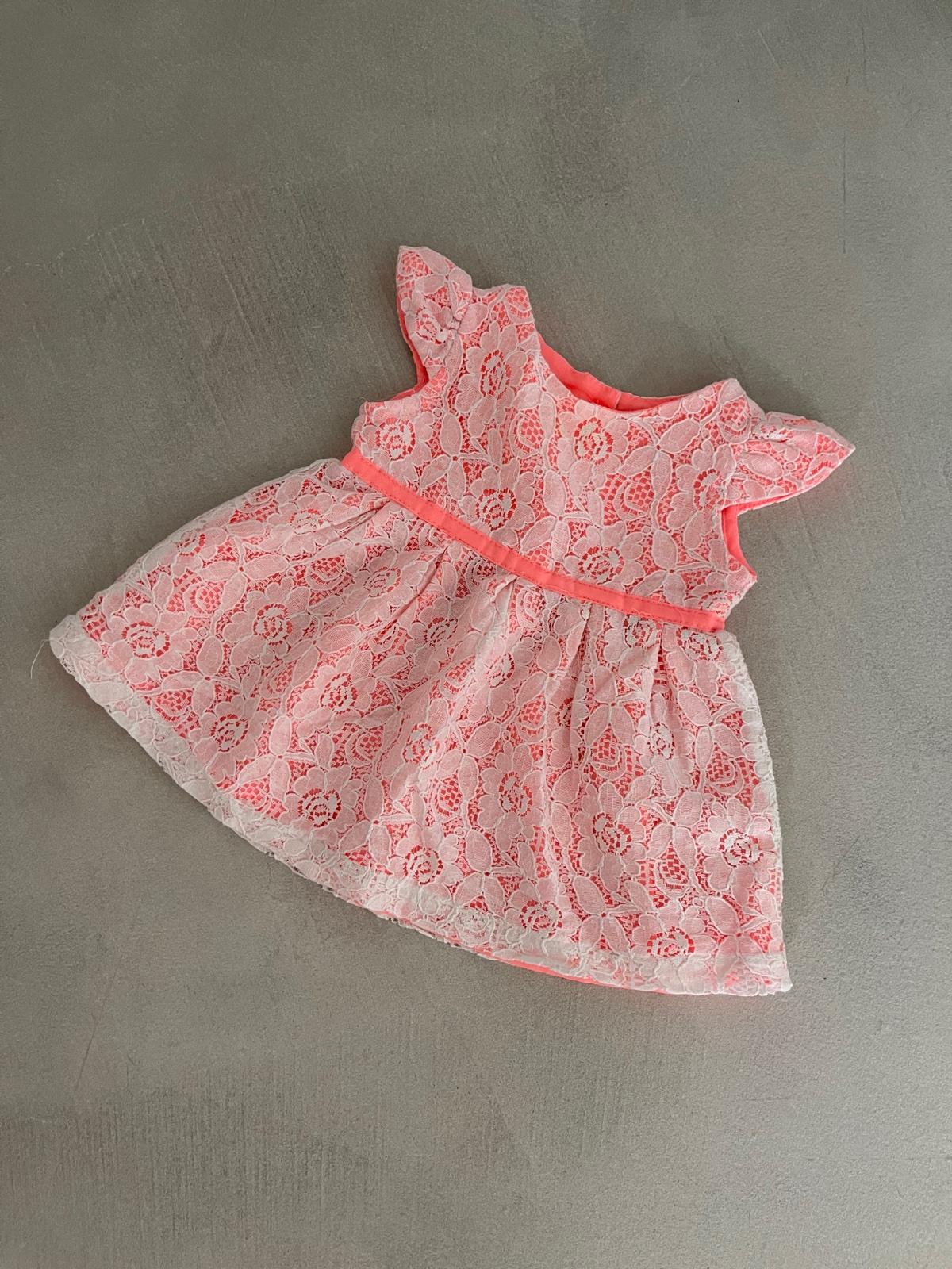 Krasne makke, pohodlne mencestrove saty lososovej farby s tmavomodrou vysivkou. Velkost up 3 months/ 6,5kg, vzadu na gombiky