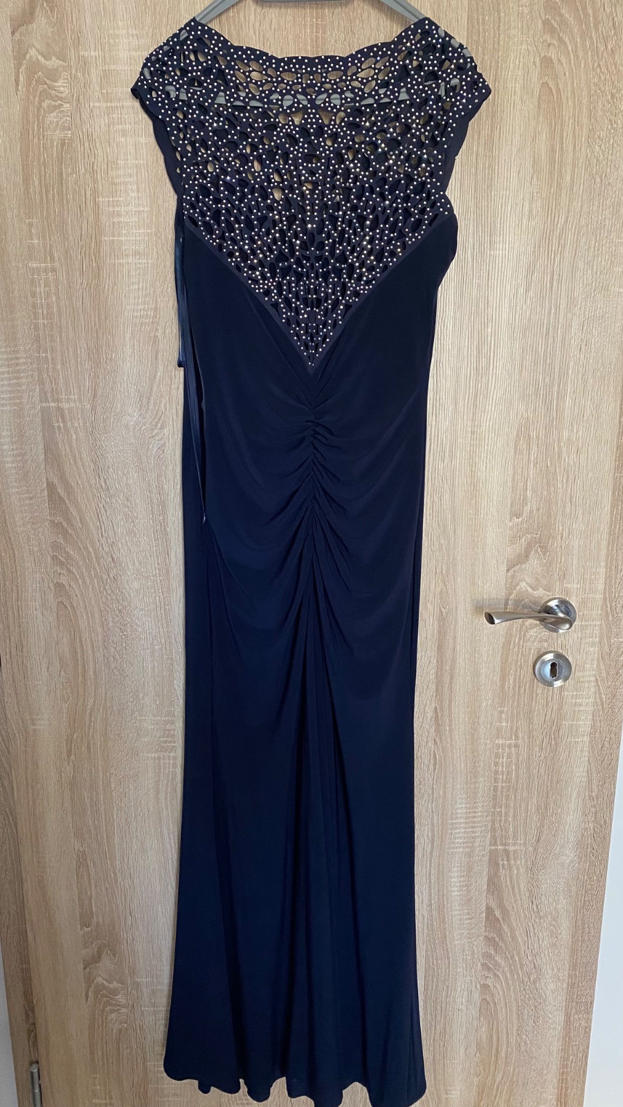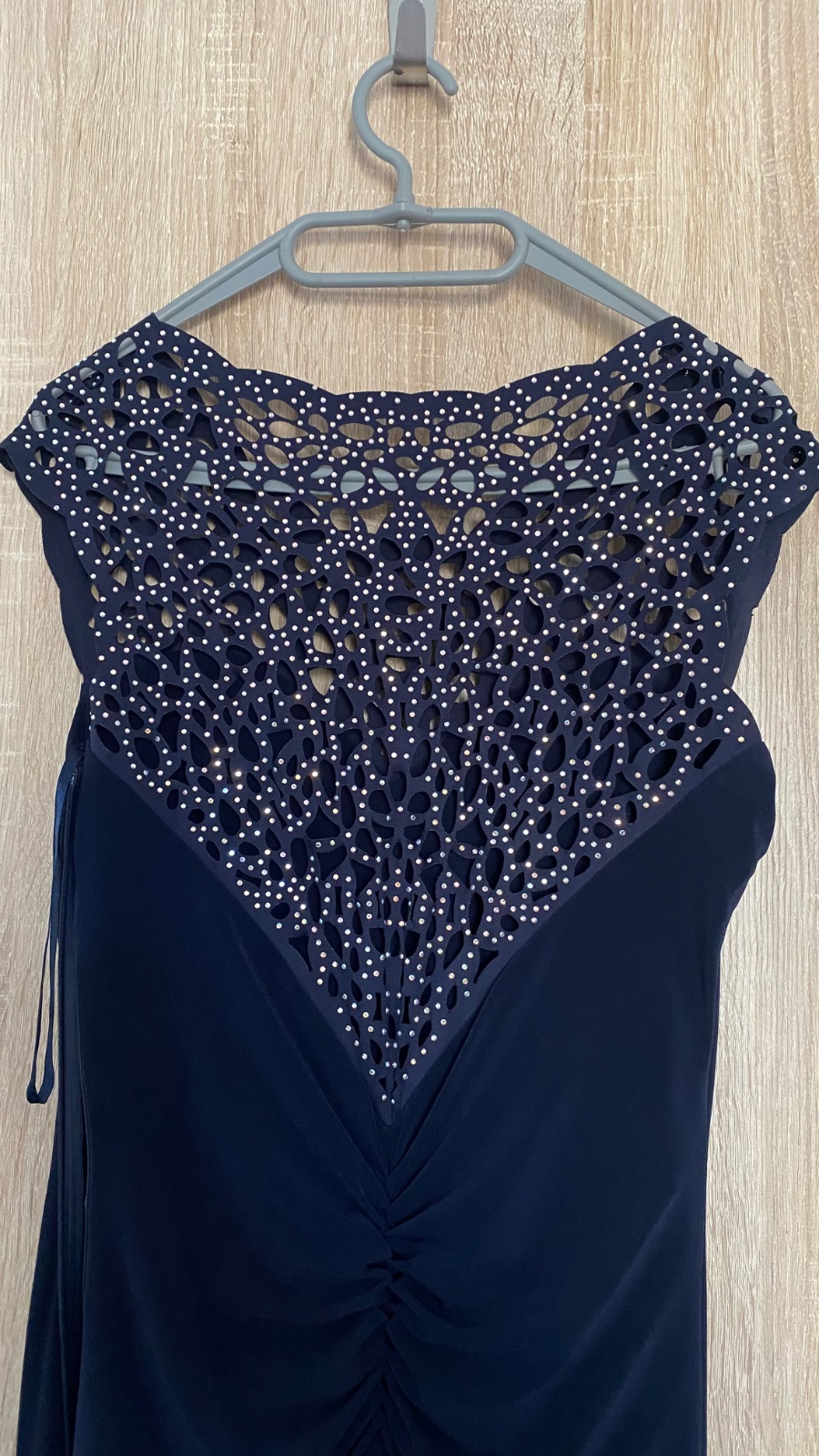 tmavomodre volne padava latka uzasnu postavu vytvaruju na jednom boku jemne nariasene robi to ozaj nádhernu postavu veľkosť 36 raz oblečené cena 15€
