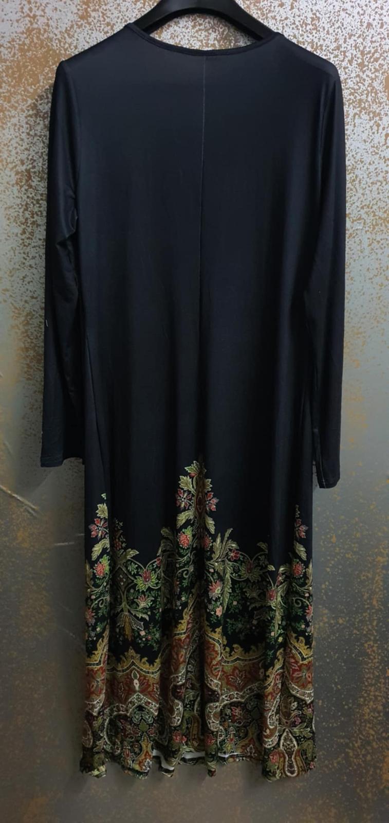 Šírka pod pazuchami 54-55 CM, rukáv 3/4, ja mám dlhšie ruky, pre niekoho možno aj dlhý, nové s visačkou, nesadla veľkosť, sú mi tesné, dĺžka šiat cca 110 CM. Vrchný diel šiat elastický.