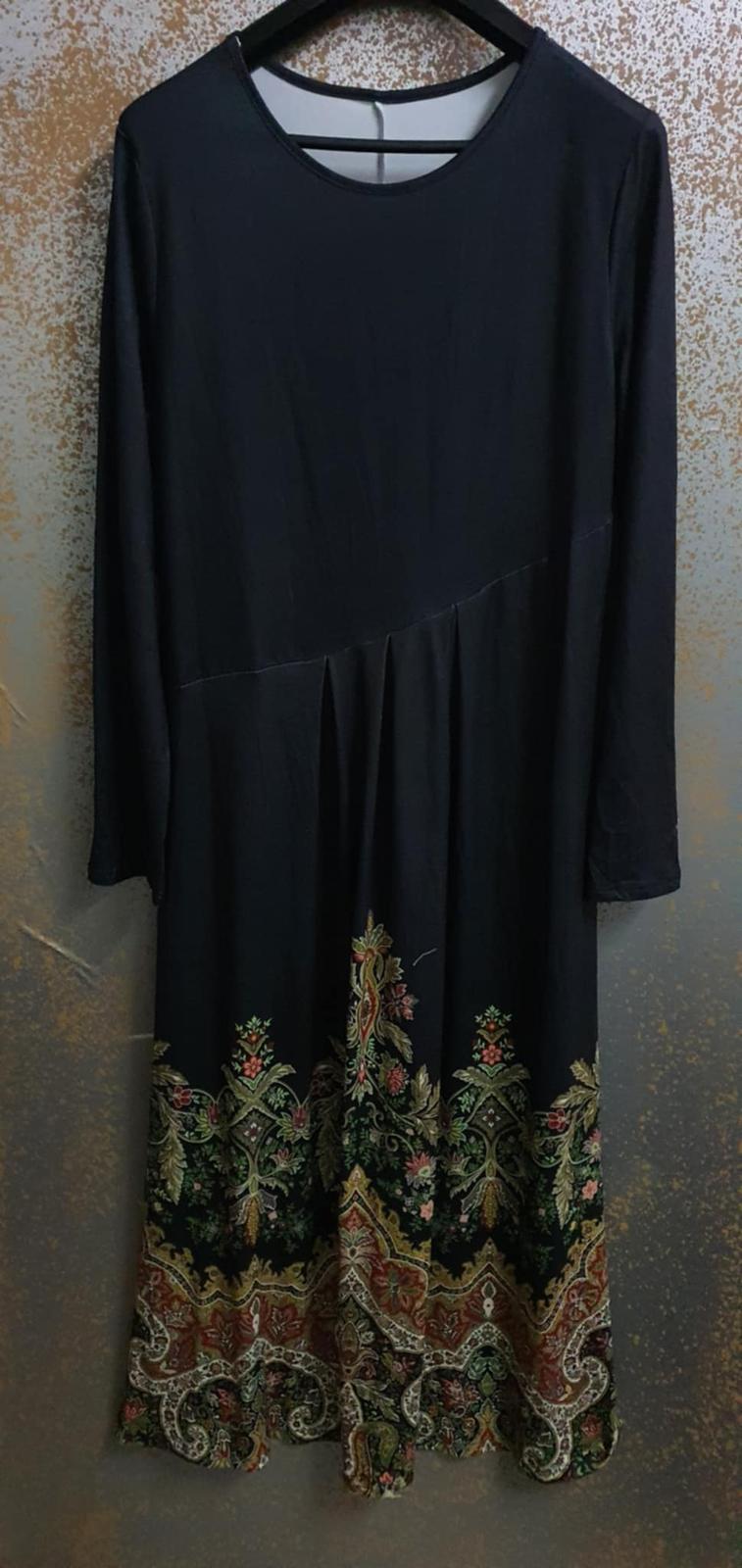 Pekné šaty s čipkovanými detailami vo veľkosti 2XL, miery: prsia šírka 54-65, pás šírka 45-58 (guma), boky šírka 65-77, dĺžka 146, rukáv dĺžka 65.5. Cena 28 eur.
