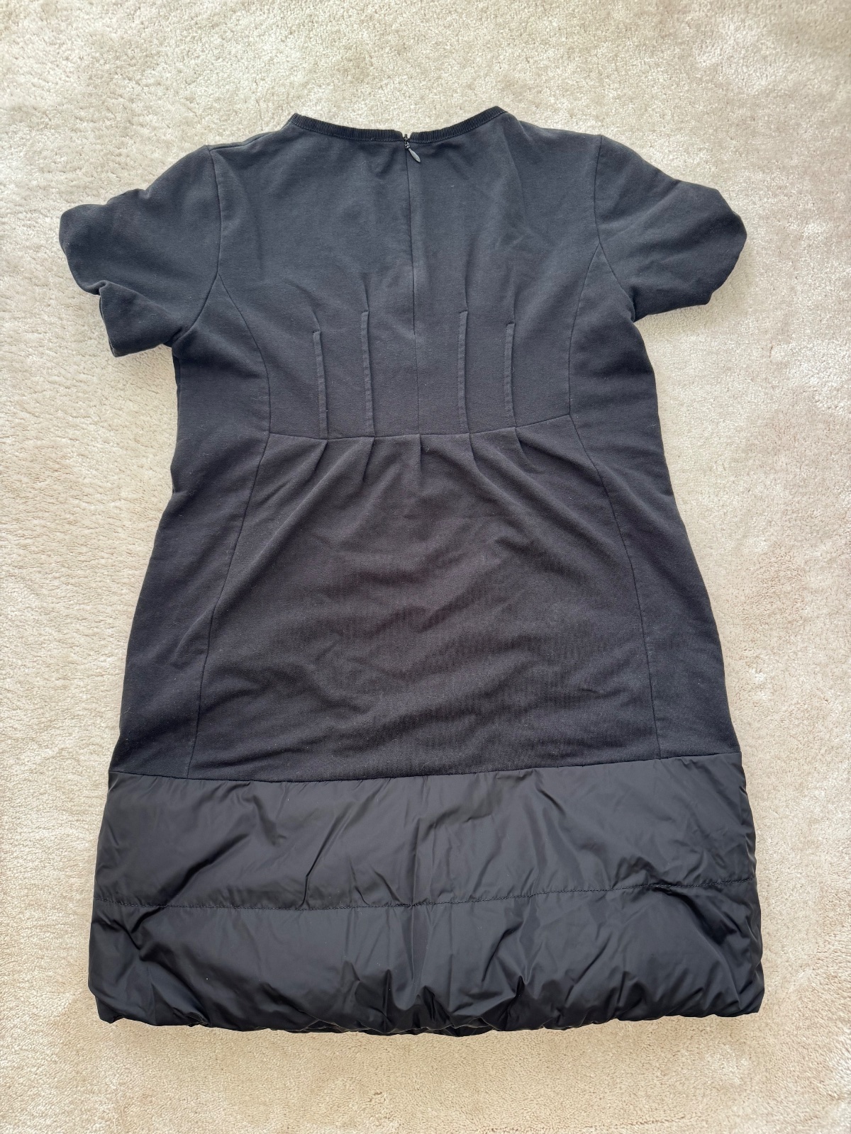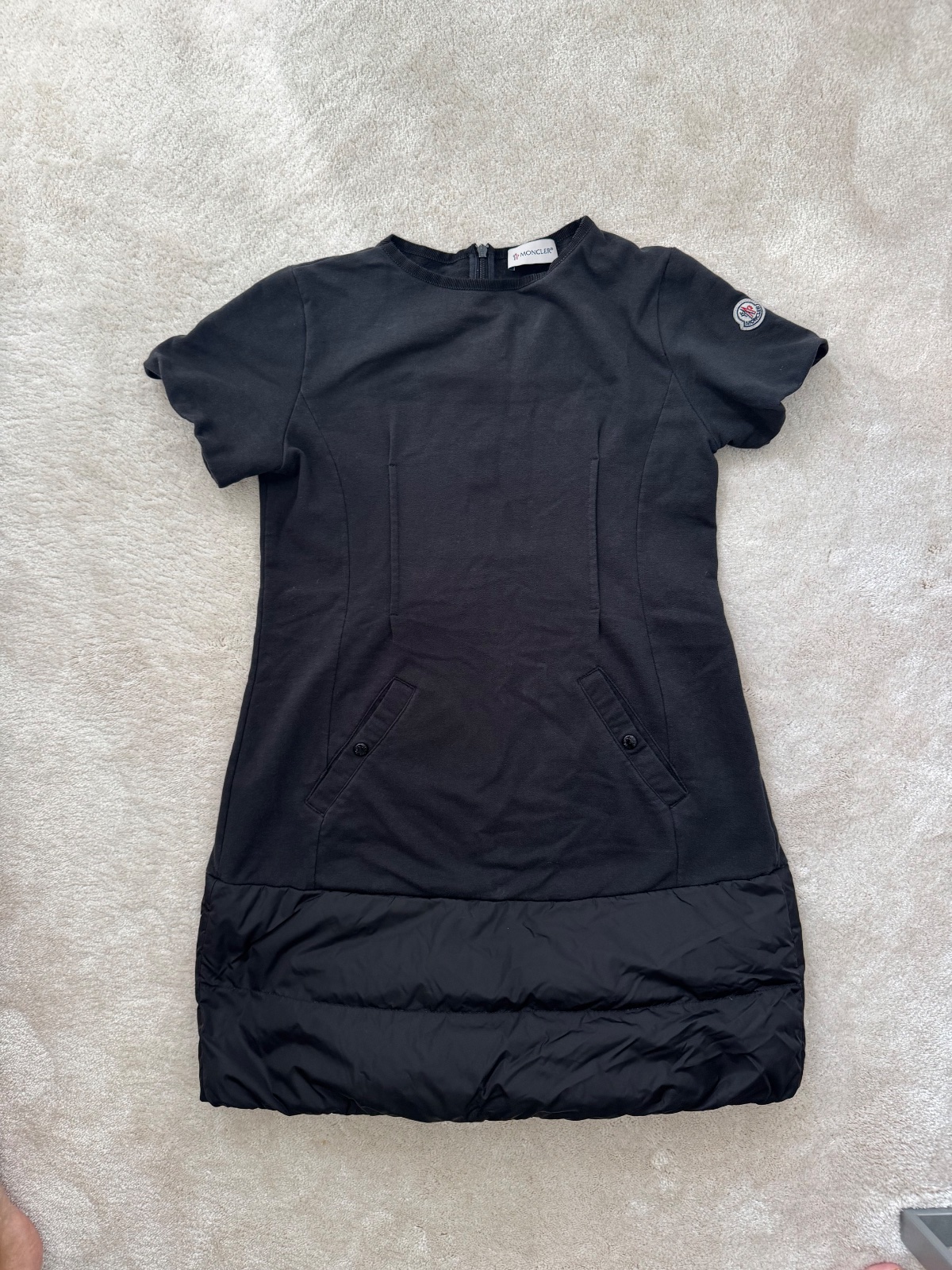 Original Moncler saty v ciernej farbe, stav dobry, kombinacia bavlna a spodna cast paperova vetrovka, velkost 14 rokov.