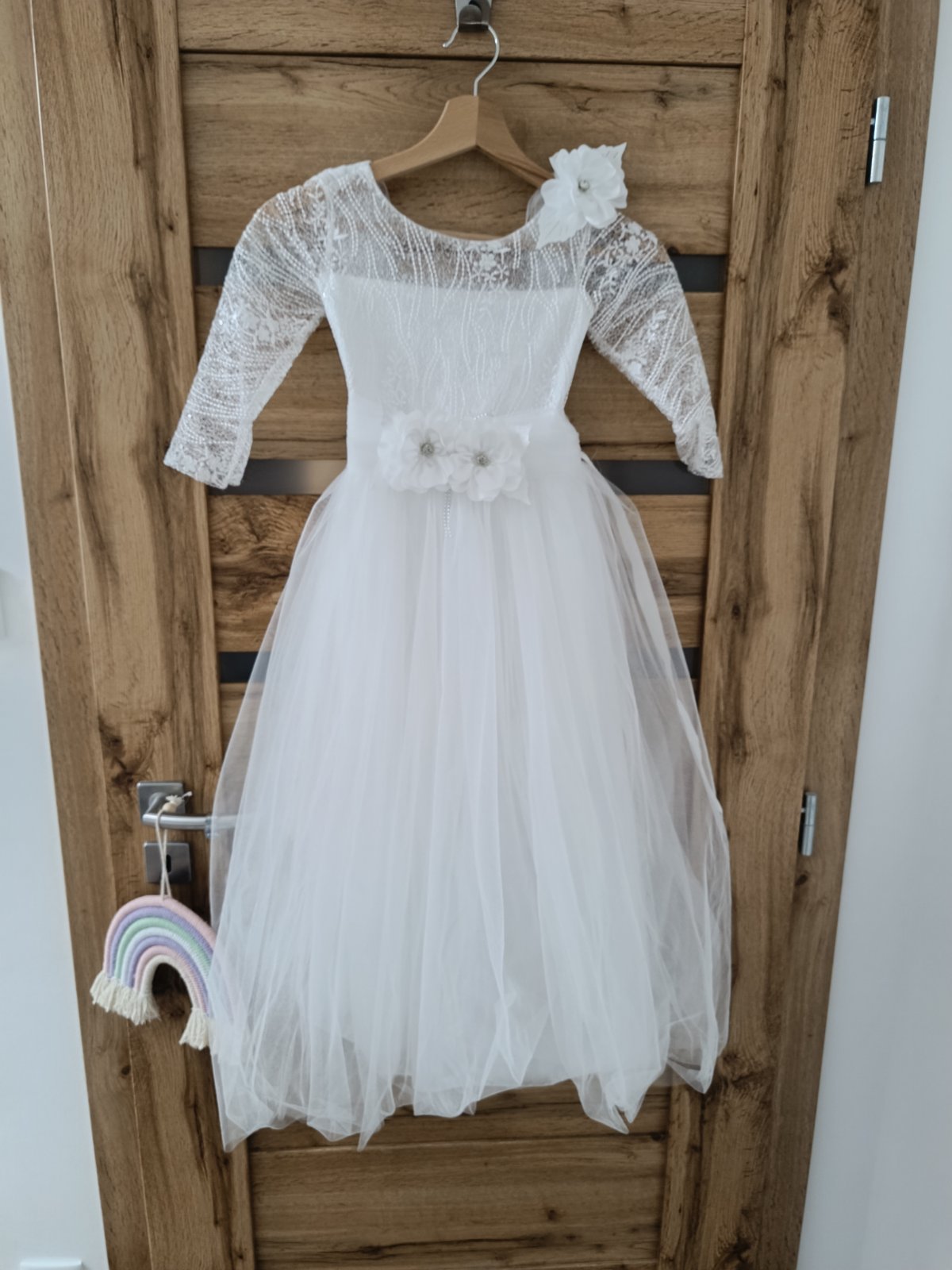 Nádherné biele šaty na prvé sväté prijímanie, 1x oblečené, dĺžka 111 cm, šírka pod pazuchami 36x2cm, v páse sa dajú pekne prispôsobiť vďaka mašli, 3 vrstvy - spodnička, 2xtyl....sú krásne svojou je...