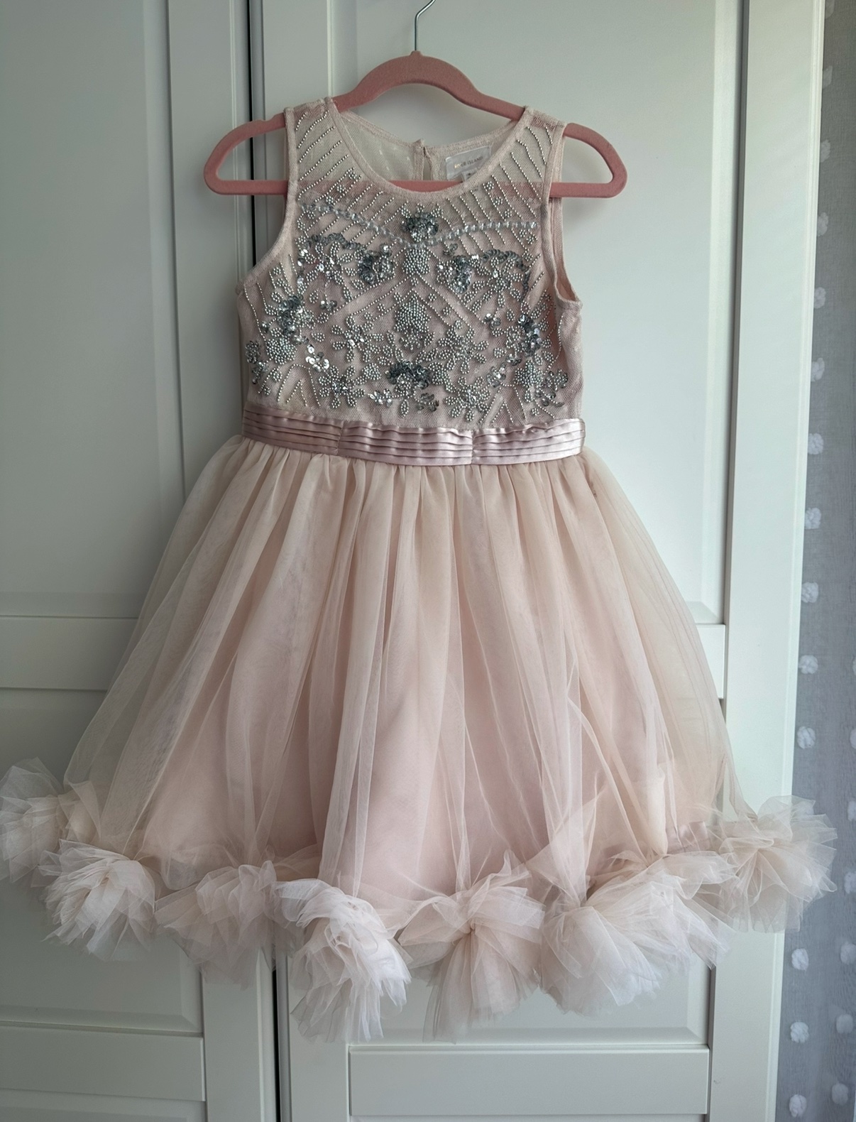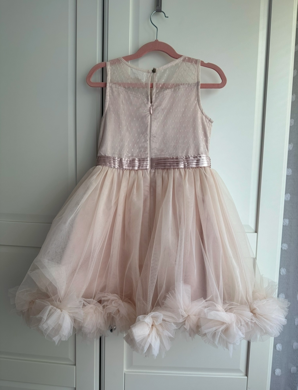 Pekné spoločenské šaty pre mladé slečny. Šaty sú s tylovou sukňou, vrchný diel (predná strana) je zdobená flitrami. V predu majú na páse kvet, vzadu na uviazanie mašľu. Dobre sa obliekajú, v zadu s...