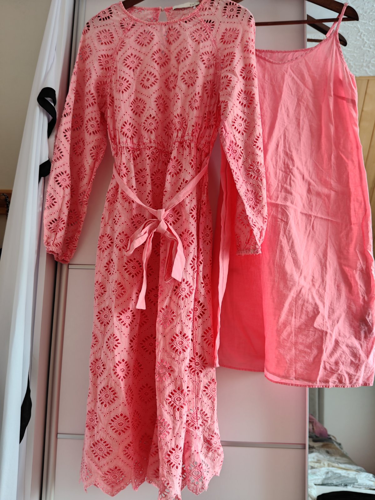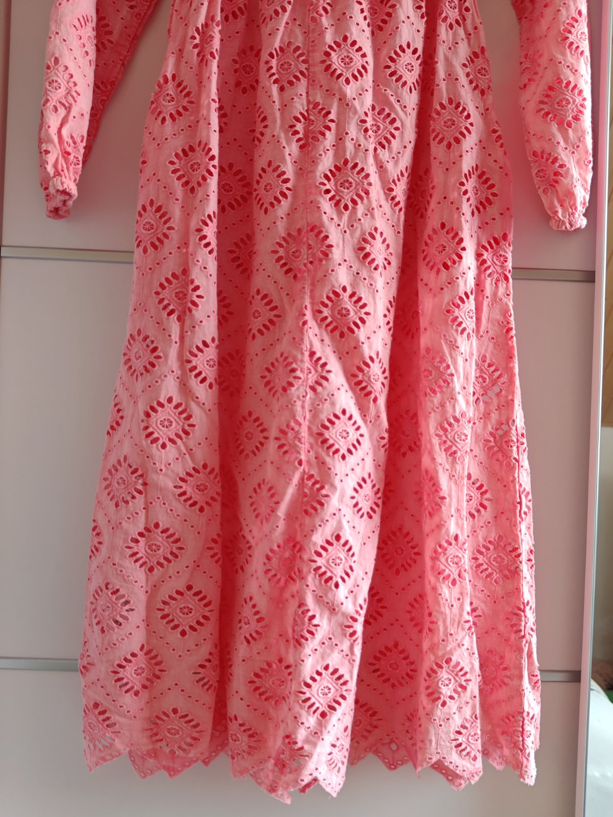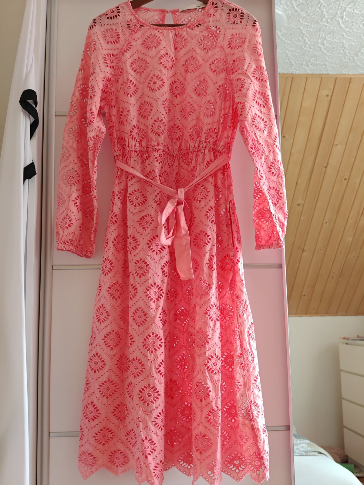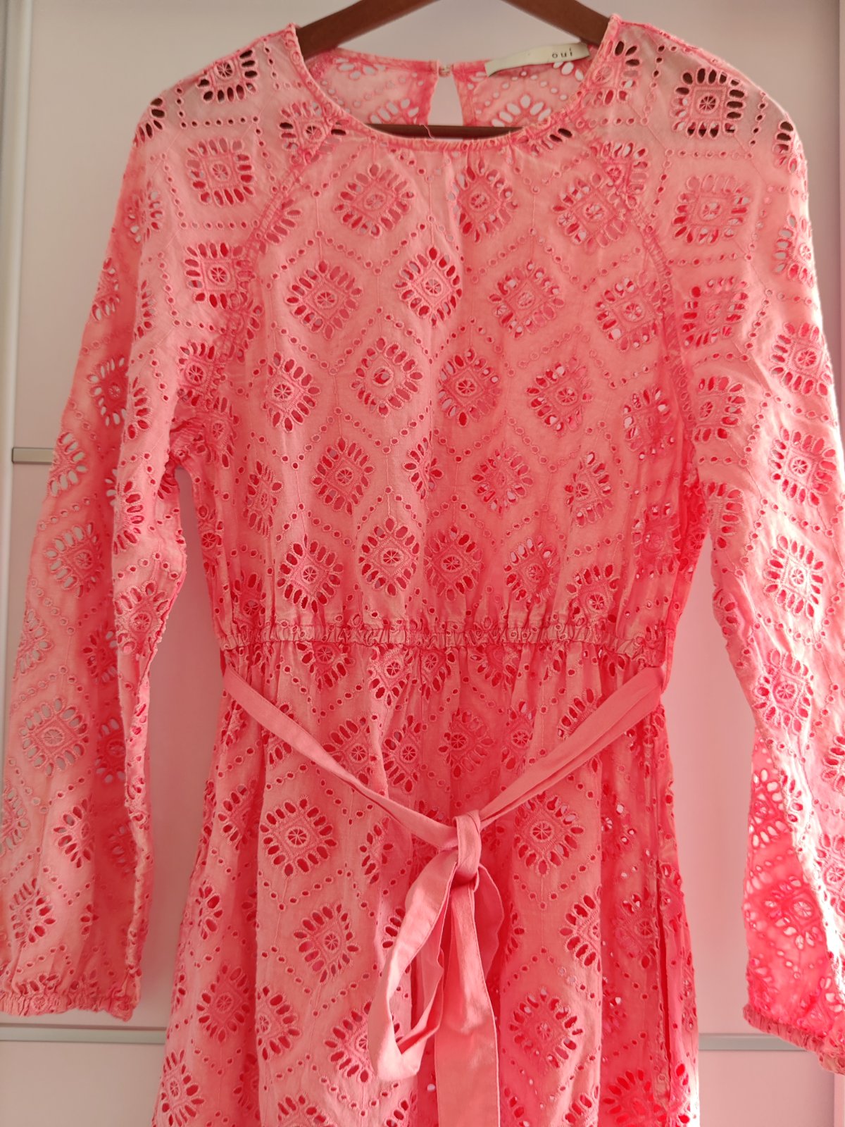 Krásne málo nosené madeirové dámske dlhé šaty original OUI, súčasťou je aj opasok nádherné v krásnej farbe takej lososovo marhuľkovej velkostne 36/38, dajú sa nosiť zo spodničkou ale efektne a sexi vyzerajú aj bez iba na spodné prádlo