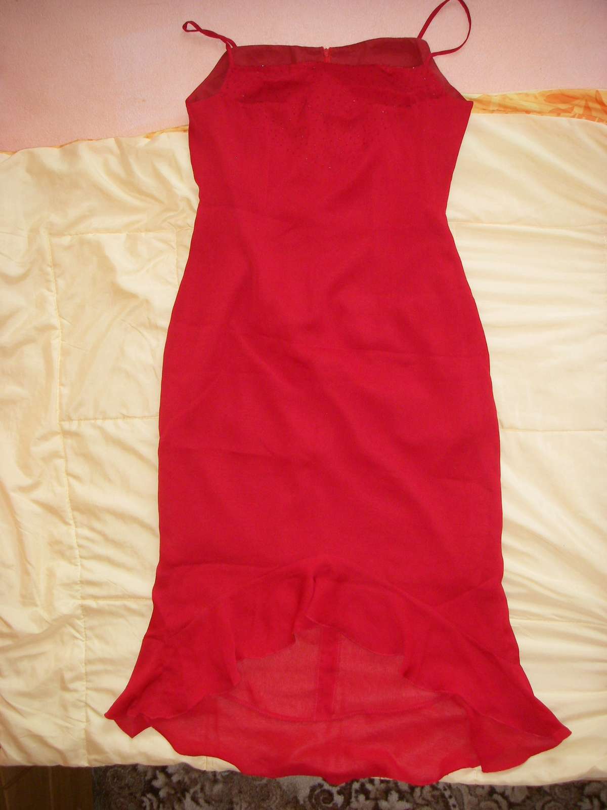 Predám červenobordové letné šaty so spodničkou, boli použité len raz na mojej svadbe na redovom tanci. Sú šité v svadobnom salóne. Na prsiach majú našité korálky (viď foto), na spodnej časti šiat je volán a vpredu sú kratšie ako vzadu. Vzadu majú zapínanie na zips. Veľkosť som si tipla na cca 40/42. Miery - ramienka: 2x13 cm, hrudník pod pazuchami: 2x43 cm, dĺžka vpredu: 83 cm a vzadu: 111 cm, boky: 52-53 cm. Sú bez dier, fľakov a iných poškodení. Cena je bez poštovného a balného, v KE možný osobný odber.