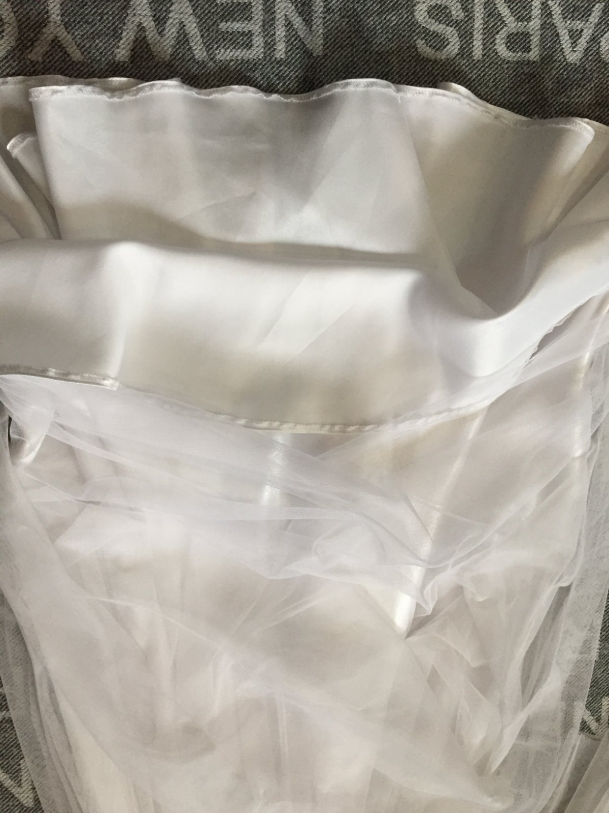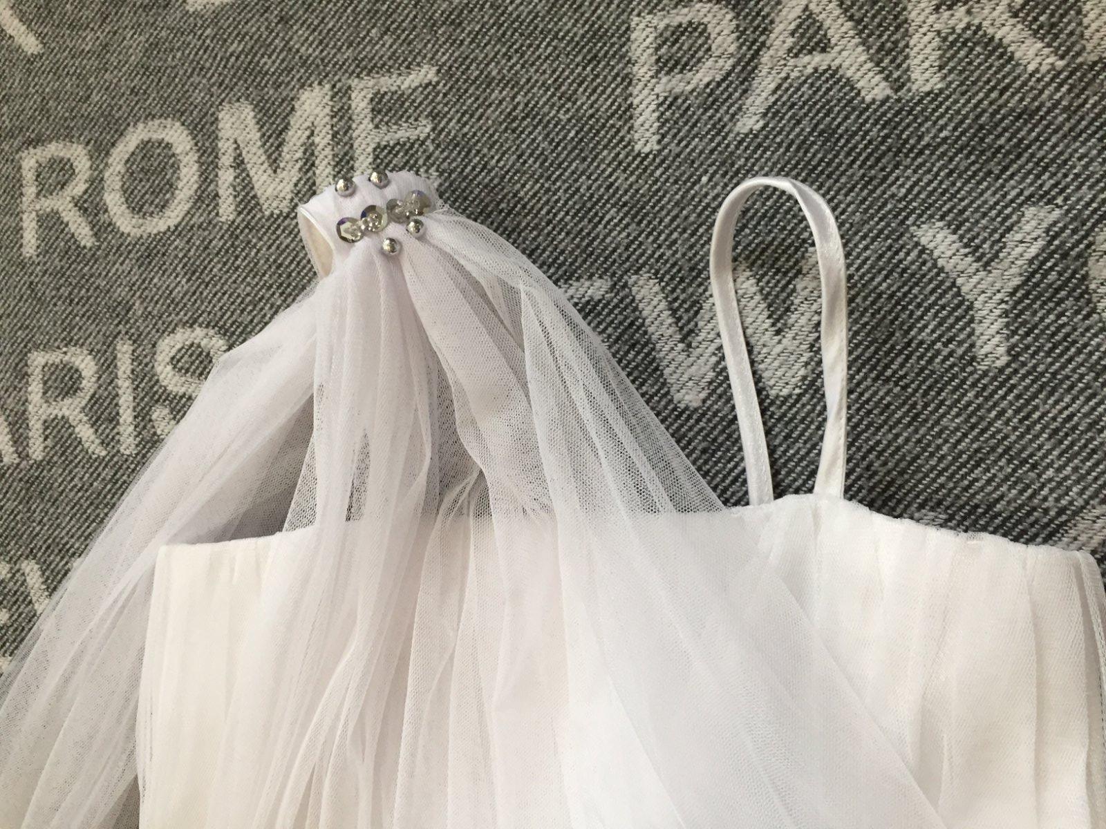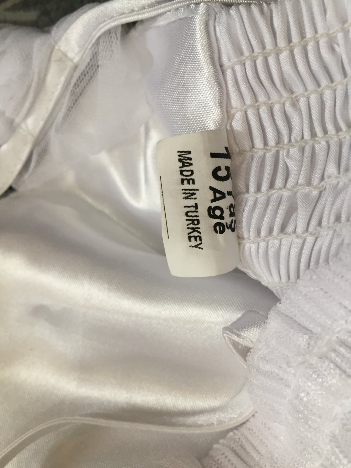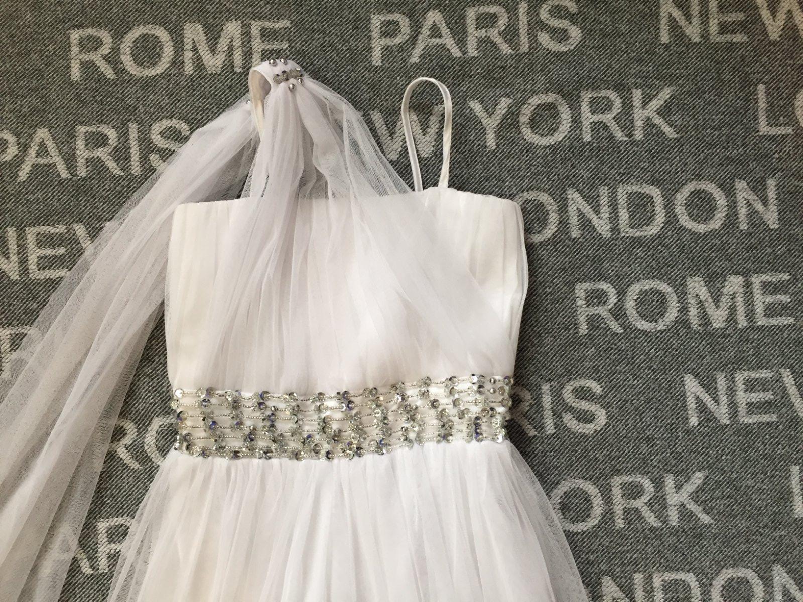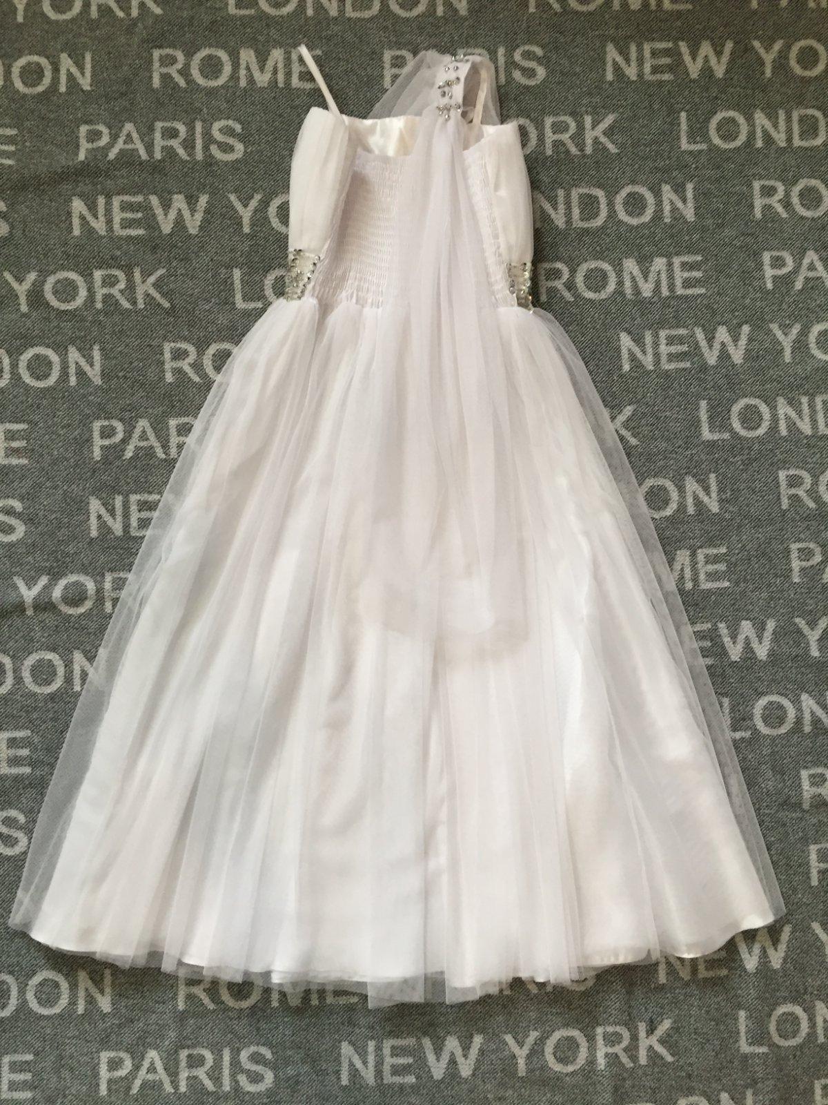 Saty sme mali oblecene raz sa 1. sv. prijimani. Velkost je na 15 rokov, je cca 158-164. Stale su krasne. Skracovali sme ramienka a maju jednu malinku dierku uplne dole na sukni, pozri na foto.Urcite to nevidno, treba to hladat. Dlzka je 105cm, sirka cez prsia 31cm- je to elasticke natiahne sa, vzadu su gumicky.