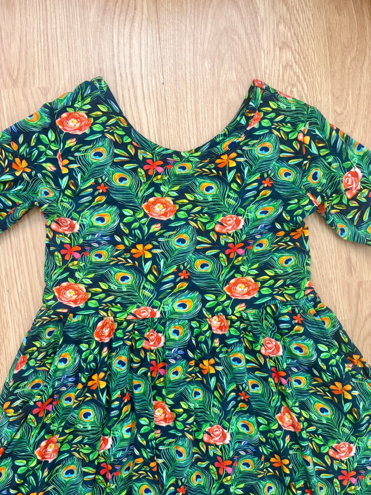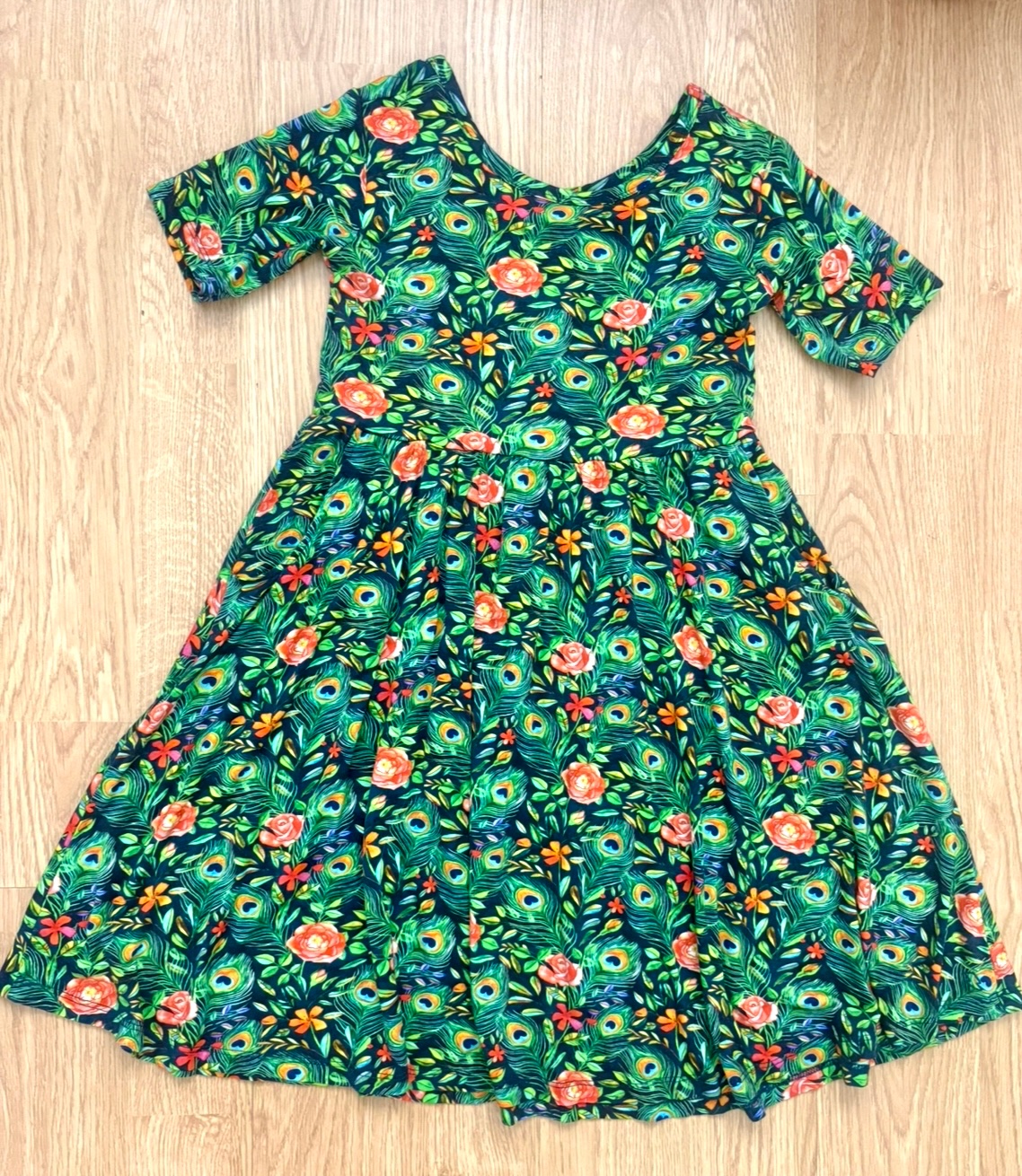 Šaty 134/140 z USA z 95% bambusovej viskôzy ( fantastický materiál,chladivý,dieťa sa nepotí) PC 45$ majú vrecká..perfekt stav.Krásna farebná kombinácia-pávie perie a kvety.