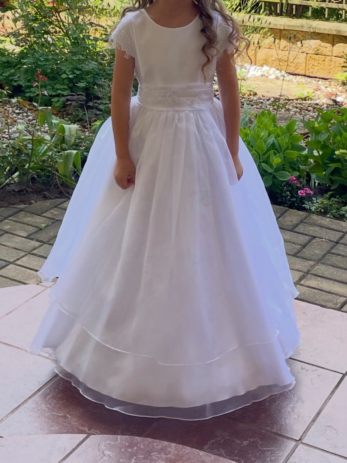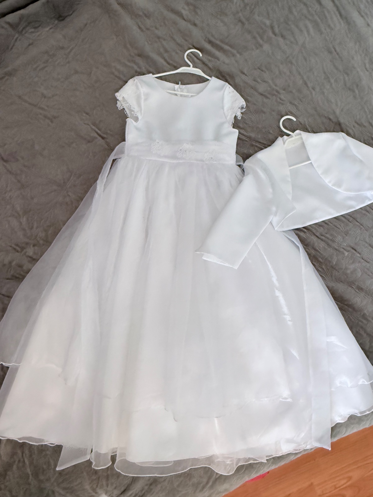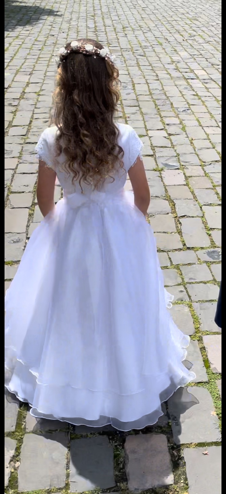 Kvalitné šaty na prvé sväté prijímanie zo svadobného salónu (foto nižšie). Vzadu je zapísanie na zip a mašľu, takže sa dajú pekne prispôsobiť a mašľa pôsobí veľmi pekným dojmom. Majú krátke rukáviky s výšivkou a vyšívka je aj na opasku, ktorý vzadu viete uviazať na mašľu. Šaty majú spodničku do ktorej sa dá pridať kruh, aby šaty pekne držali. Spodnička je však aj bez kruhu pekne “vypodložená”. Naozaj kvalitné spravovanie. Veľkosť je vhodná na 128/134 cm možno aj trošku viac, záleží ako dlhé šaty pre dievčatko chcete, aby sa jej dobre v šatách pohybovalo a nepotkla sa. K šatám je dokúpené aj bolerko, ktoré predávam spolu so šatami. K šatám pribalím aj topánočky veľkosť 31 a bielu čelenku. Všetko bolo oblečené raz na prvom svätom prijímaní a profesionálne vyčistené. Žiadne poškodenia. Úplný tip top stav. Ako nové.