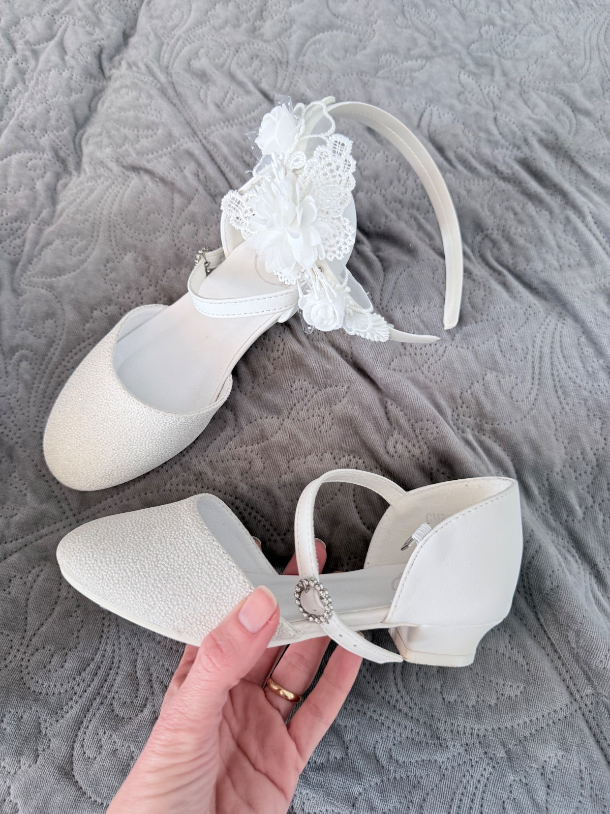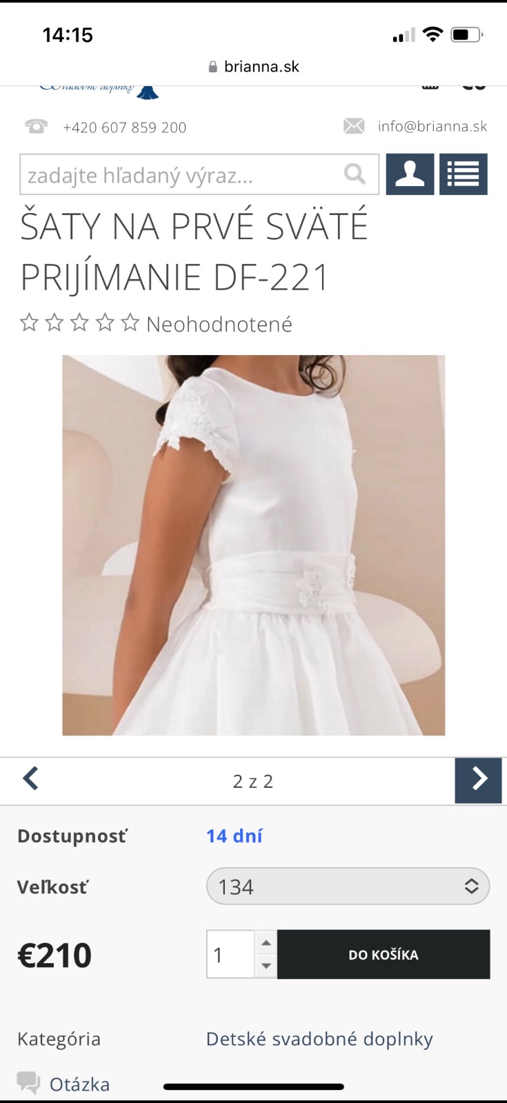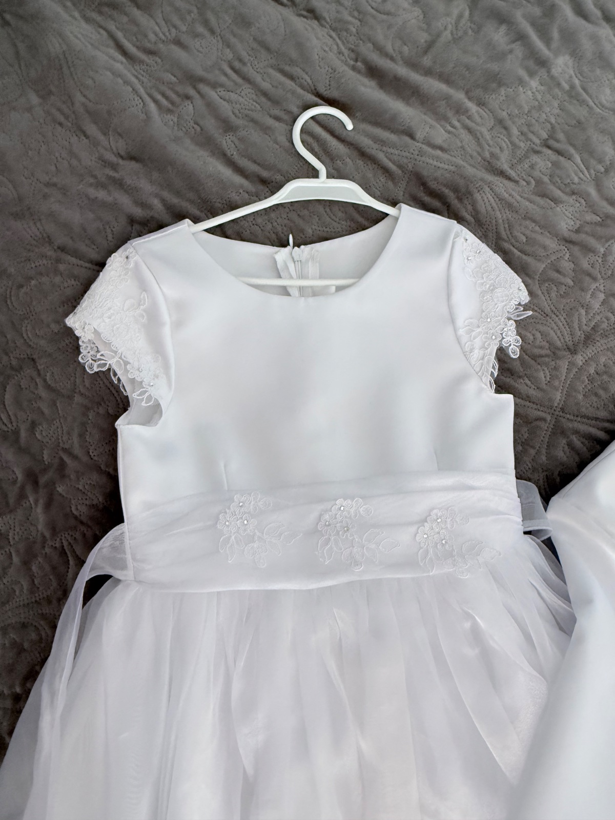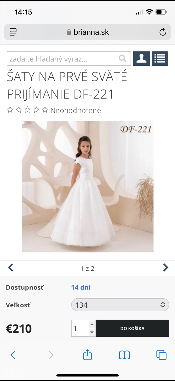 Kvalitné šaty na prvé sväté prijímanie zo svadobného salónu (foto nižšie). Vzadu je zapísanie na zip a mašľu, takže sa dajú pekne prispôsobiť a mašľa pôsobí veľmi pekným dojmom. Majú krátke rukáviky s výšivkou a vyšívka je aj na opasku, ktorý vzadu viete uviazať na mašľu. Šaty majú spodničku do ktorej sa dá pridať kruh, aby šaty pekne držali. Spodnička je však aj bez kruhu pekne “vypodložená”. Naozaj kvalitné spravovanie. Veľkosť je vhodná na 128/134 cm možno aj trošku viac, záleží ako dlhé šaty pre dievčatko chcete, aby sa jej dobre v šatách pohybovalo a nepotkla sa. K šatám je dokúpené aj bolerko, ktoré predávam spolu so šatami. K šatám pribalím aj topánočky veľkosť 31 a bielu čelenku. Všetko bolo oblečené raz na prvom svätom prijímaní a profesionálne vyčistené. Žiadne poškodenia. Úplný tip top stav. Ako nové.