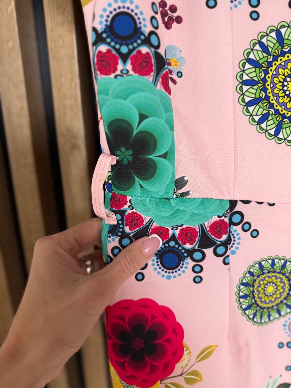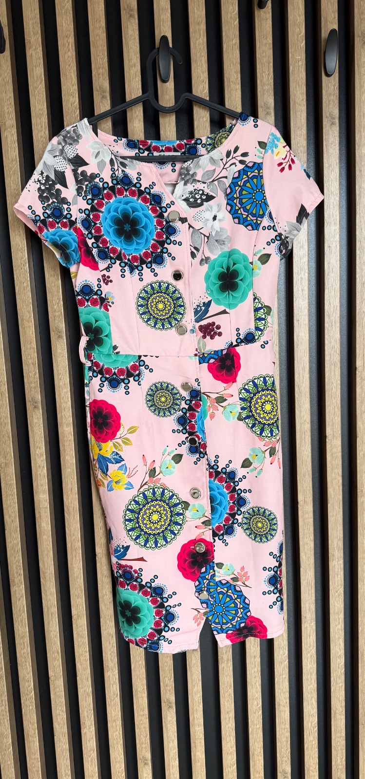Predám krásne dámske šaty bez značky v jemnej ružovej farbe s výrazným farebným kvetinovo-mandalovým vzorom 🌺