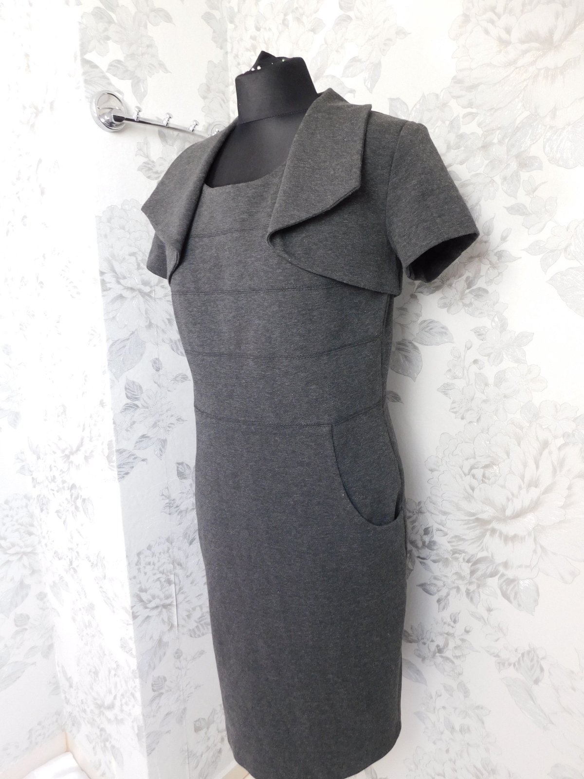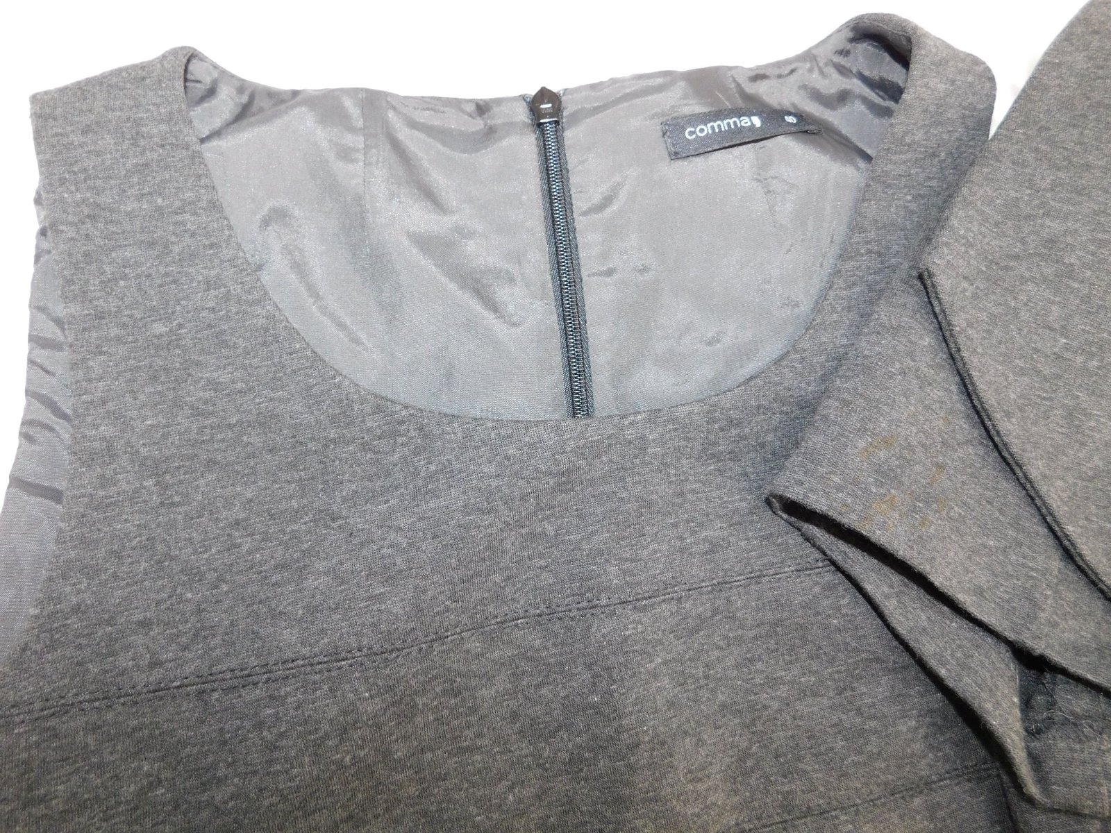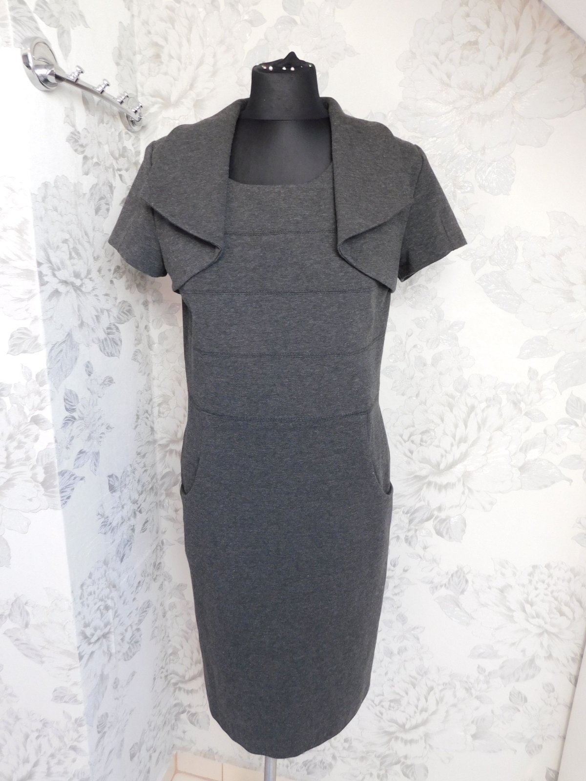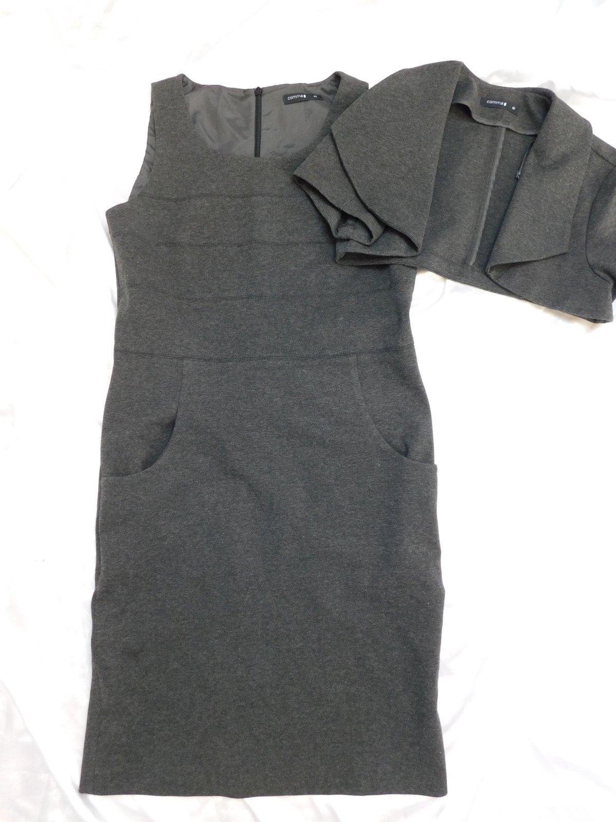 Kvalitne šaty s bolerkom,šedej farby,zo stredne hrubeho upletu,vzadu zips.57%viskoza,39%polyester,4%elastan.super stav. j46