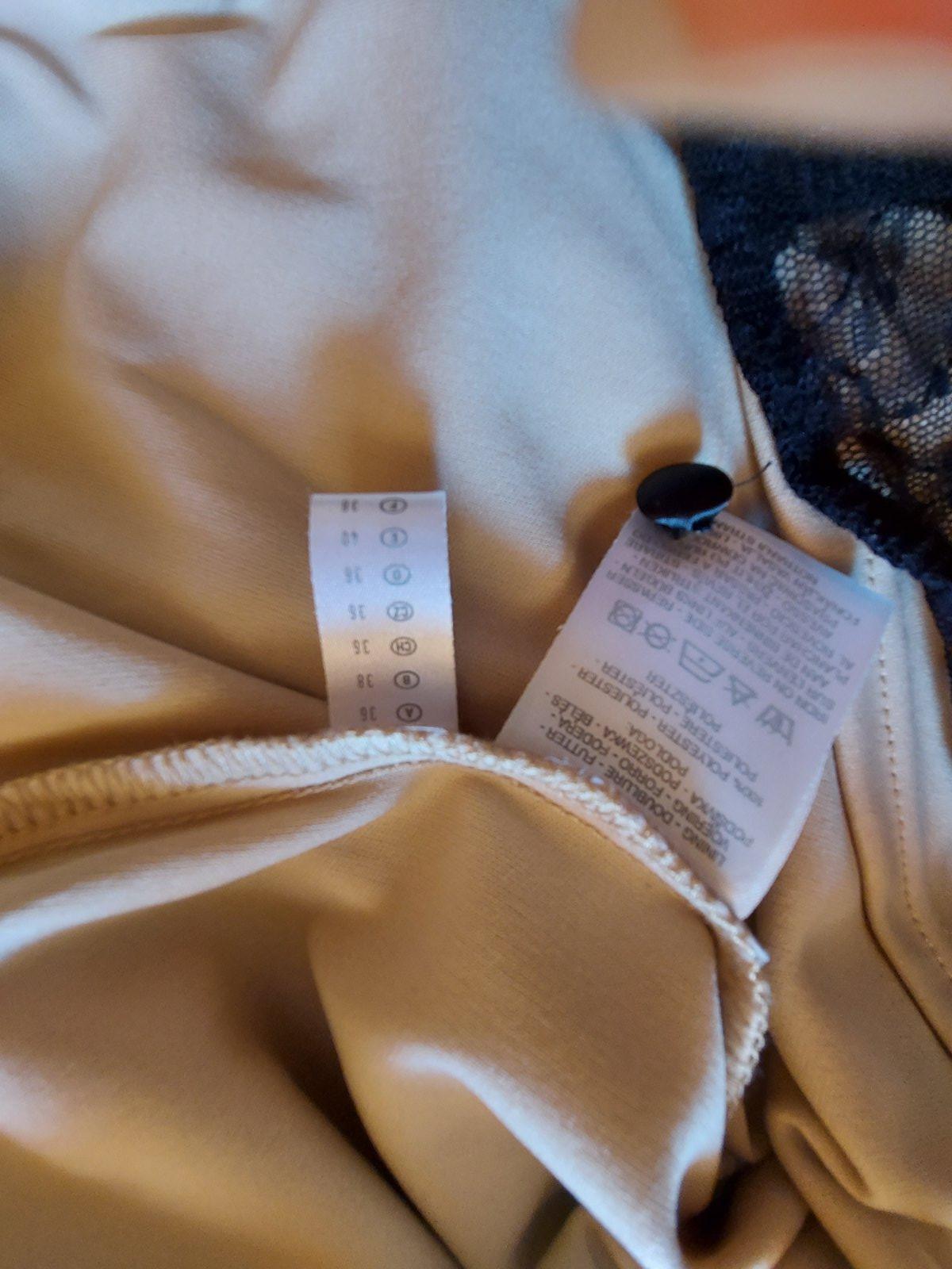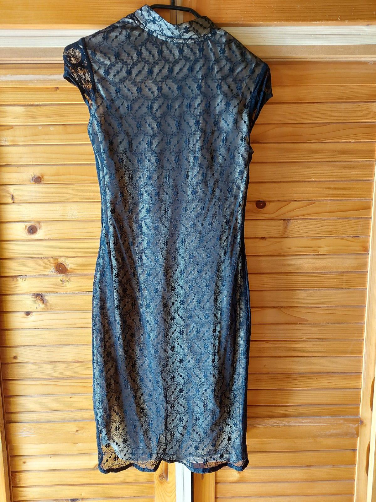Čierne šaty s čipkou s bežovou podšívkou, š. pod pazuchami v kľude-37, dĺžka - 91,5. Elastický materiál. Vrchná časť z čiernej látky -čipka je priesvitná. Zvlášne zapínanie pri krku-viď foto