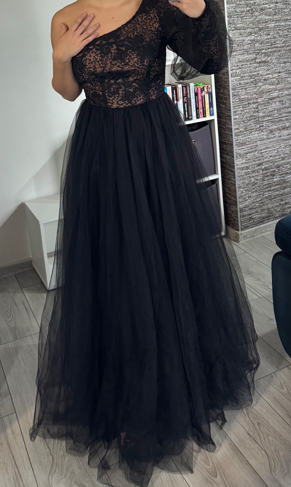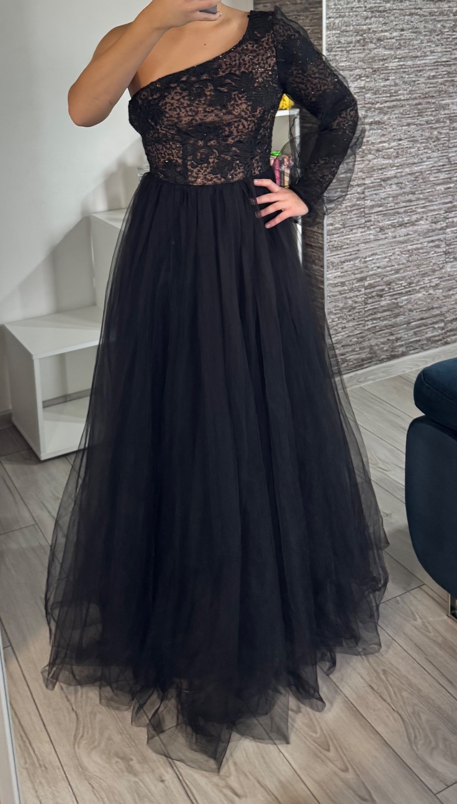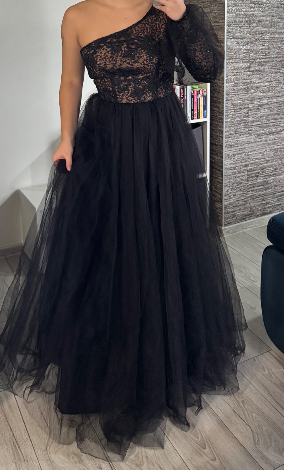 Šaty majú bohatú sukňu romantická krajka a zahalená ruka do tylu - tieto neprehliadnuteľne krásne šaty. Na spoločenskej udalosti sa za vami ponesie závan noblesy, elegancie a ženskosti. Vzadu sa šaty zapínajú zipsom.