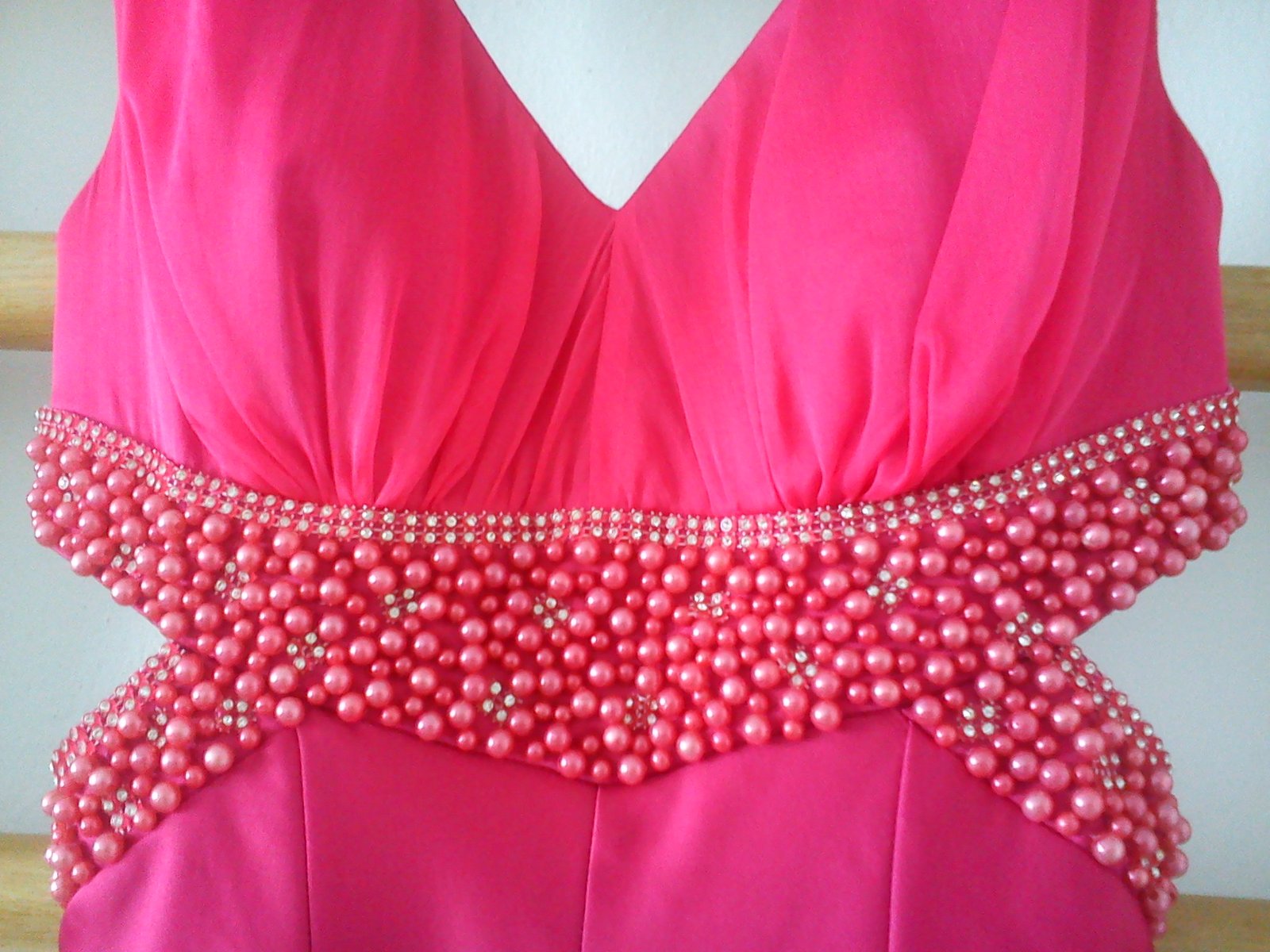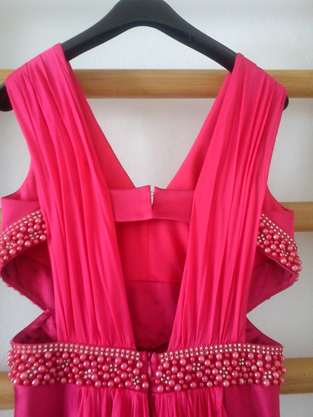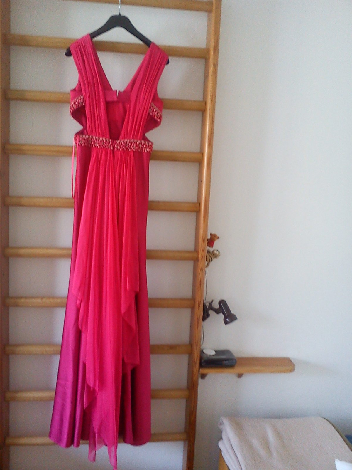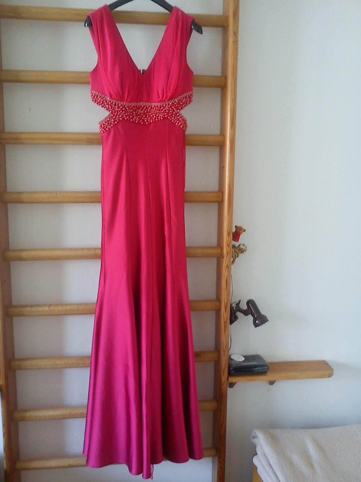 Spoločenské šaty ružovej farby, vysoký predný rozparok, odhalený chrbát, zadný zips, zdobené korálkami, zadný závoj, materiál 100% polyester, nové. Dt 12 b