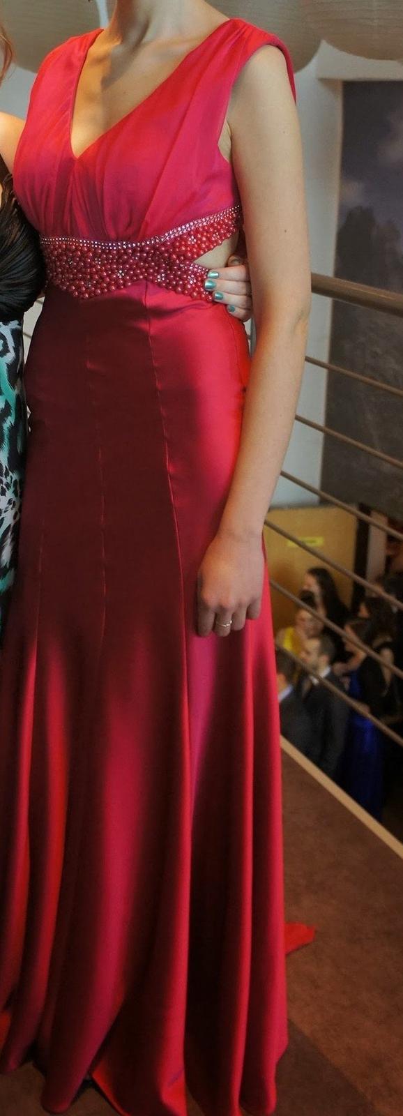 Šaty z takého pevnejšieho saténu, bez poškodení, šité v salóne. Oblečené 2x . Ja mám výšku 158 cm, plus som mala este cca 4cm opätky. Prsia - košíky 75 B. Na chudnutie postavu . Strih je do A, stri...