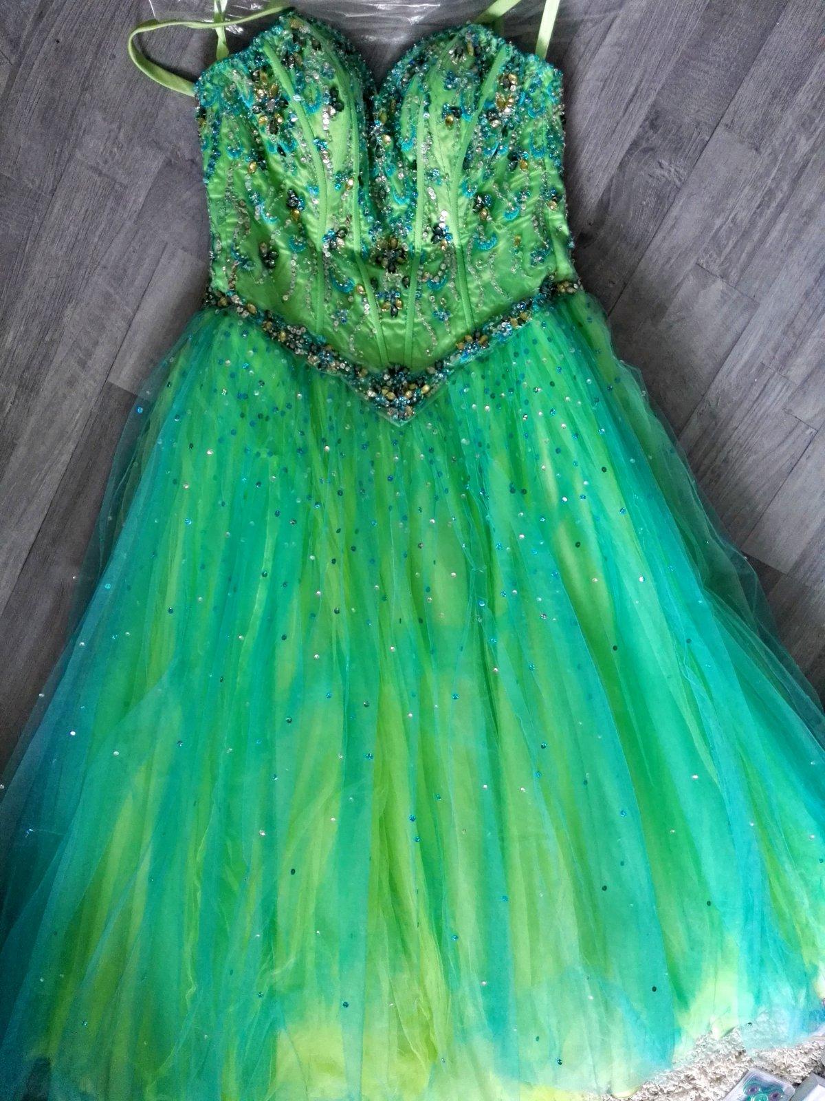 Krásne princeznove saty zo stužkovej, su naspodu trosku zatrhnute ale vobec to nie je vidno. Maju 9vrstiev a snurovacku zozadu, ramienka. Upravene na vysku 175cm bez opatkov