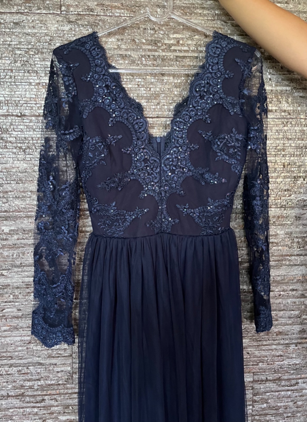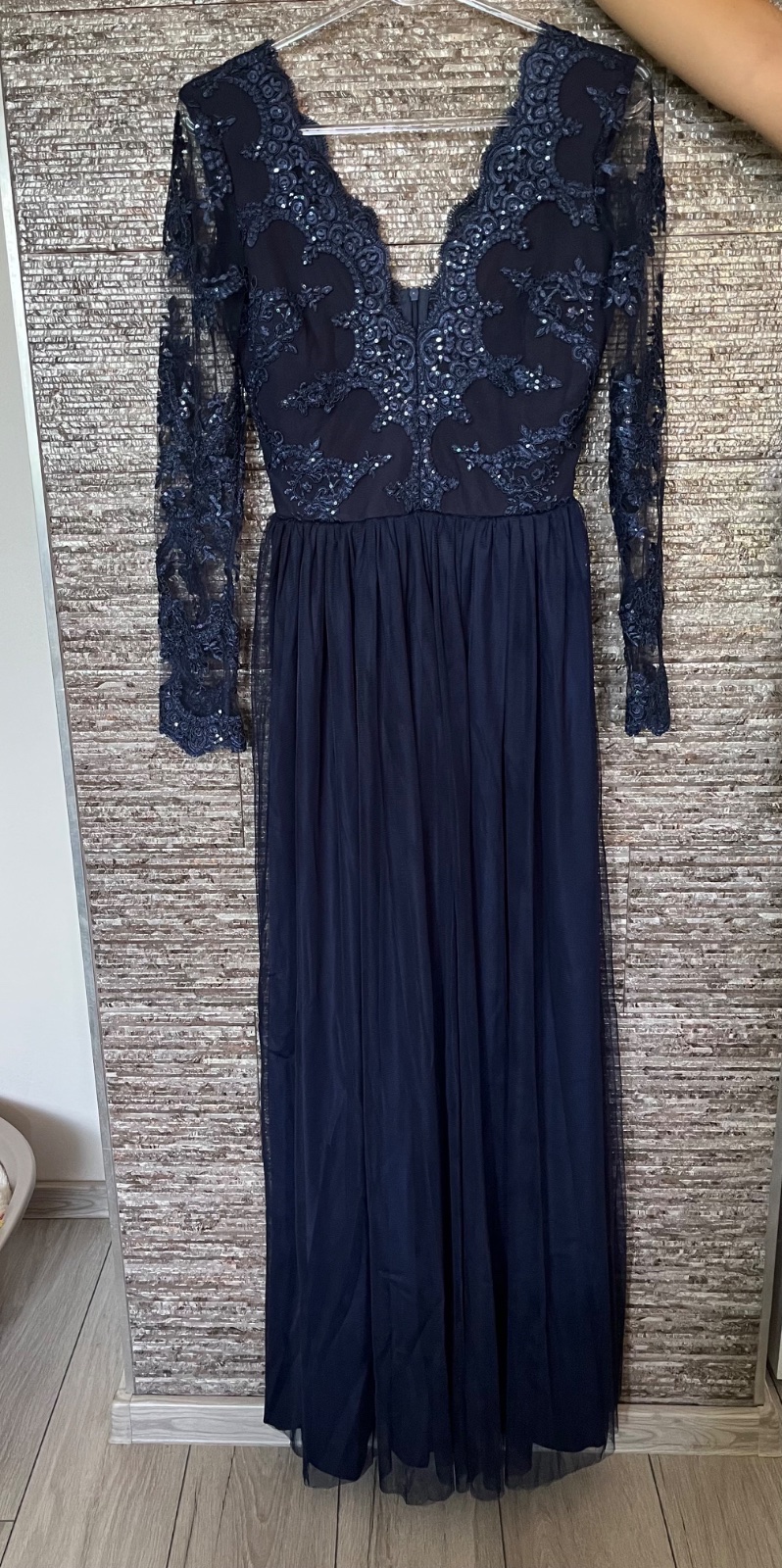 Tmavomodré spoločenské šaty, dokonalé, hore s čipkou, dolu tylová sukňa, viacvrstvá, rozparok na nohe, vzadu na zips, bezkonkurenčne. Raz oblečené, vyčistené, bez známok používania.