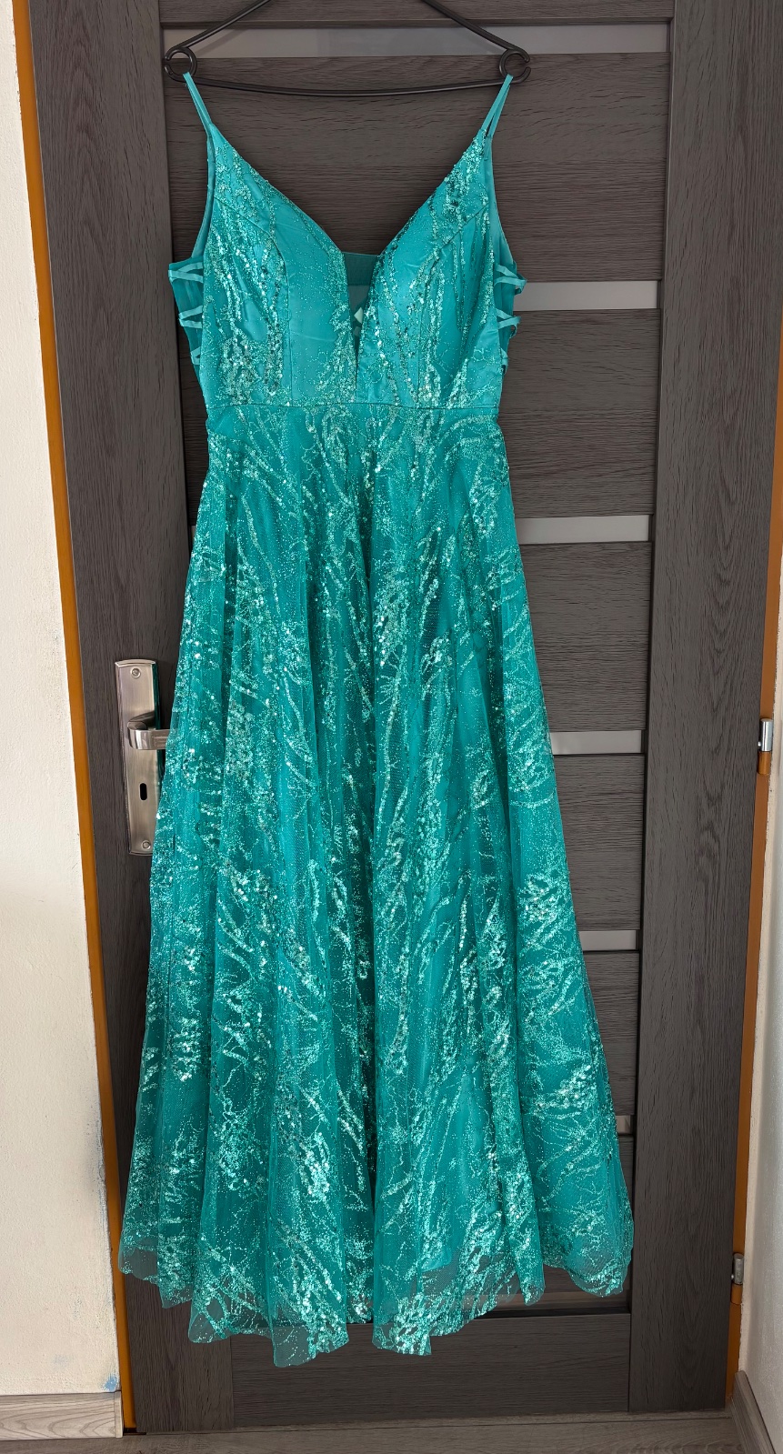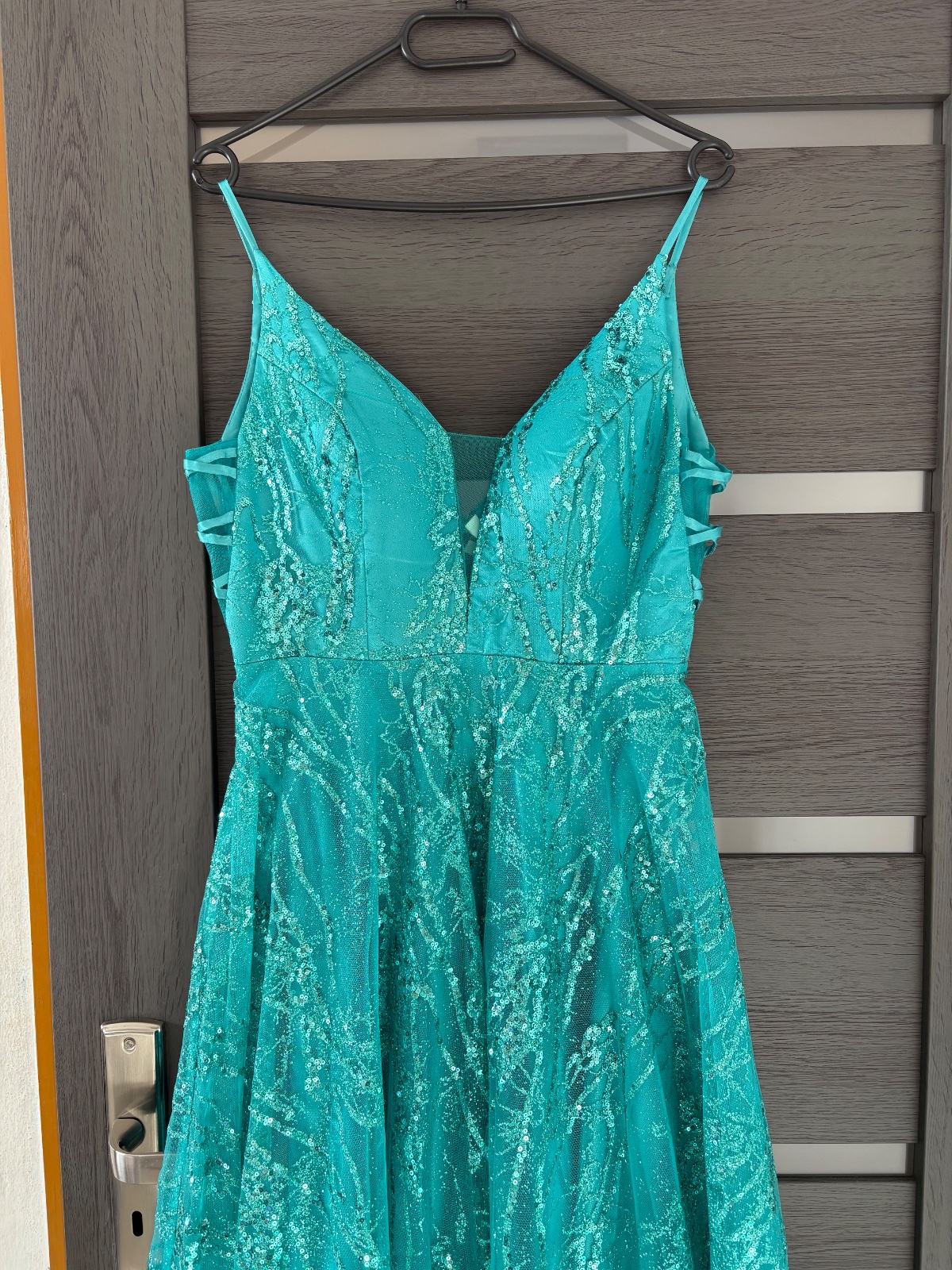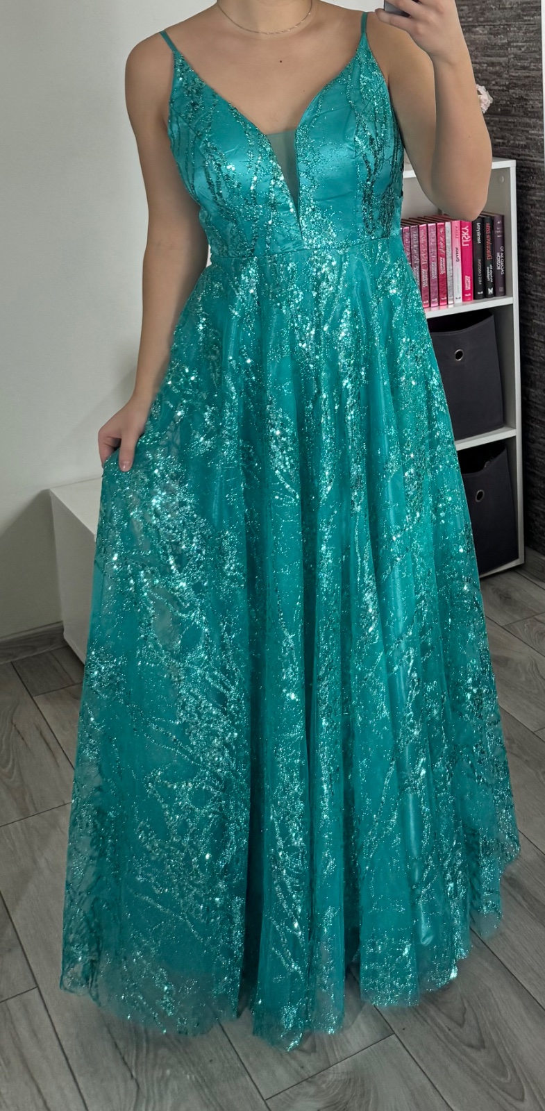 Dámske spoločenské šaty v trblietavom prevedení s véčkový výstrihom. Veľmi luxusný kúsok ktorý očarí každú z Vás a samozrejme aj ostatných okolo Vás. Jemné trblietky zdobia celé šaty. Zapínanie vzadu na zips. Šaty majú vystúžené prsia. Vhodné sú na rôzne spoločenské udalosti ako je svadba, stužková slávnosť či ples.