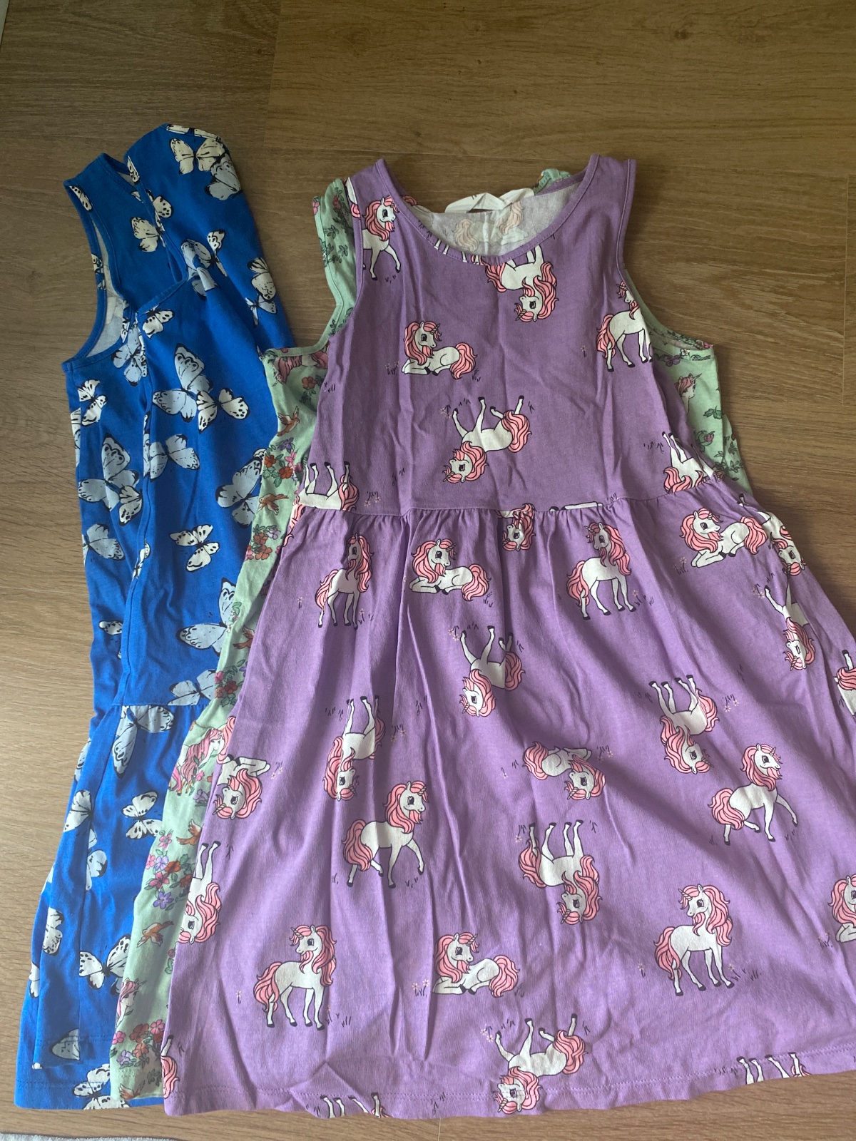 Bavlnené šatky,nenosené, cena á 5€, cena za všetky 10€, veľkosť 134/140, nevhodný darček( veľkosť)