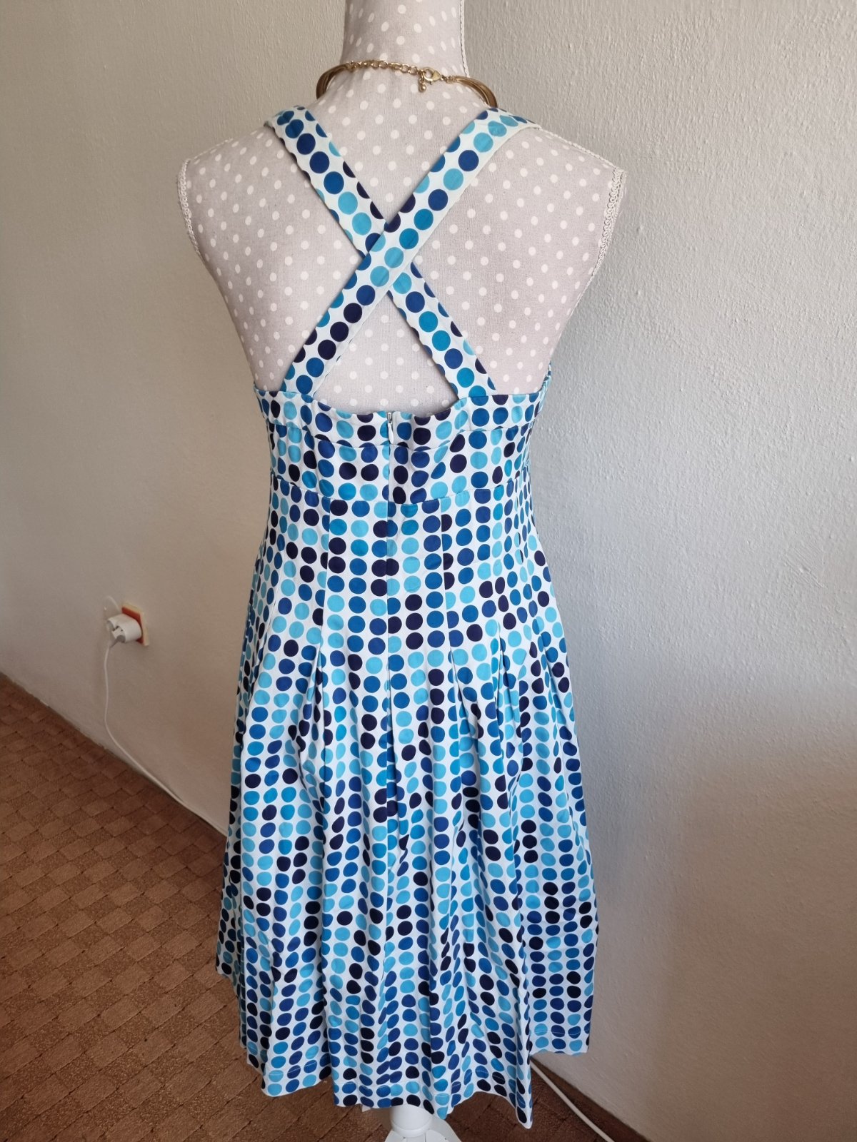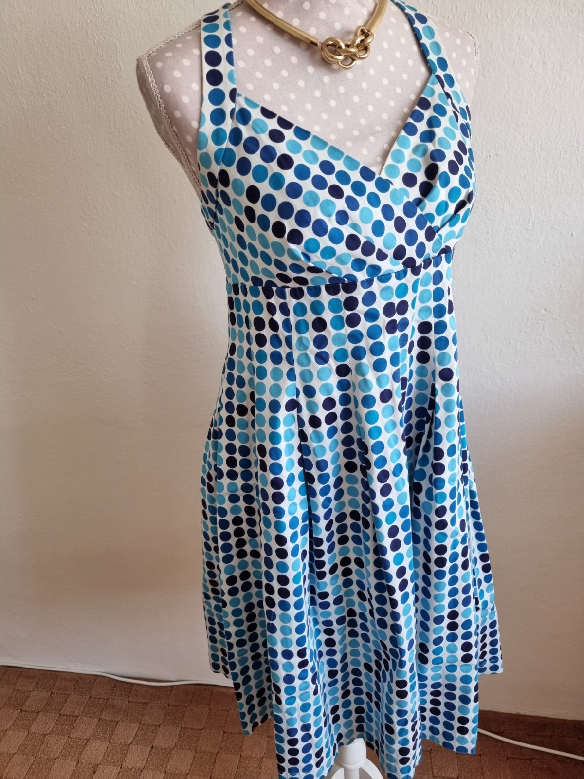 Bavlna s elastanom...dlzka od ramena 100 cm..prsia 48x2 plus minus nejaky cm...pusti...pod prsiami 41x2...boky volne...tyrkysovo modro biele