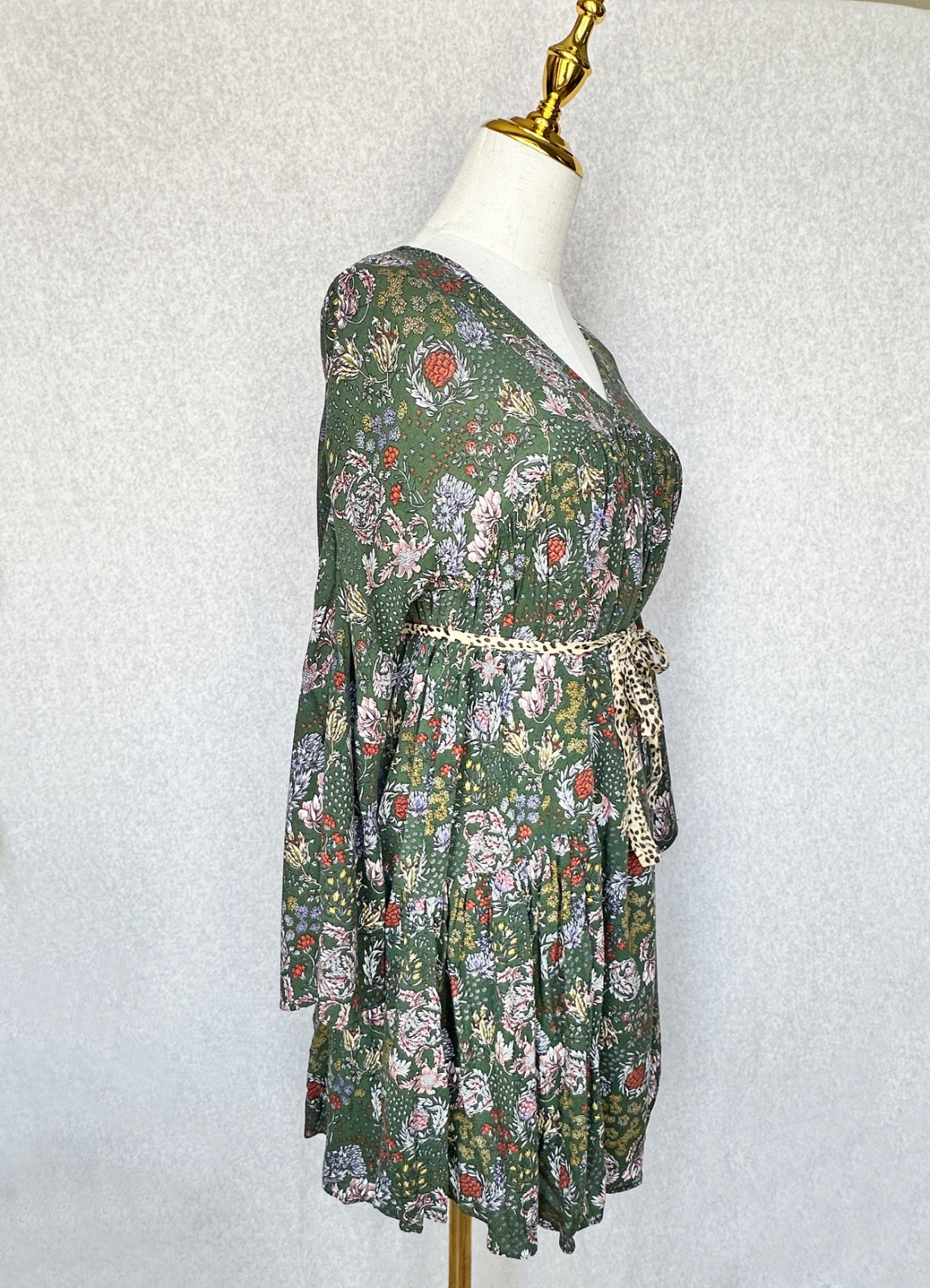 Príjemné šaty so zvýšeným pásom a nariasenými volánmi. Opasok je len ilustračný, nie je k šatám. V super stave, bez poškodení.