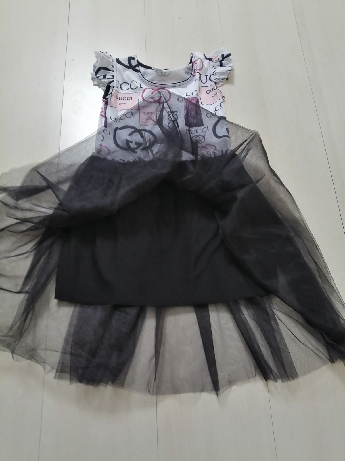 Satecky pre dievčatká čierno bielo ružove vzorovane, 1 x oblečené, obvod hrudníka je 68 cm a dĺžka je 78 cm, spodná časť je 2 vrstvova plus spoločníčka, vrchná časť je elasticka