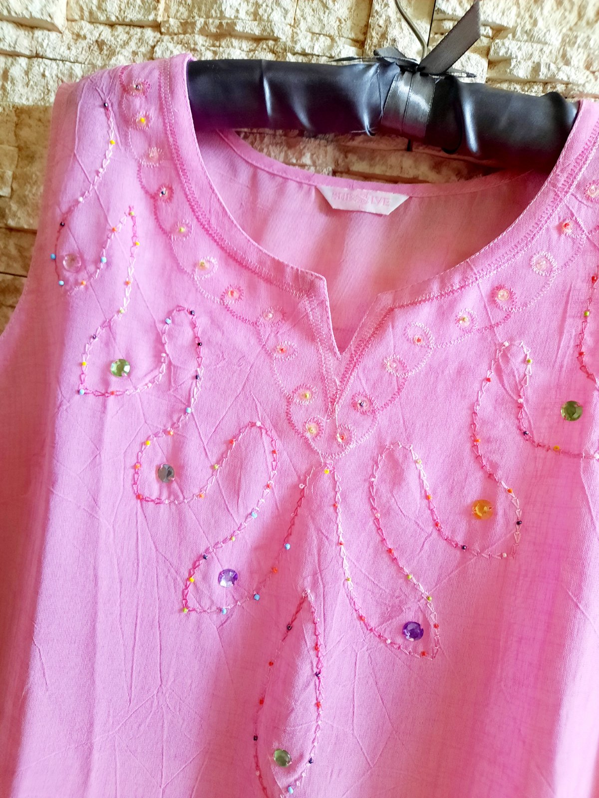 Bez poskodenia, nepruzny materiál, na plavky, vpredu aplikácie, strih mierne do A, príjemný materiál, dl 90 cm, šírka cez prsia 56 cm, CENA VRATANE POSTY obyč.