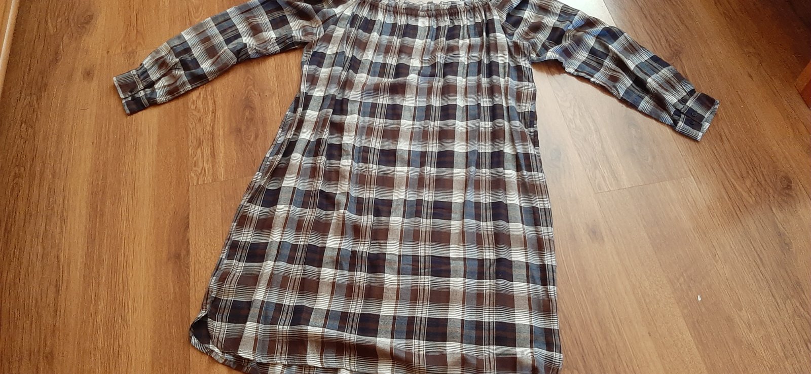 Vrch je do gumičky - spadne na ramená, spodok je šitý do oblúka. Dĺžka 100, pod pazuchami 62, ešte sa trochu natiahne, rukáv až ku krku 62, zakončený na gombíky.