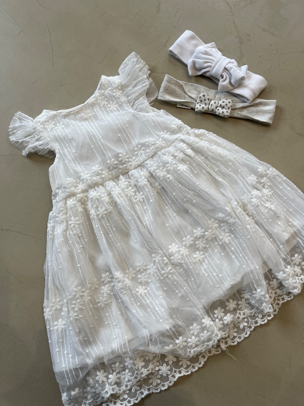 Šaty oblečené 2x na fotku. Veľkosť 74, ale sedí aj na 80 (na foto mala dcéra 11 mesiacov).