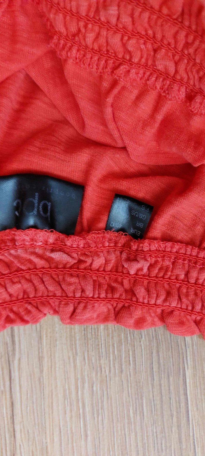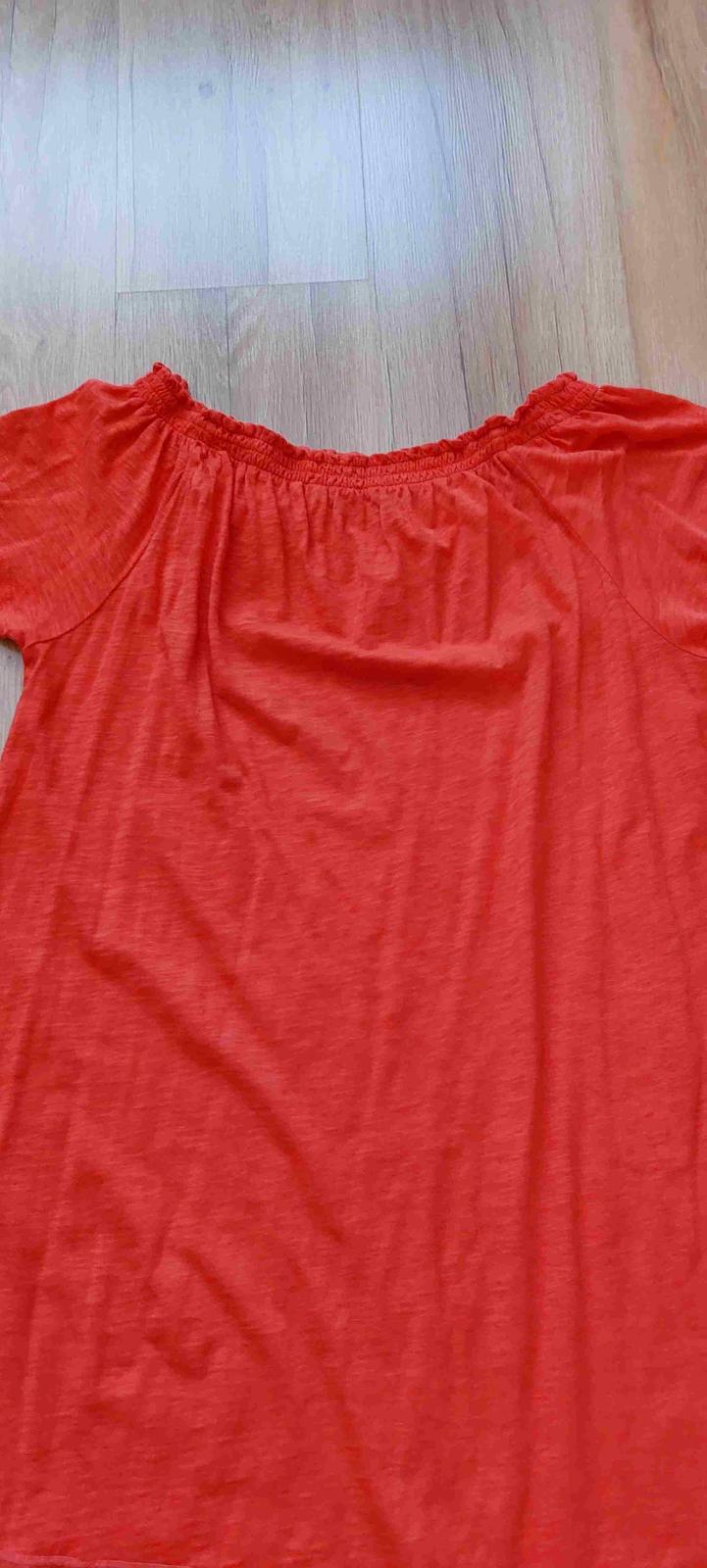 Červené šaty s uzlíkom na boku, vďaka ktorému pekne zamaskujú aj menšie bruško :) Tenšia bavlna, príjemné a pohodlné. Nenosené, zabudla som na ne, a už sú mi veľké. Veľkosť 40/42, dĺžka 89cm, šírka...