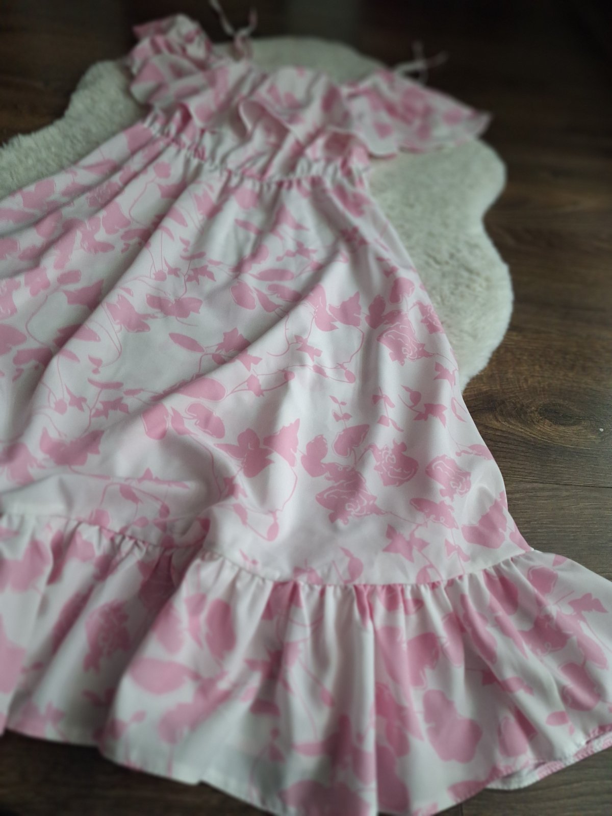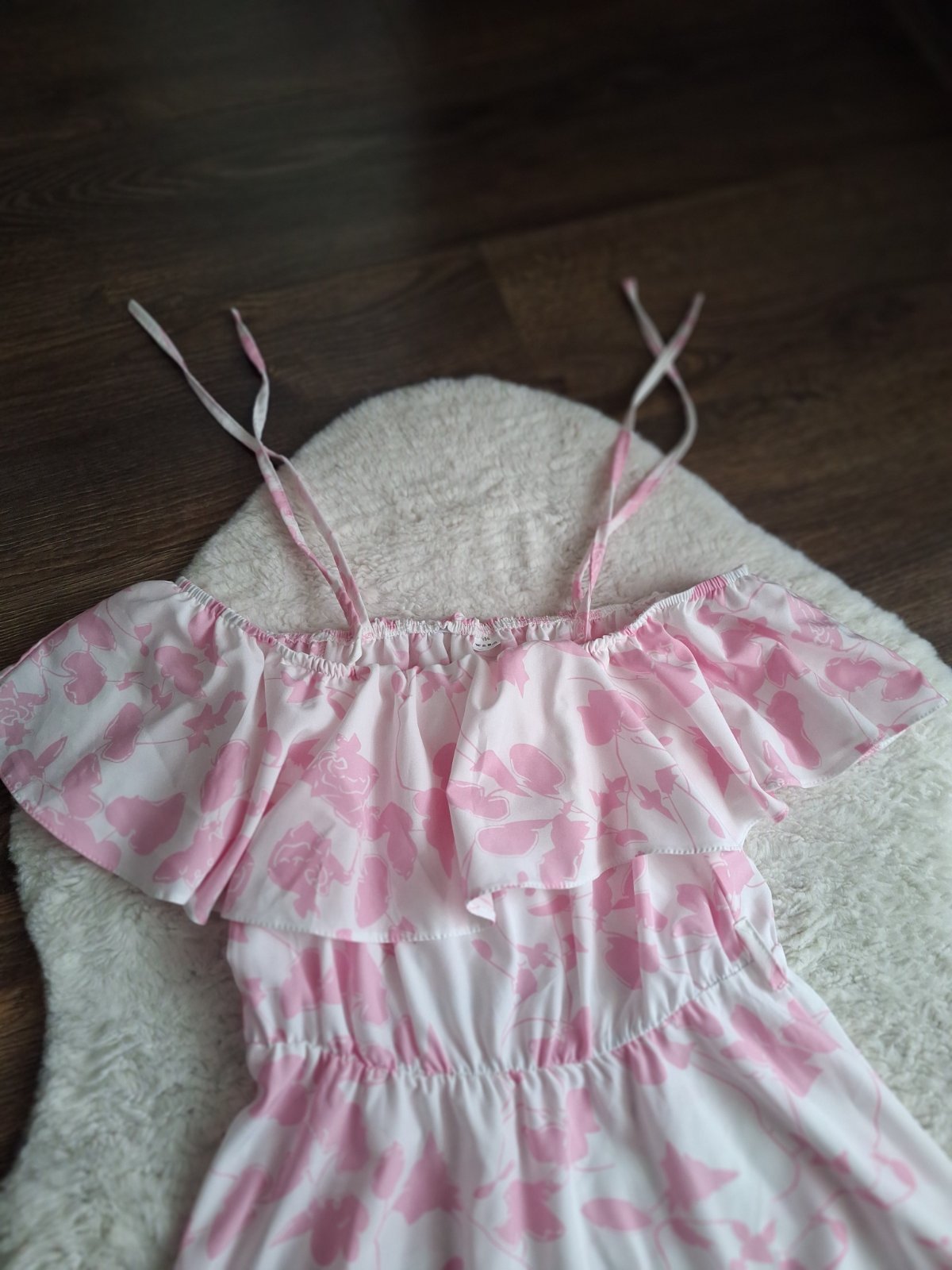 Šaty bez poškodenia dajú sa na ramenách zaviazať alebo môžu byť spustené, v páse gumička, dĺžka bez viazania 85cm cez prsia 2x40cm pás 64-86cm