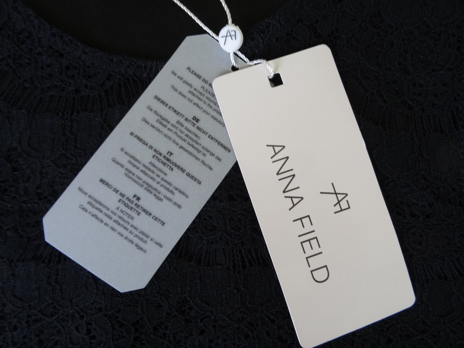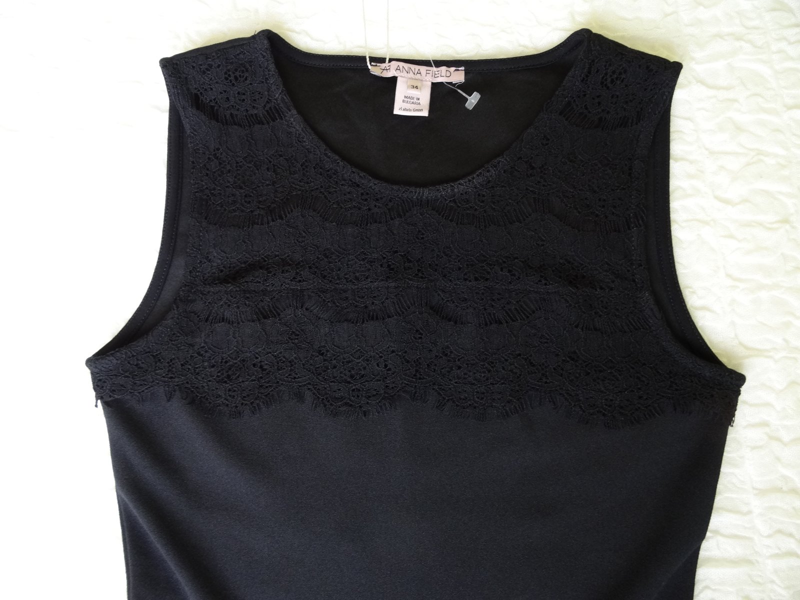 Nové dámske šaty zn. Anna FIELD, veľ. XS, rozmery: dlžka 90cm, pod pazuchami 39cm, pás 33-38cm. Na prednom diele vo vrchnej čati vložená čipka. Šaty sú elastické, materiál padavý.