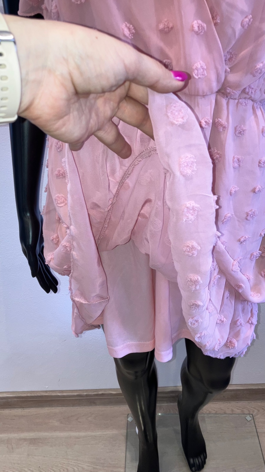 Dámske krátke šifónové šaty s rozšíreným rukávom, mini šaty s výstrihom do V, pás na gumu, jednofarebné s 3D bodkovaným vzorom. Podšité, teda nie sú priesvitné.
