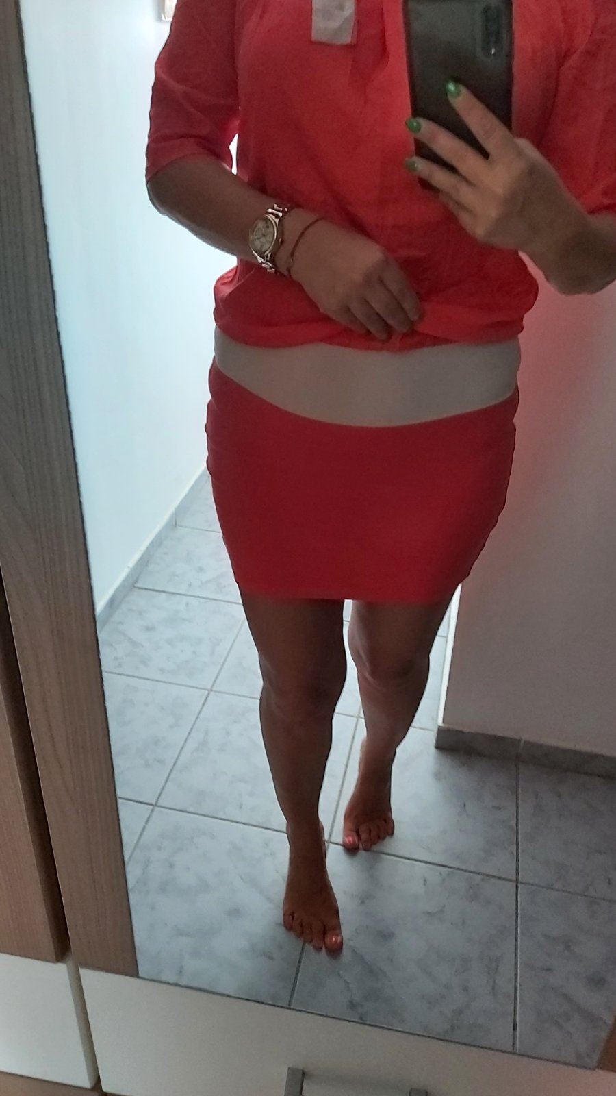Damske saty lososove🧡krasne sedia,uplne pohodlne.Su elasticke.Dlzka 90cm a cez prsia 45cm.Sedia na M,L 💯💯💯stav