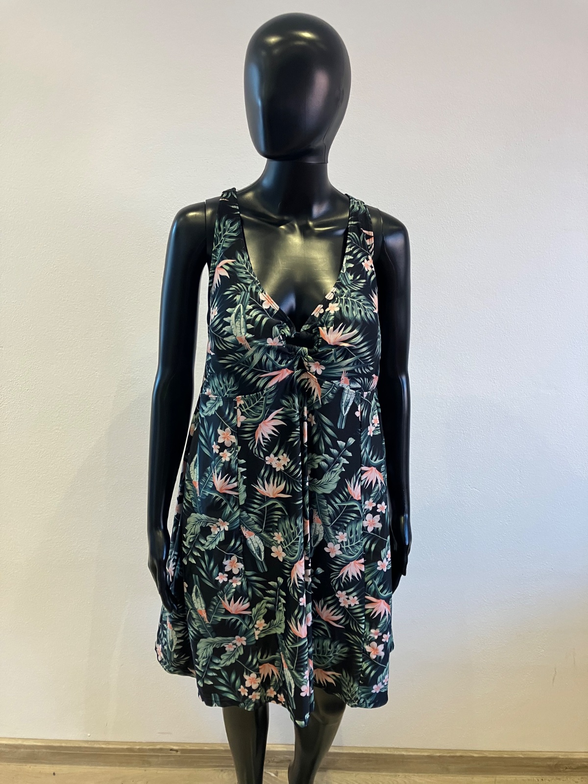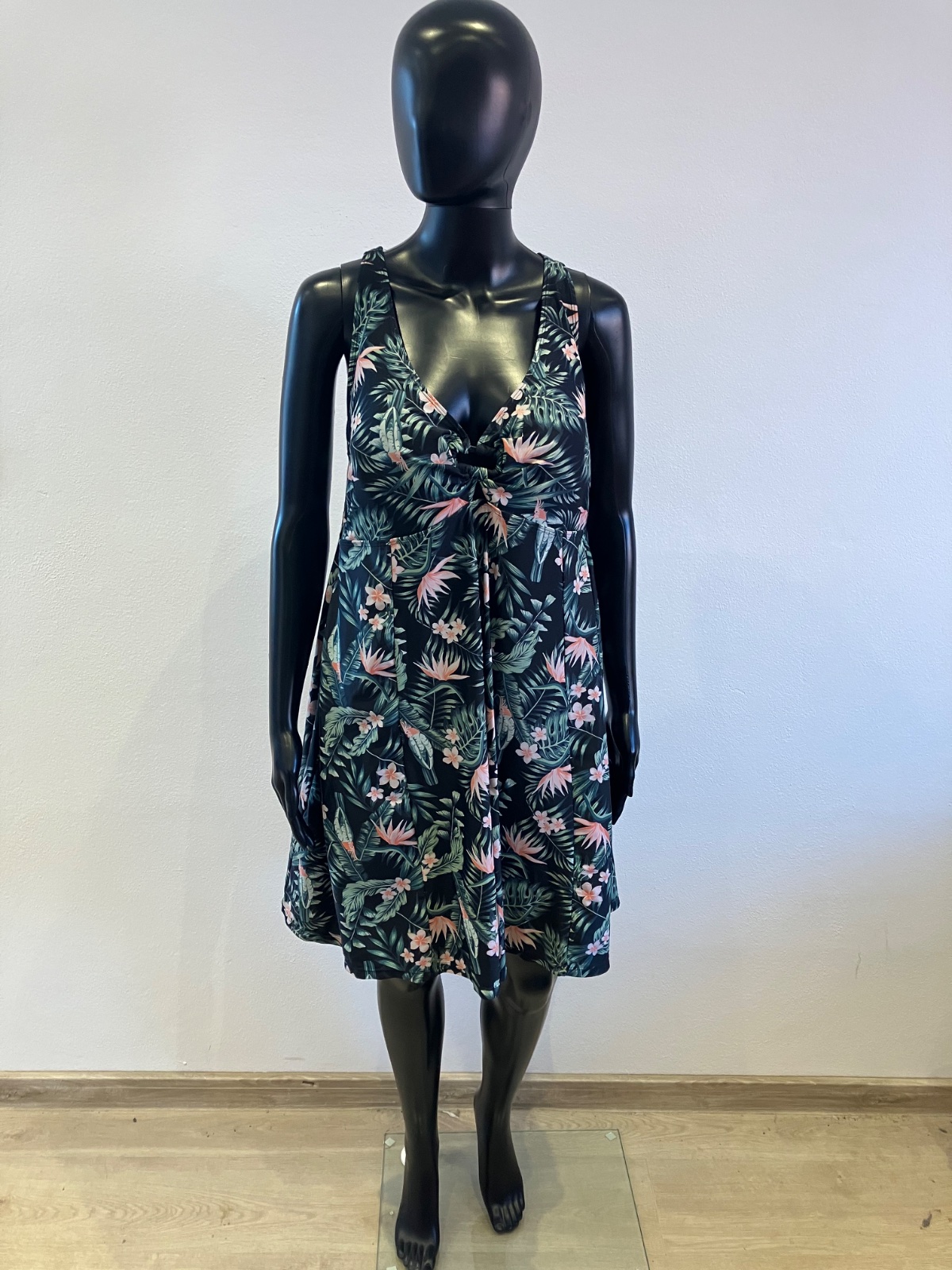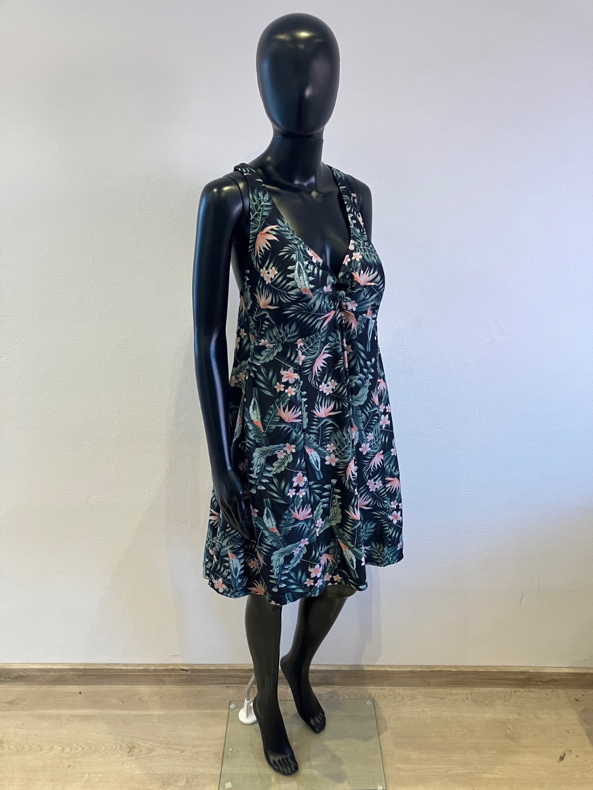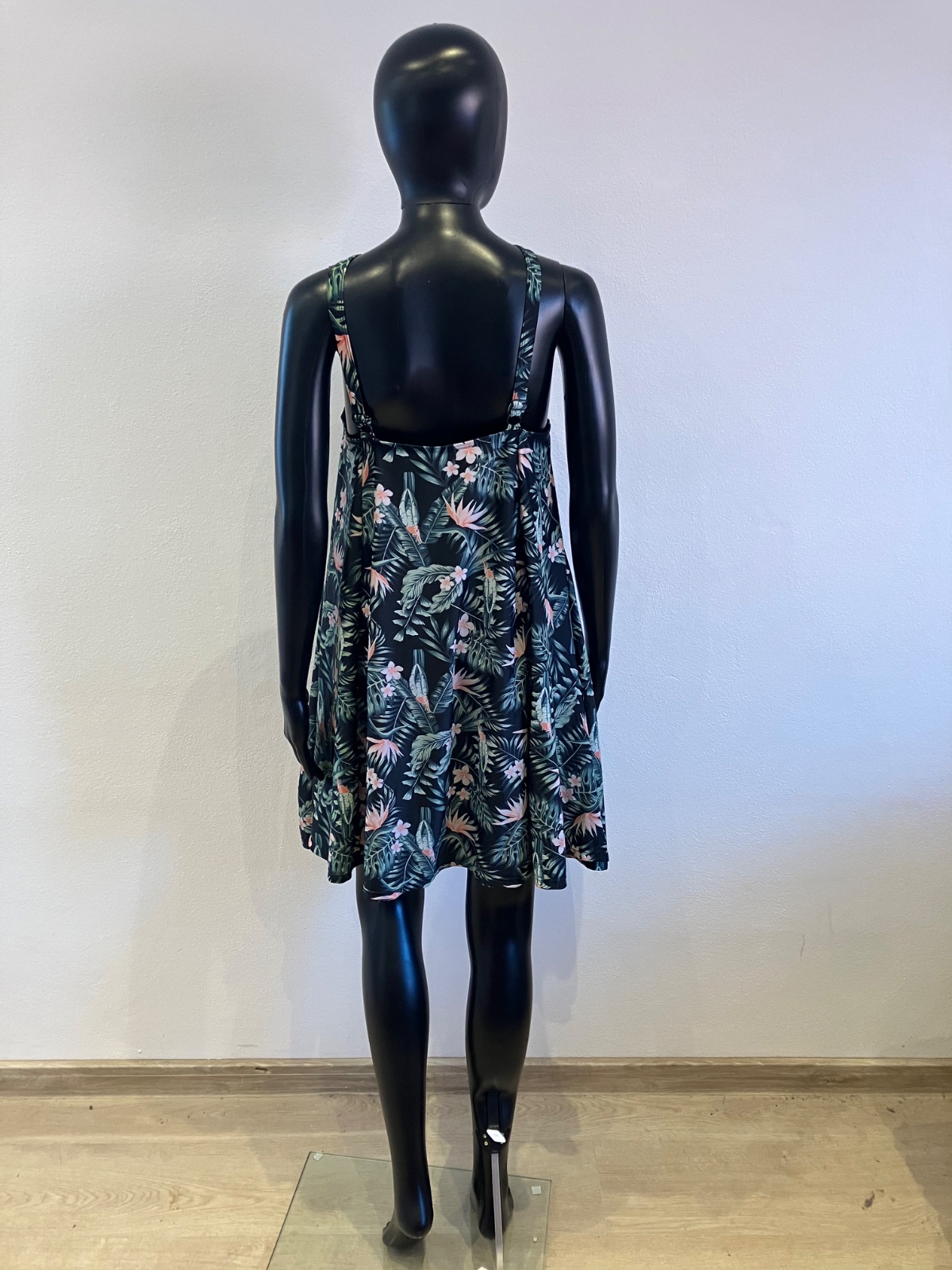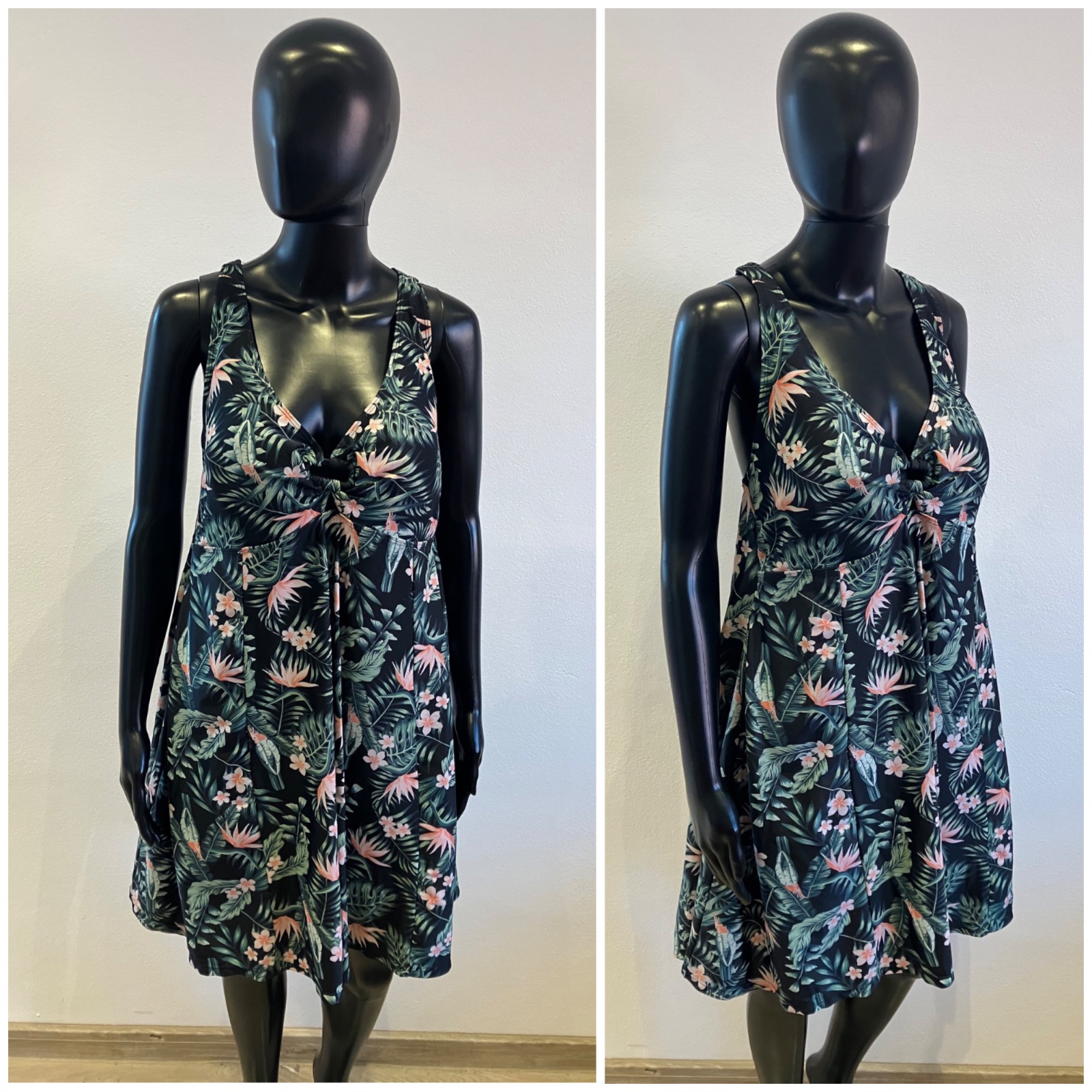 Dámske šaty na hrubé ramienka, vzorované, farba čierno-zeleno-ružová, elastické, s vypchávkami na prsiach, pod šatami sú prišité čierne body, nastaviteľné ramienka, veľkosť cca L.
