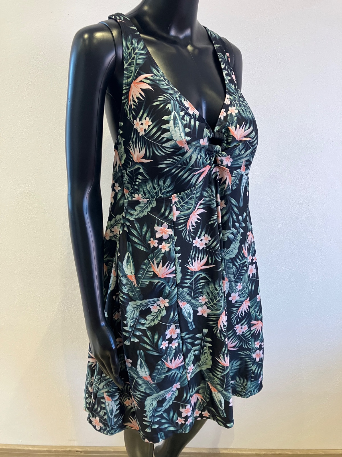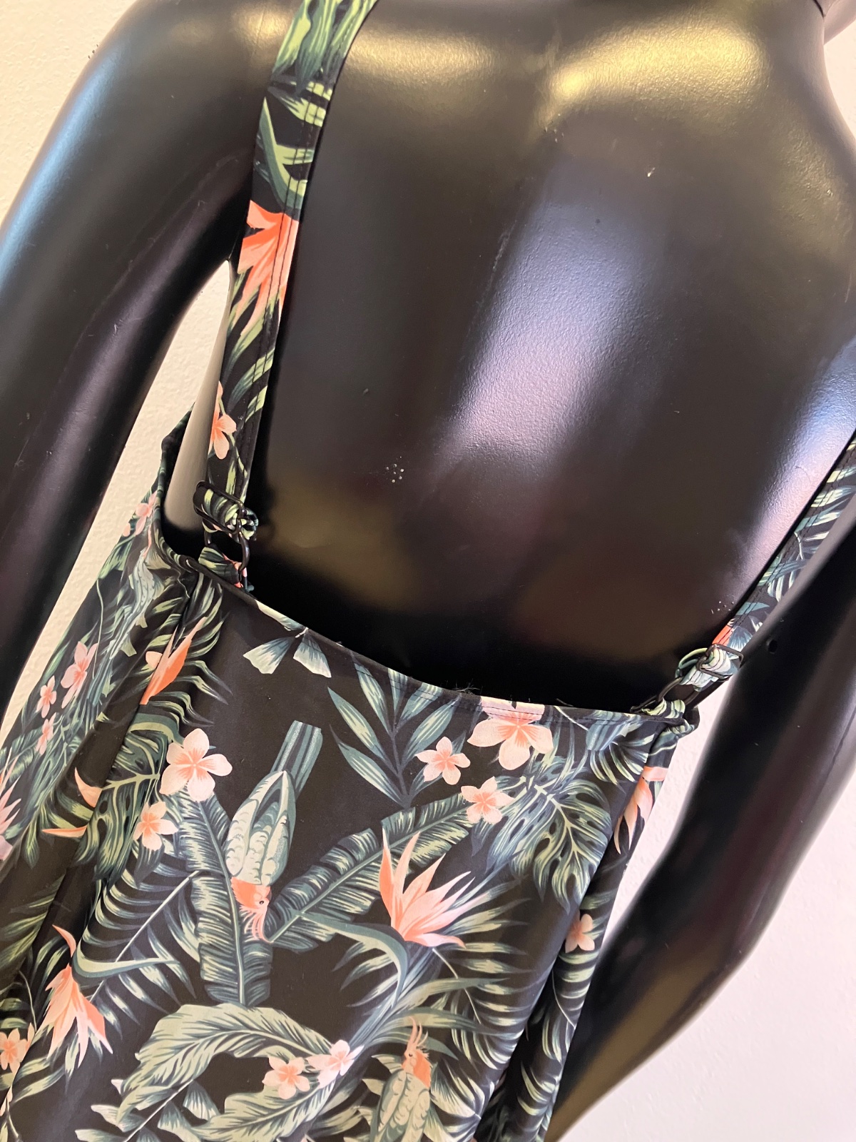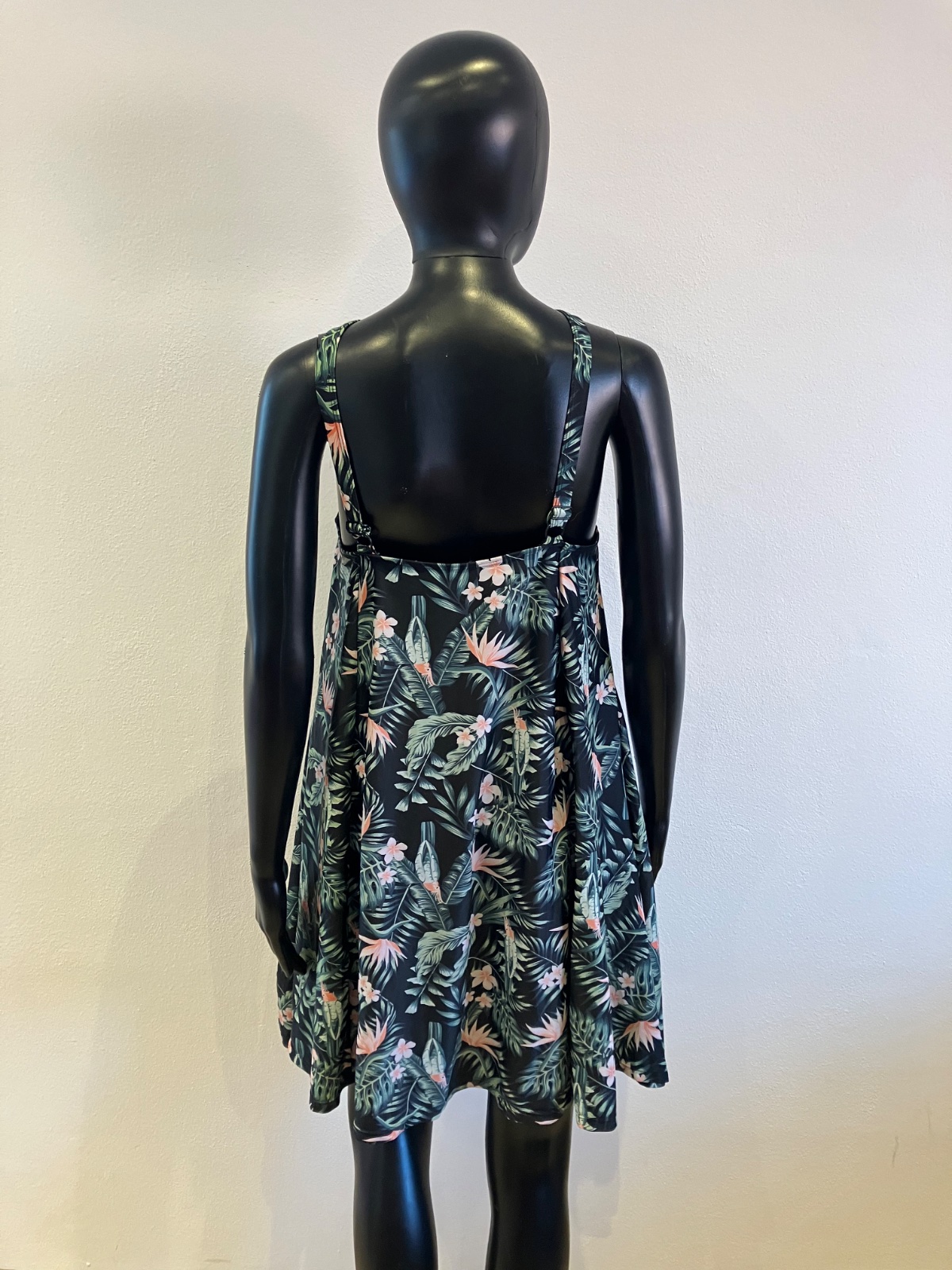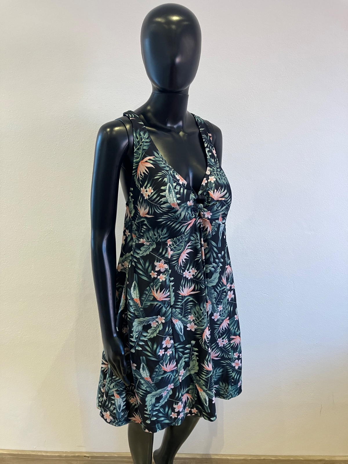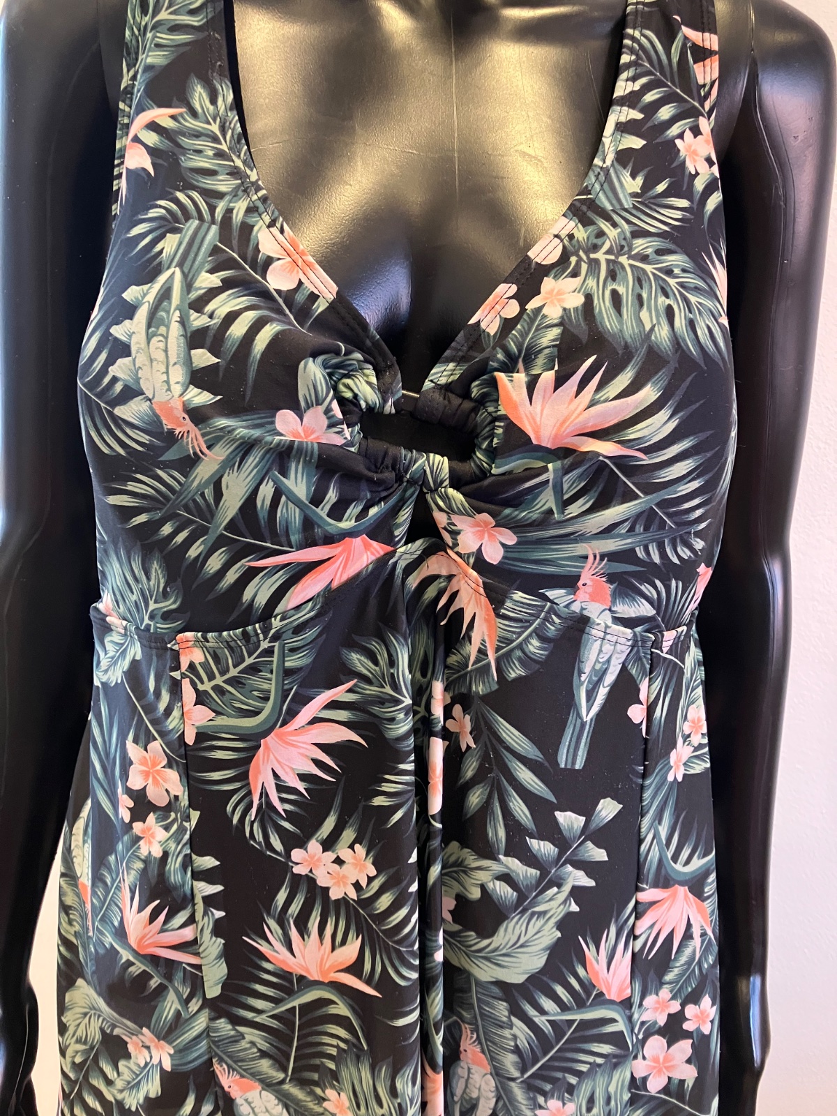 Dámske šaty na hrubé ramienka, vzorované, farba čierno-zeleno-ružová, elastické, s vypchávkami na prsiach, pod šatami sú prišité čierne body, nastaviteľné ramienka, veľkosť cca L.
