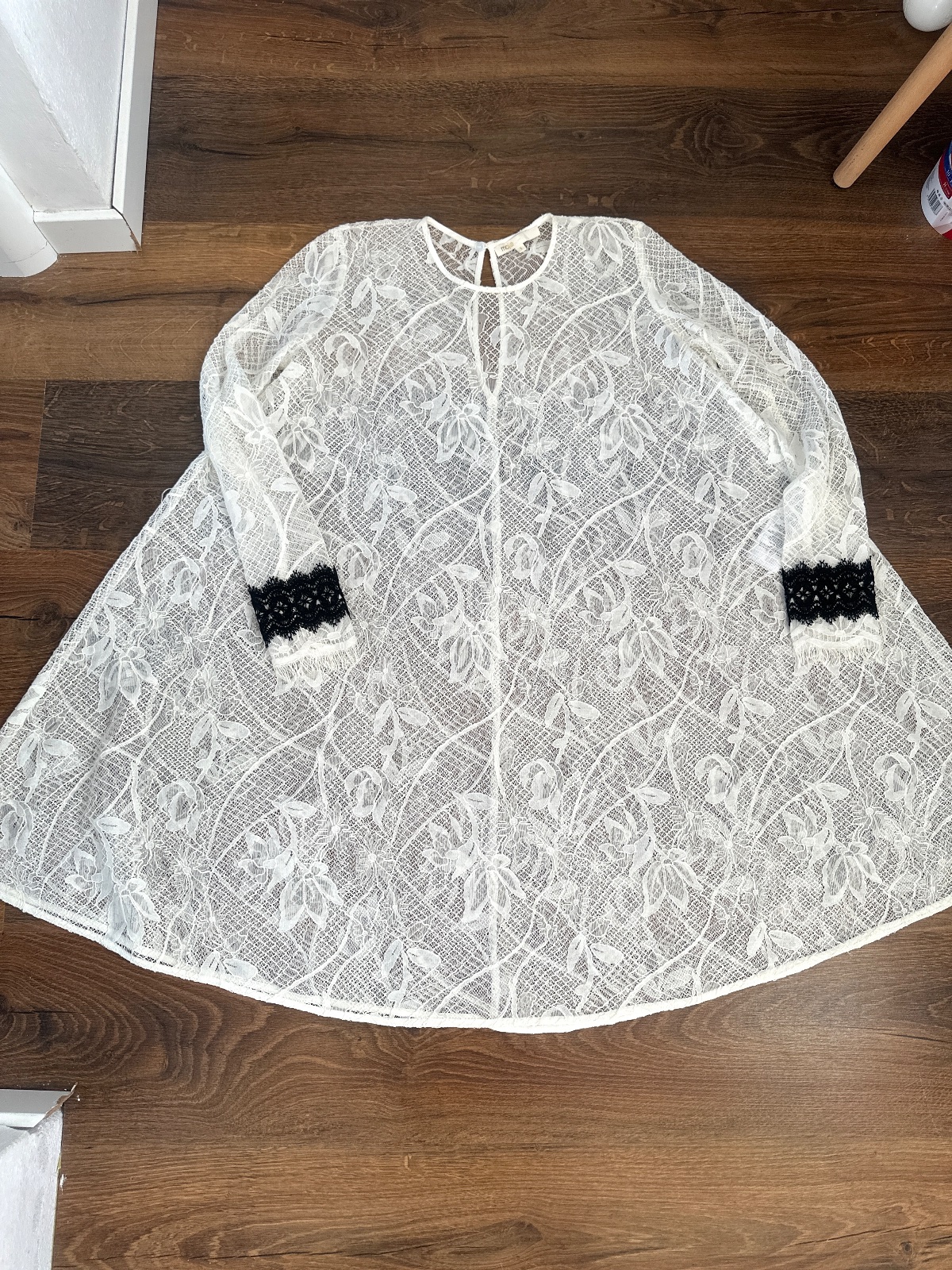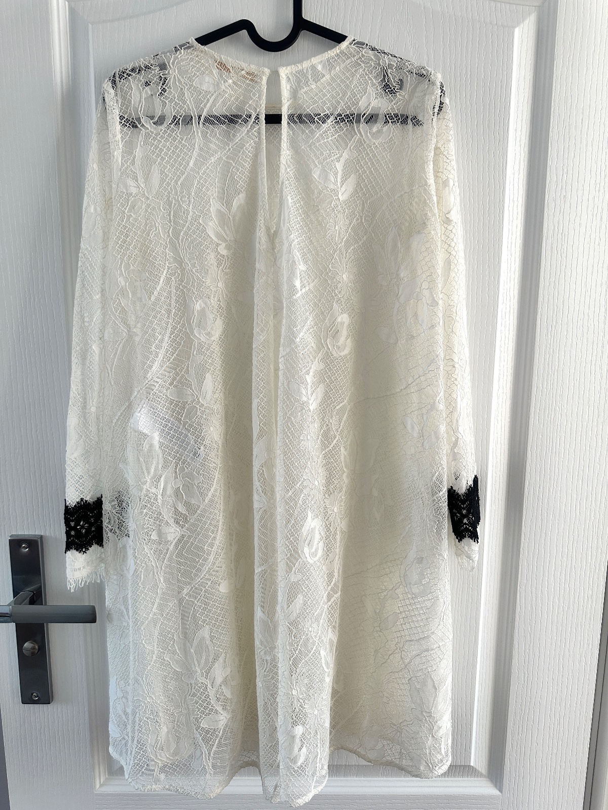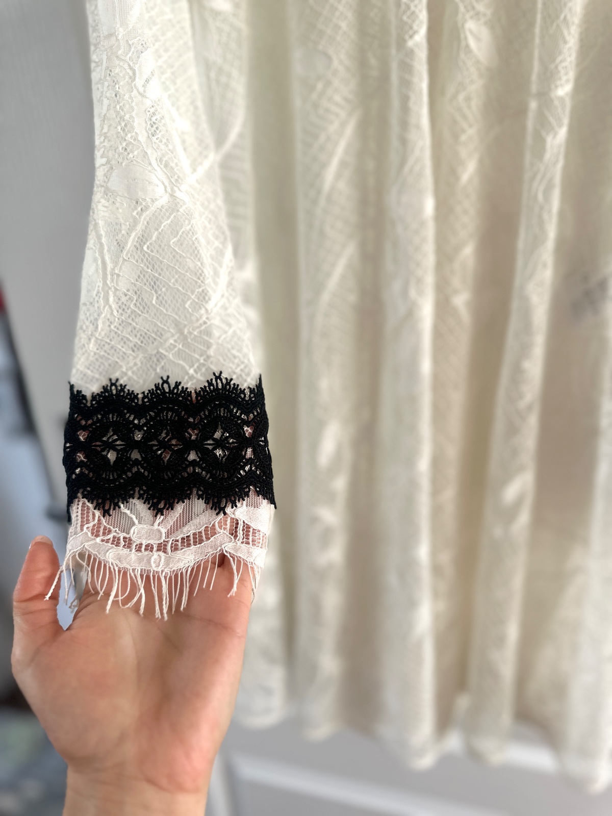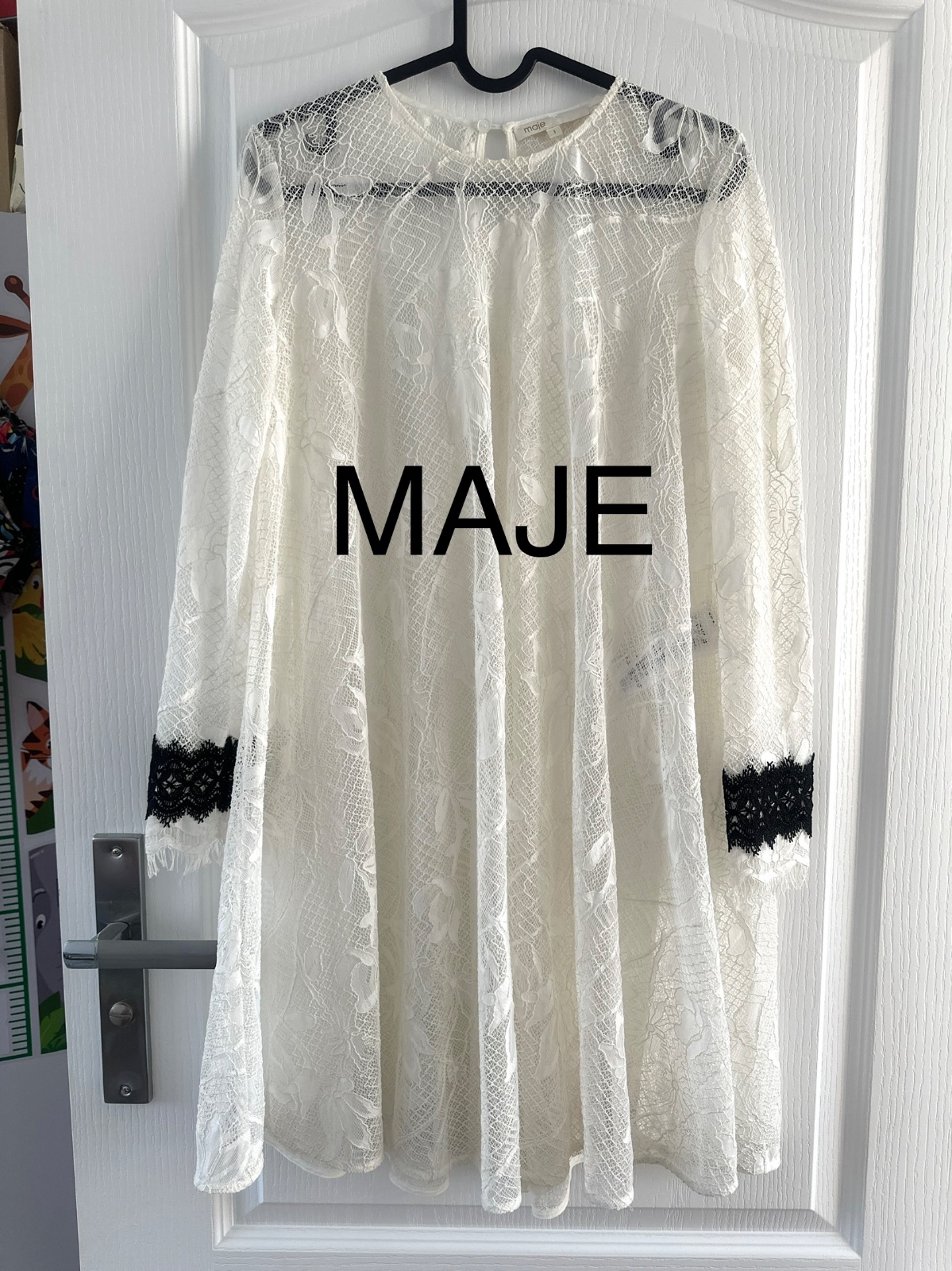 Čipkované šaty francúzskej značky Maje v krásnej krémovej farbe. Majú dlhé rukávy s ozdobnou čiernou čipkou, okrúhly výstrih a zapínanie na chrbte. Sú vyrobené z kruhového strihu, ktorý vytvára áčkový strih. Krásne padnú na postavu. Sú perfektným outfitom na Štedrý deň, Silvestra alebo karnevalovú párty. Šaty pôvodne mali čiernu spodničku s úzkymi ramienkami. Môžete si ich kúpiť v obchode s bielizňou. Štítok uvádza francúzsku veľkosť 1, čo zodpovedá veľkosti S; všetky miery sú uvedené na fotografiách.
