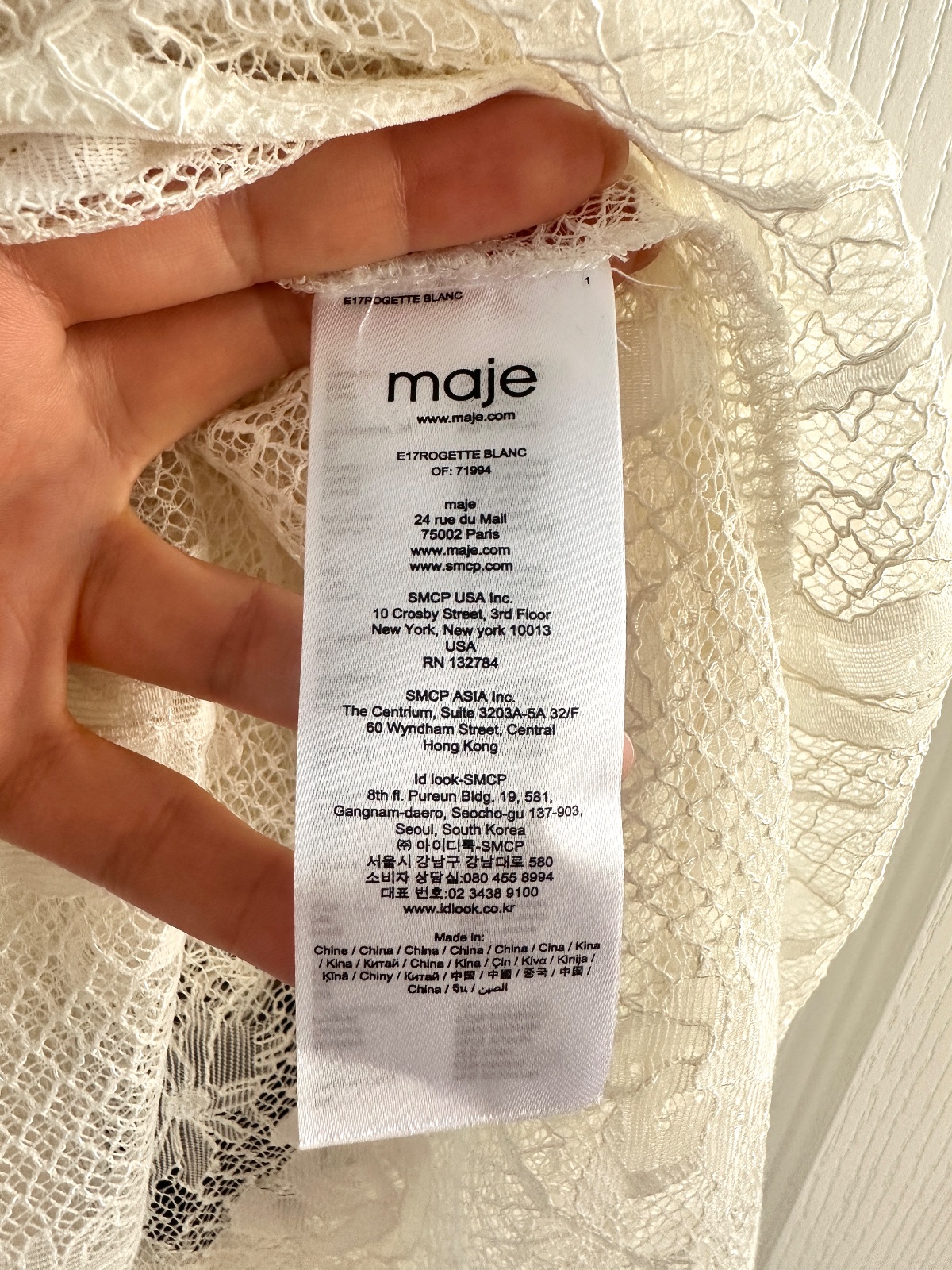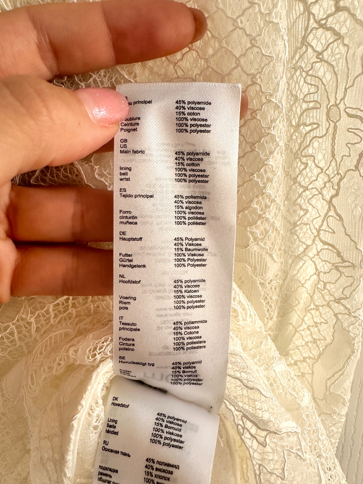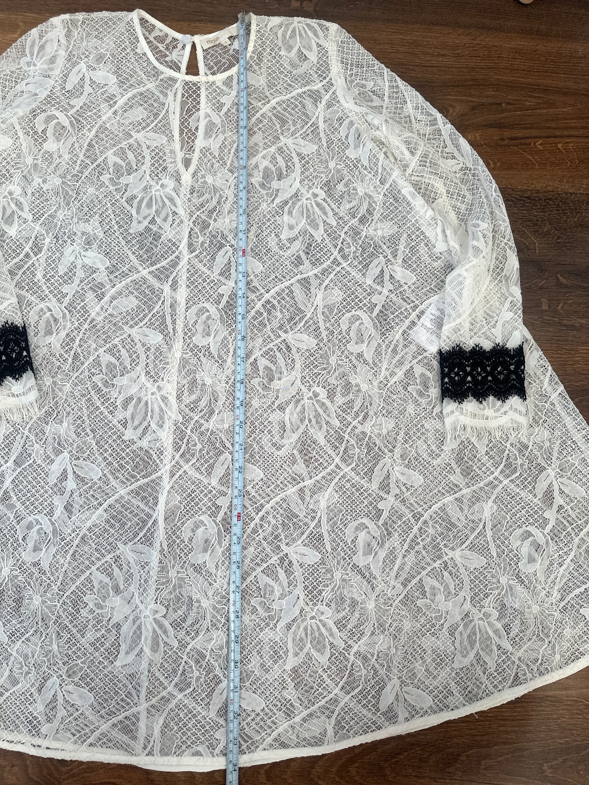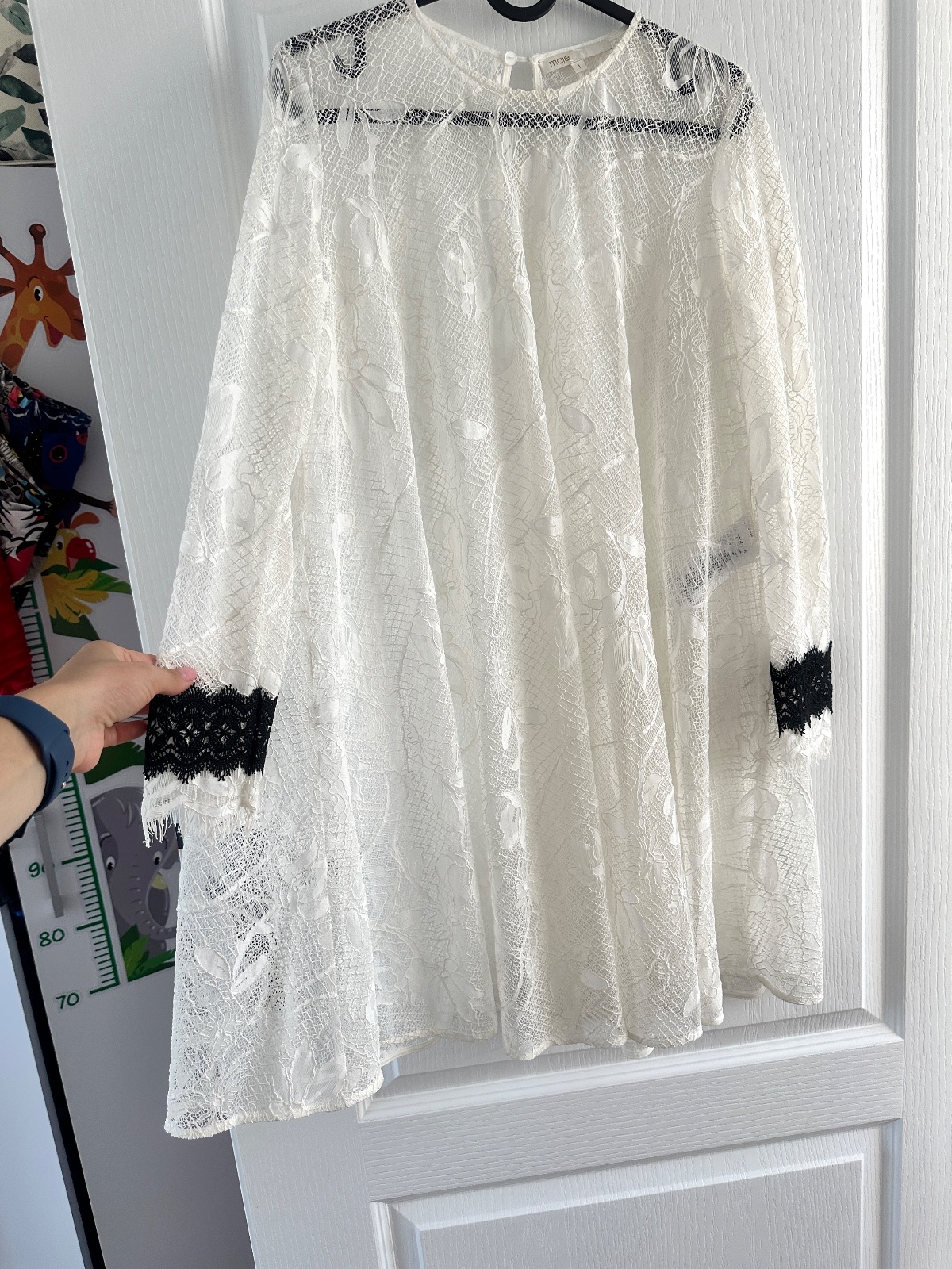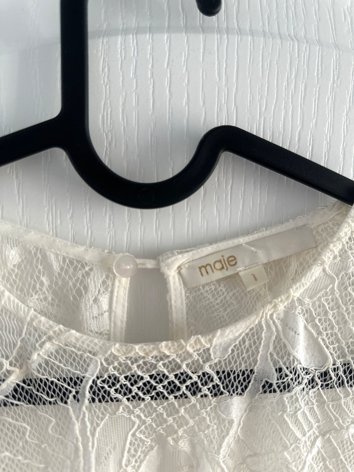 Čipkované šaty francúzskej značky Maje v krásnej krémovej farbe. Majú dlhé rukávy s ozdobnou čiernou čipkou, okrúhly výstrih a zapínanie na chrbte. Sú vyrobené z kruhového strihu, ktorý vytvára áčkový strih. Krásne padnú na postavu. Sú perfektným outfitom na Štedrý deň, Silvestra alebo karnevalovú párty. Šaty pôvodne mali čiernu spodničku s úzkymi ramienkami. Môžete si ich kúpiť v obchode s bielizňou. Štítok uvádza francúzsku veľkosť 1, čo zodpovedá veľkosti S; všetky miery sú uvedené na fotografiách.