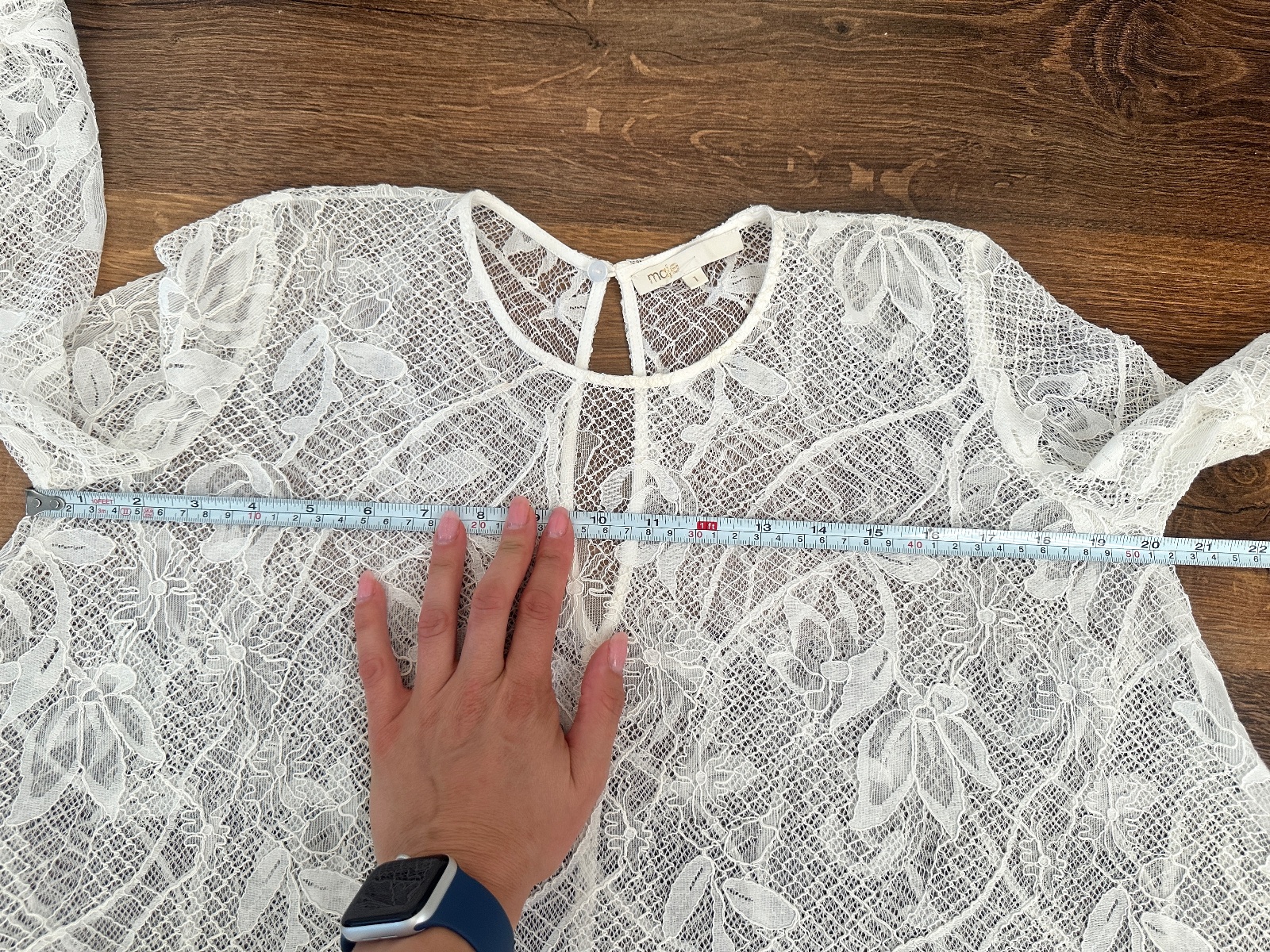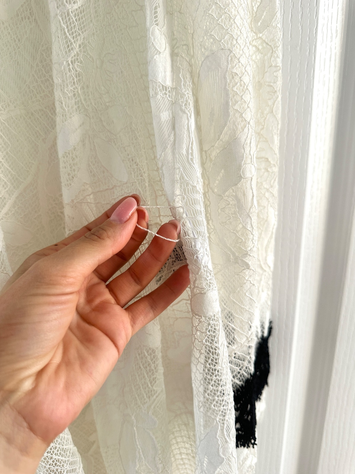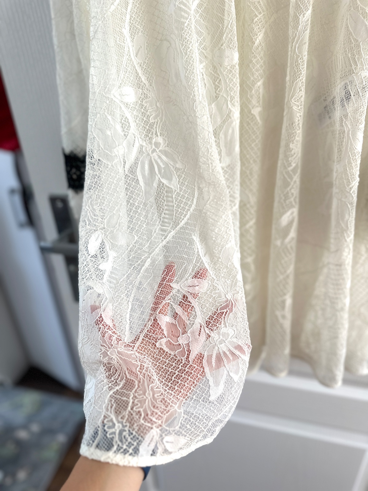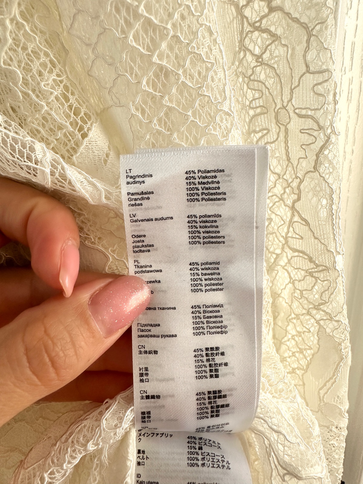 Čipkované šaty francúzskej značky Maje v krásnej krémovej farbe. Majú dlhé rukávy s ozdobnou čiernou čipkou, okrúhly výstrih a zapínanie na chrbte. Sú vyrobené z kruhového strihu, ktorý vytvára áčkový strih. Krásne padnú na postavu. Sú perfektným outfitom na Štedrý deň, Silvestra alebo karnevalovú párty. Šaty pôvodne mali čiernu spodničku s úzkymi ramienkami. Môžete si ich kúpiť v obchode s bielizňou. Štítok uvádza francúzsku veľkosť 1, čo zodpovedá veľkosti S; všetky miery sú uvedené na fotografiách.