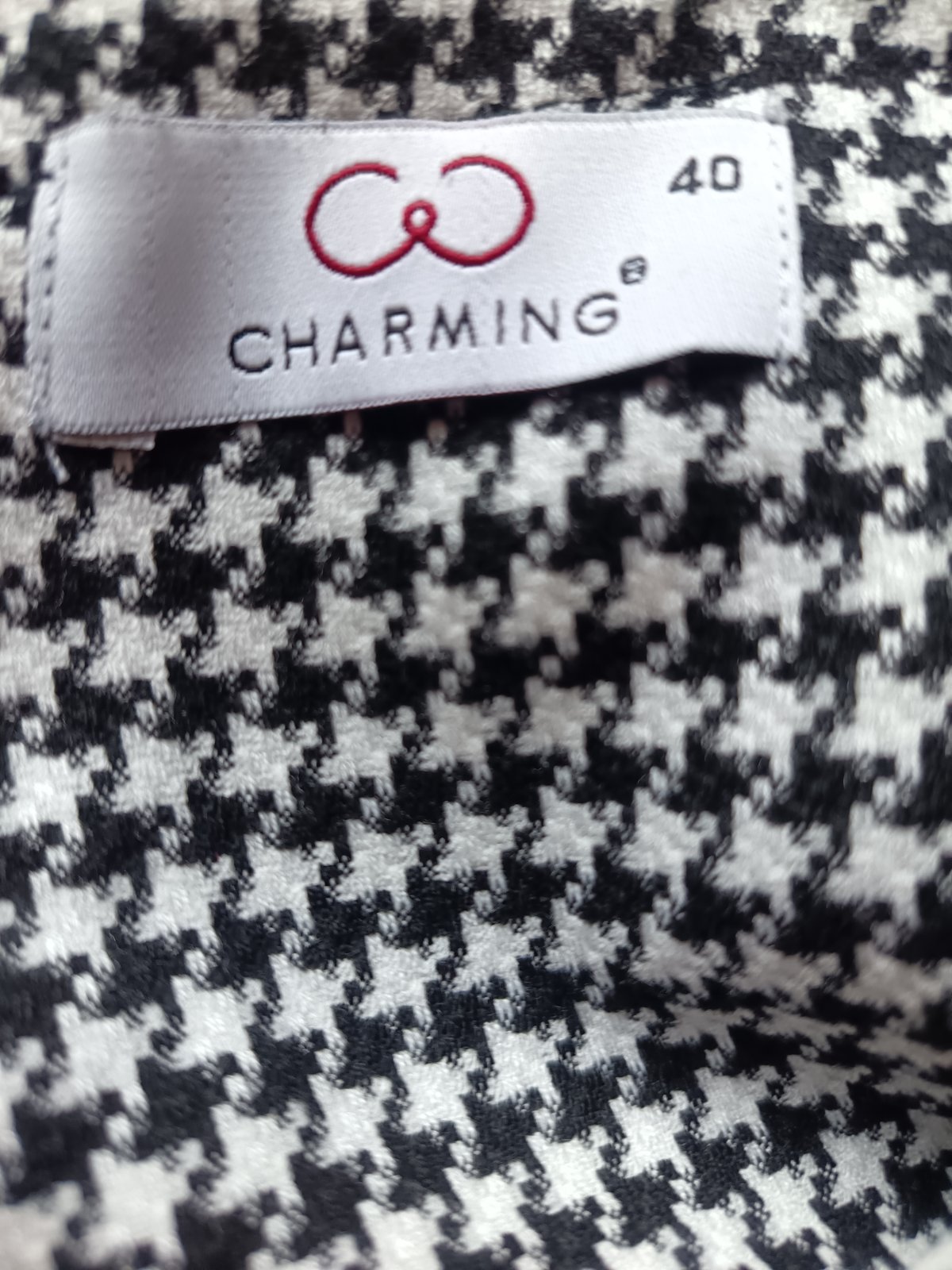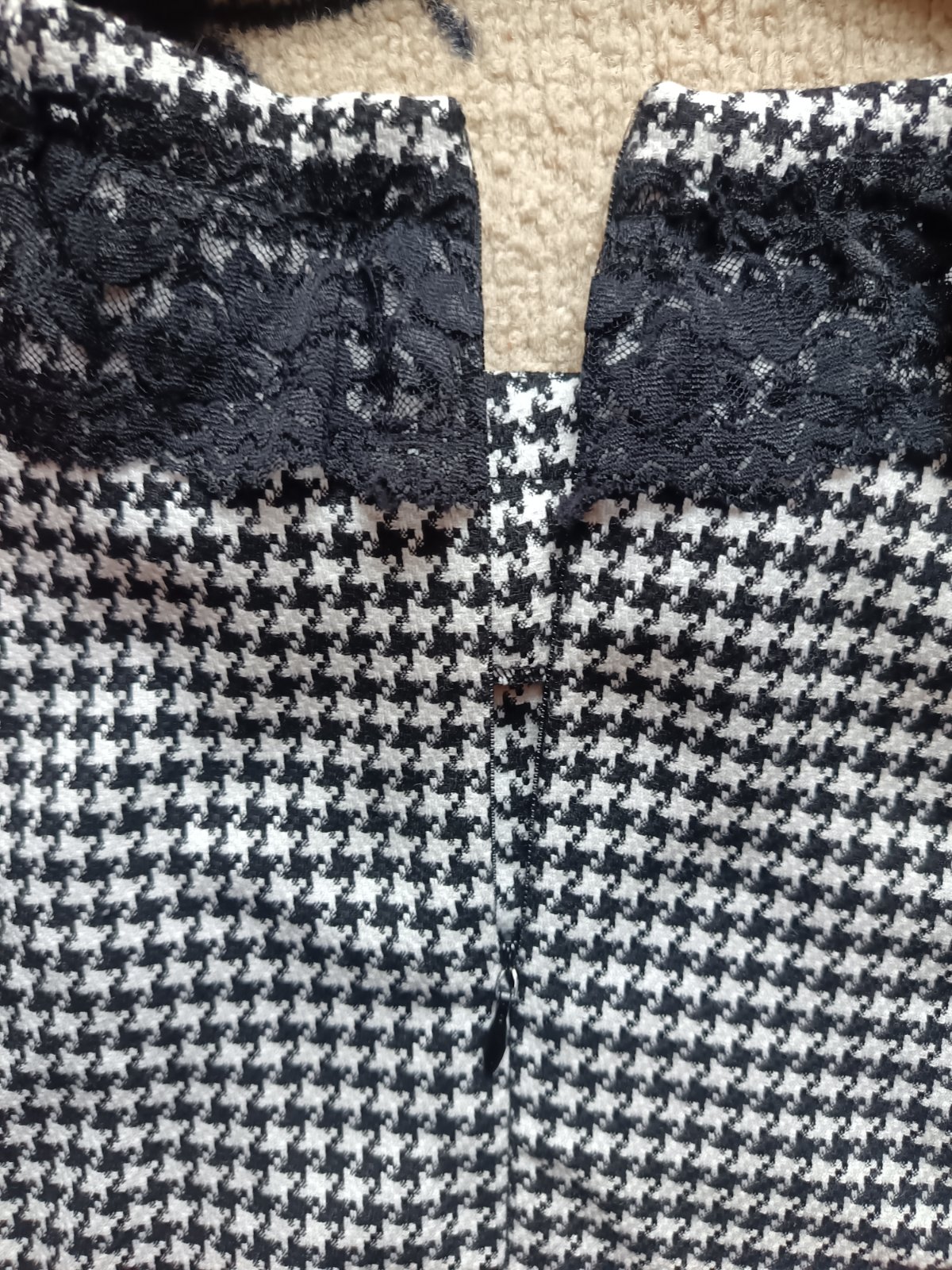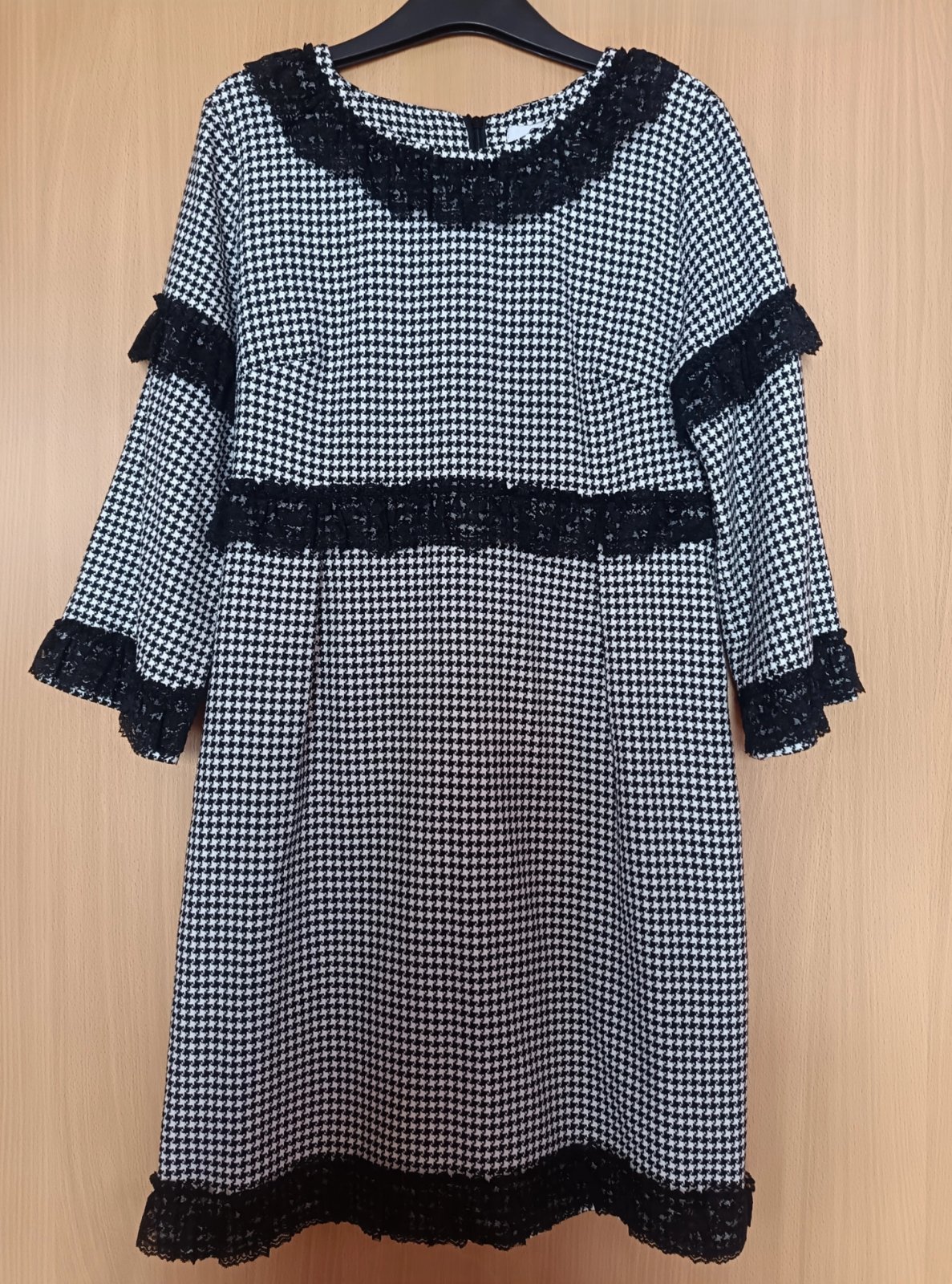 Predám krásne čierno-biele šaty s jemným károvaným vzorom a elegantnými čipkovanými detailmi. Majú 3/4 rukávy, čipku okolo výstrihu, na rukávoch, v páse a na spodnom leme, čo im dodáva veľmi ženský a štýlový vzhľad.