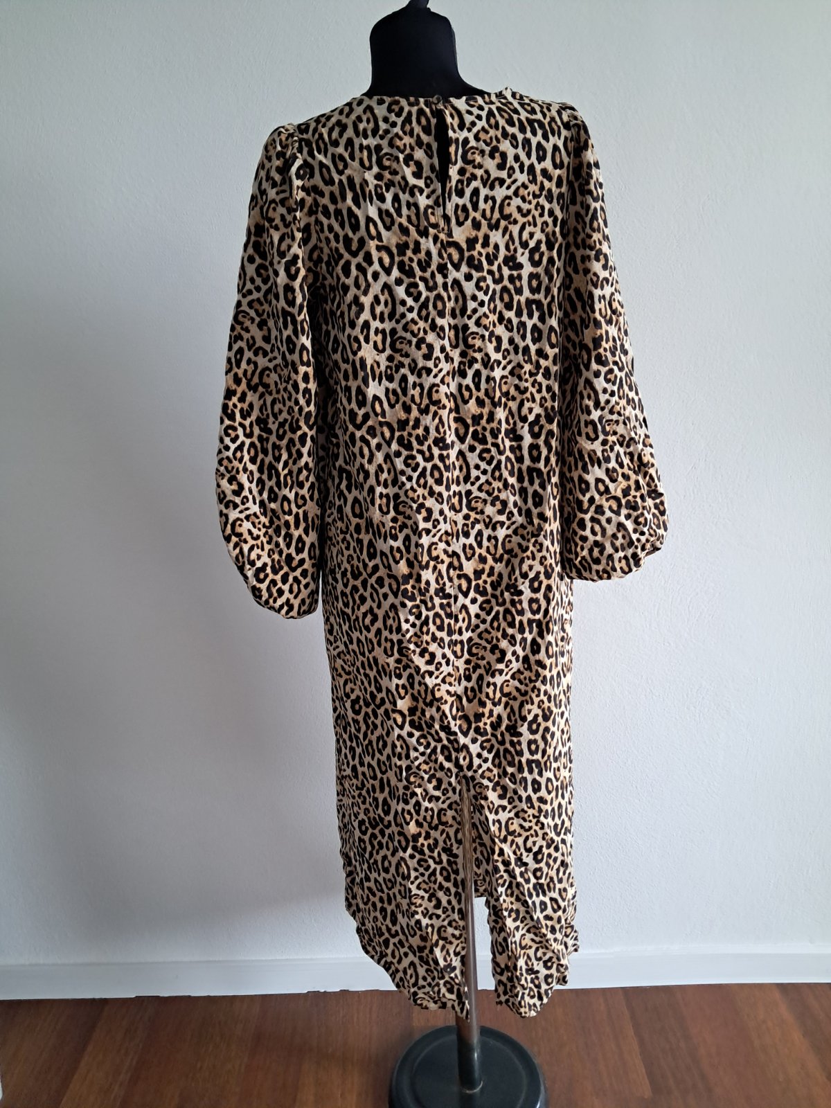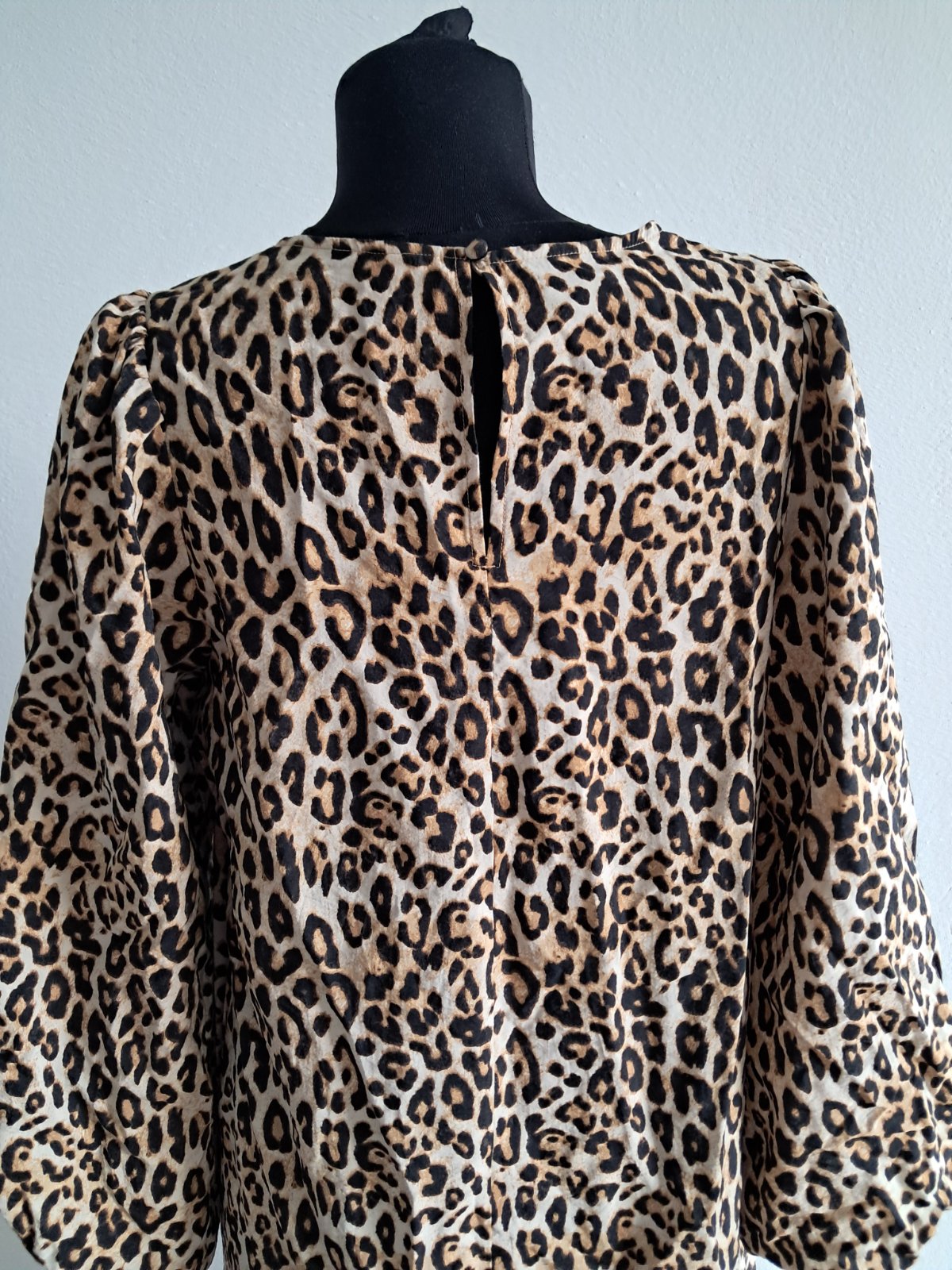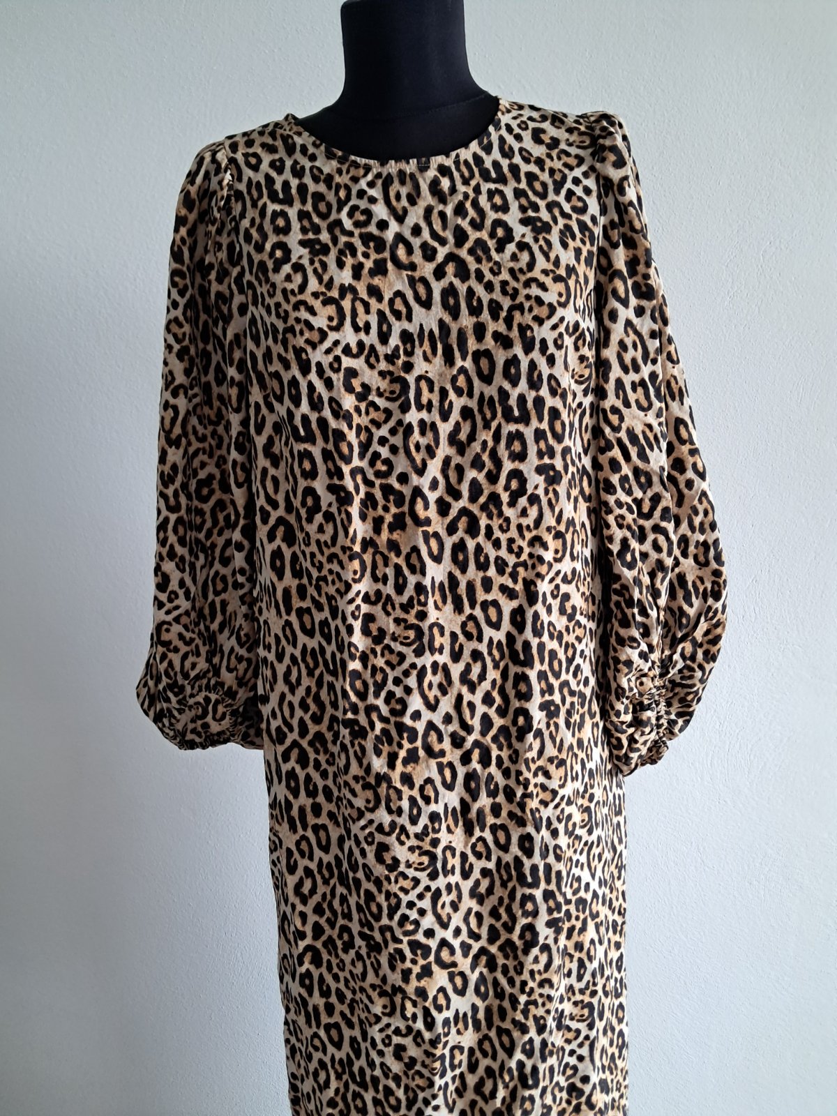 H&M saty s leopardim vzorom, ako nove, nariasené rukávy ukončené gumičkou, rozmery: d. 124cm, s. 2x 51cm, dl.rukava 49cm